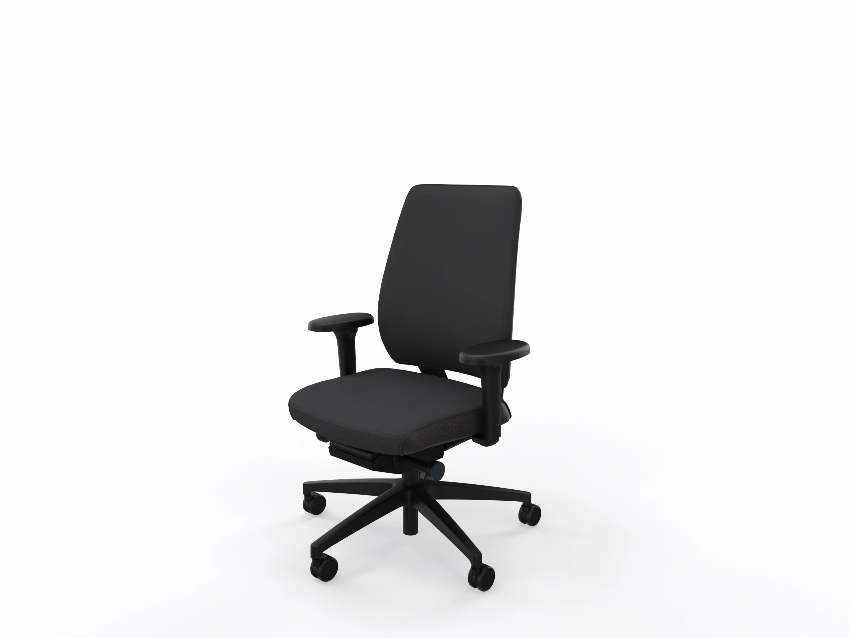 Standaard met: Synchroon mechaniek met gewichtsregeling, 4D NPR armleggers (hoogte, 2x breedte, diepte verstebaar), Zithoogte-, Rughoogte & Zitdiepteverstelling, Verstelbare lendensteun, Universele wielen. Volledig zwart.