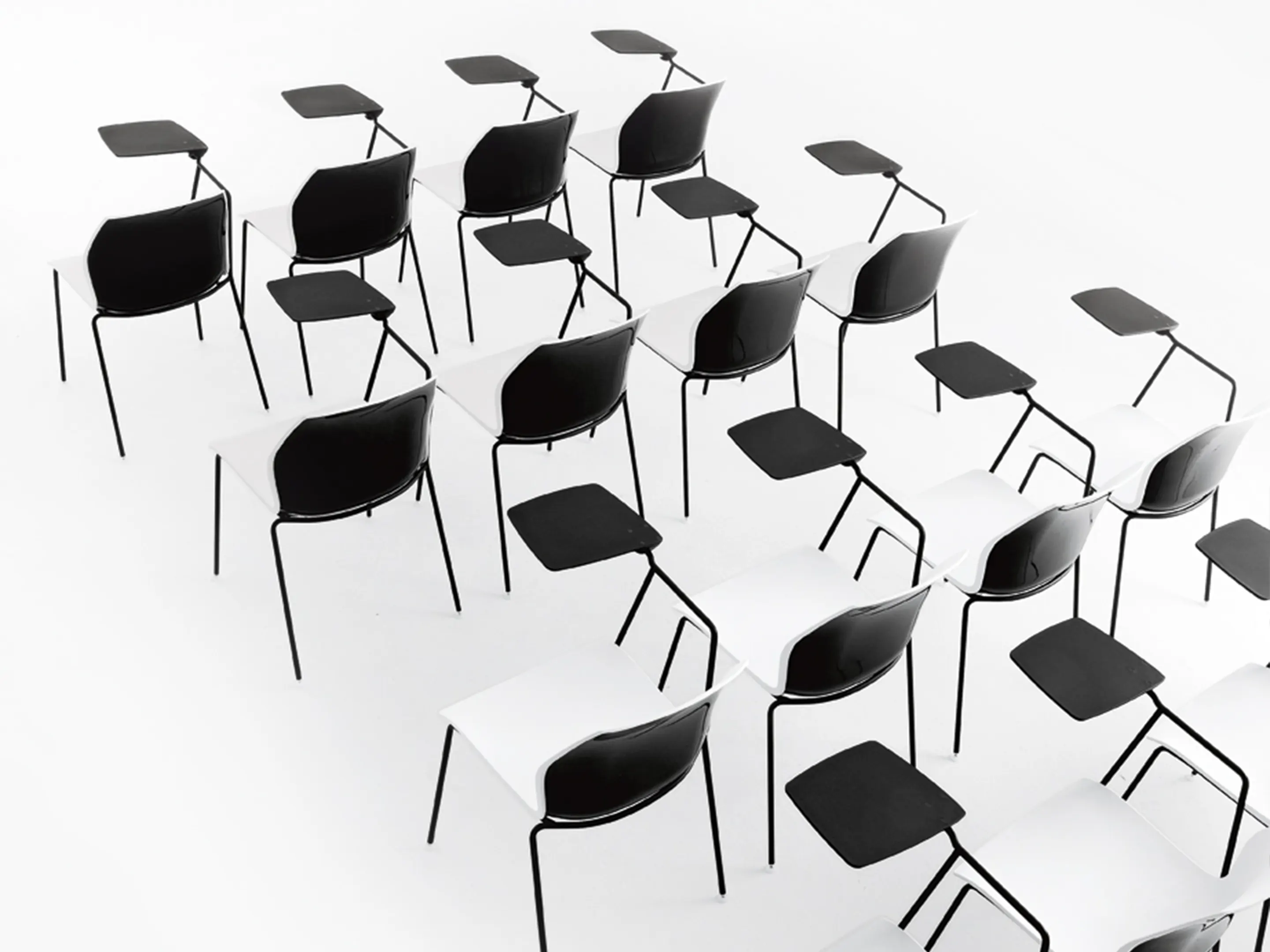 Stoel met een polypropyleen kuip op een 4-poots frame op glijders. Inclusief armlegger rechts met schrijftafel. Stapelbaar tot 6 stuks zowel zonder als op trolley.