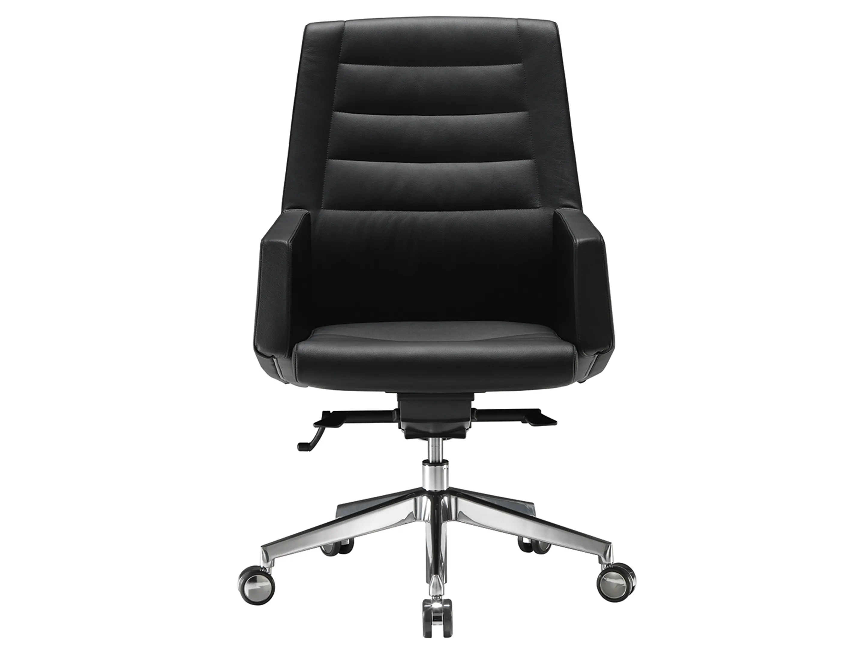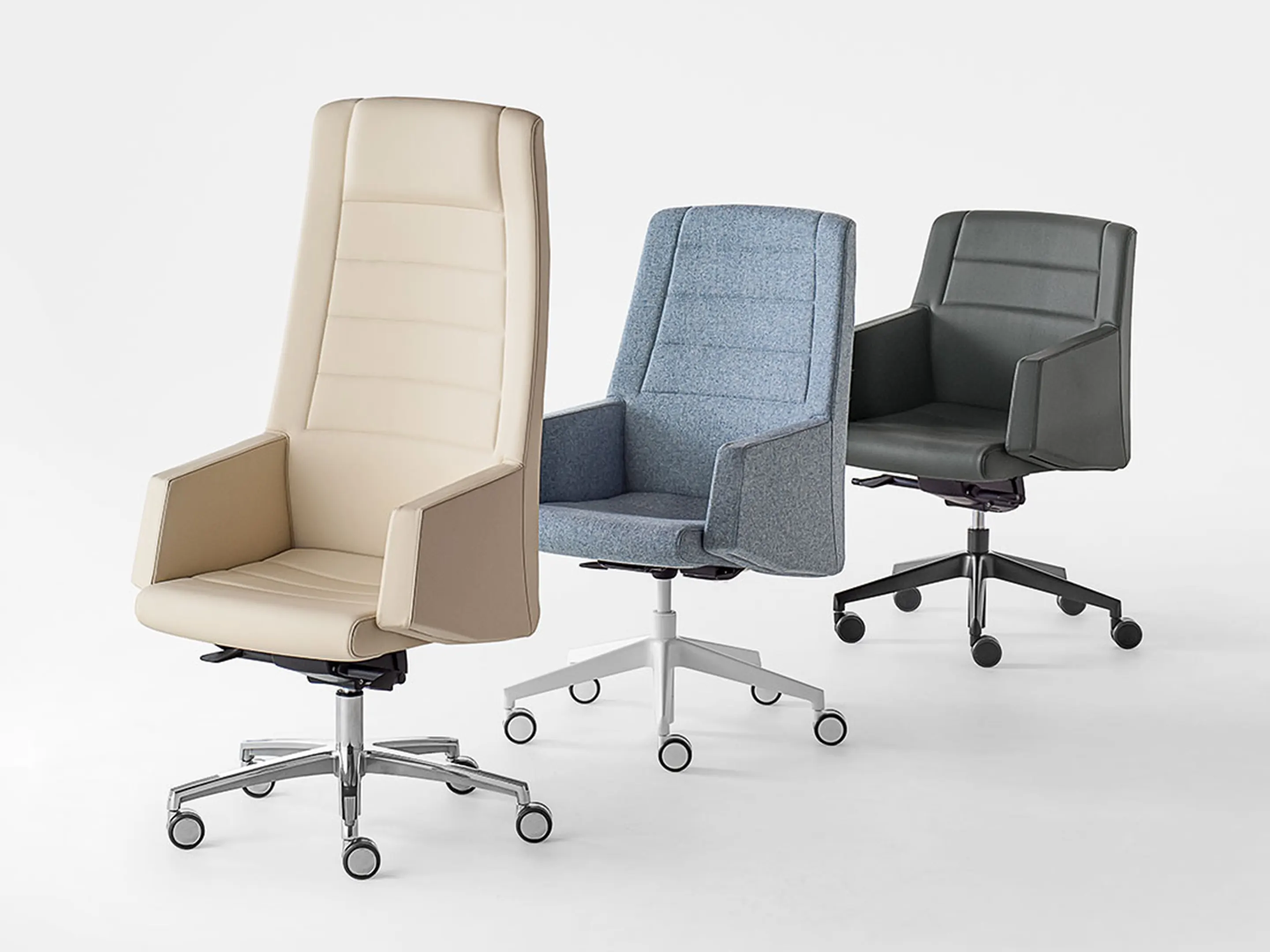 Vergaderstoel met een hoge rug, volledig gestoffeerd op een 5-teens kruis op wielen. Draaibaar, hoogte-instelbaar.