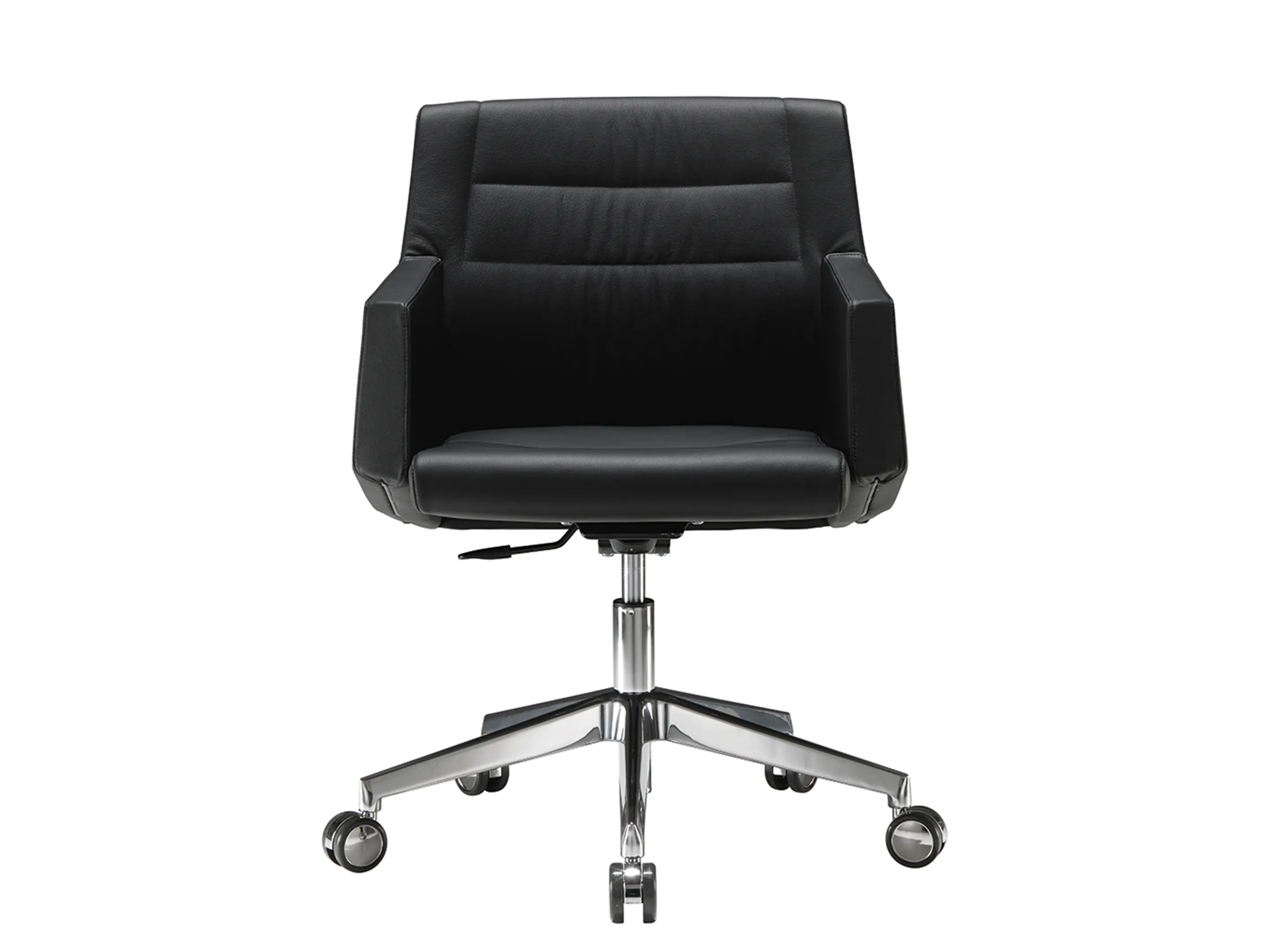 Vergaderstoel met een medium rug, volledig gestoffeerd op een 5-teens kruis op wielen. Draaibaar, hoogte-instelbaar.