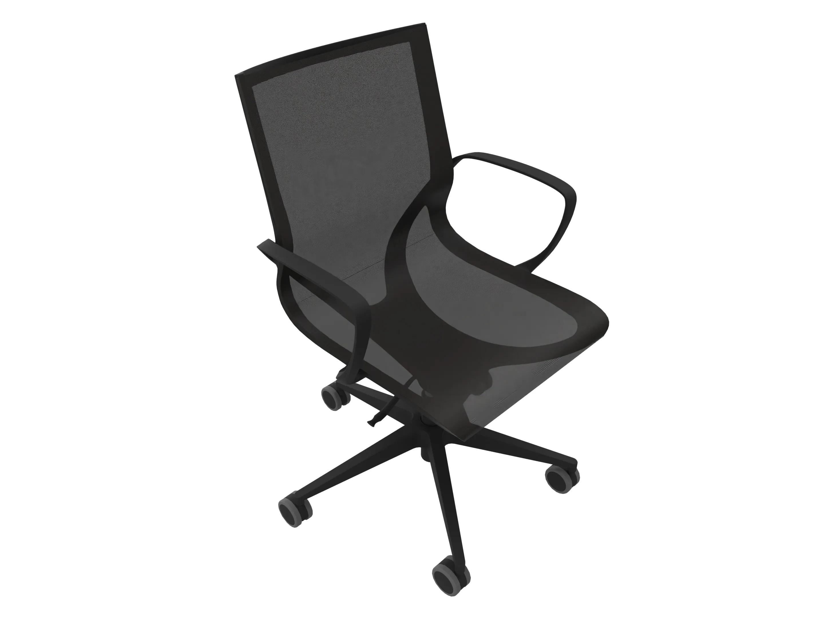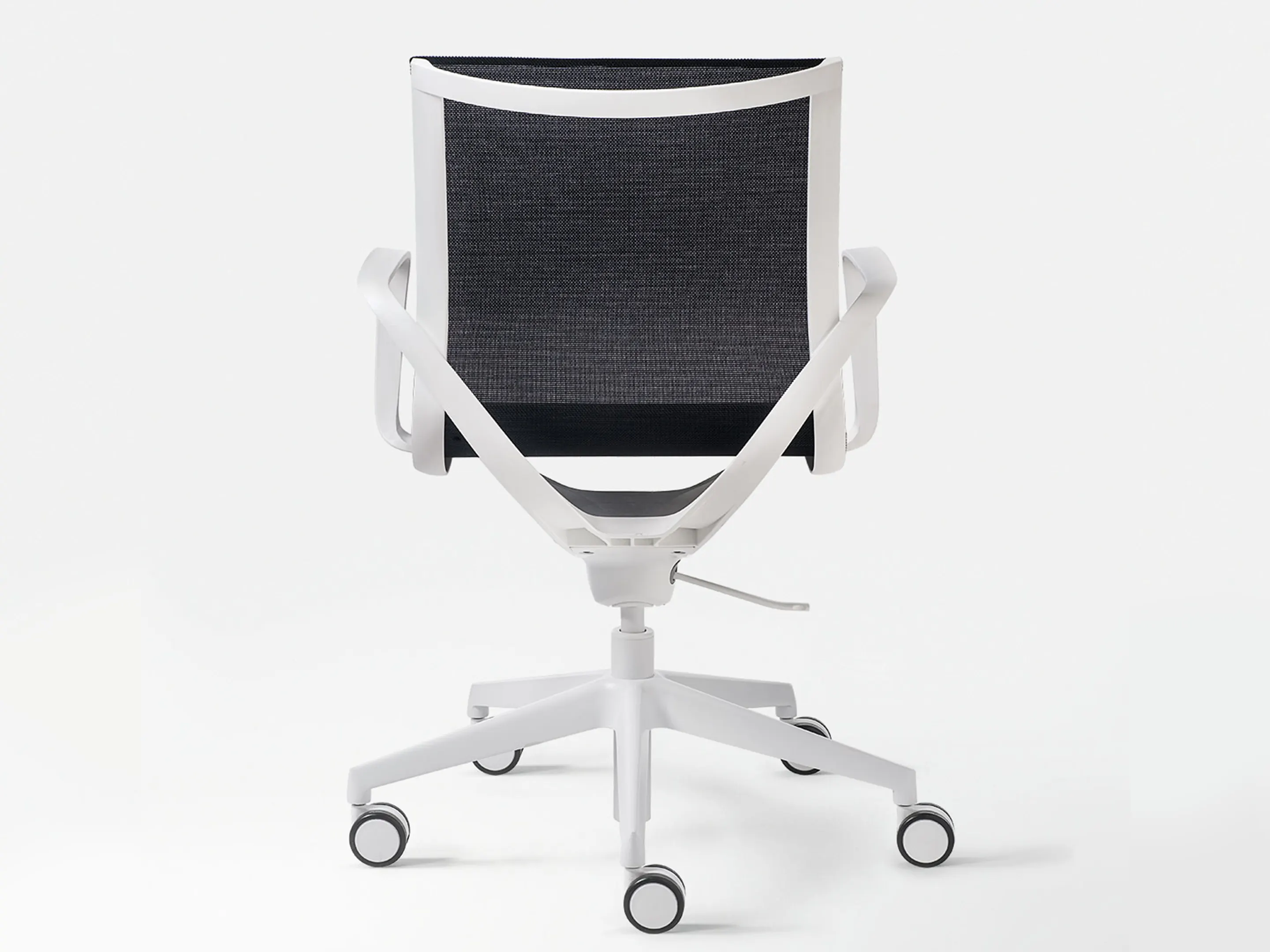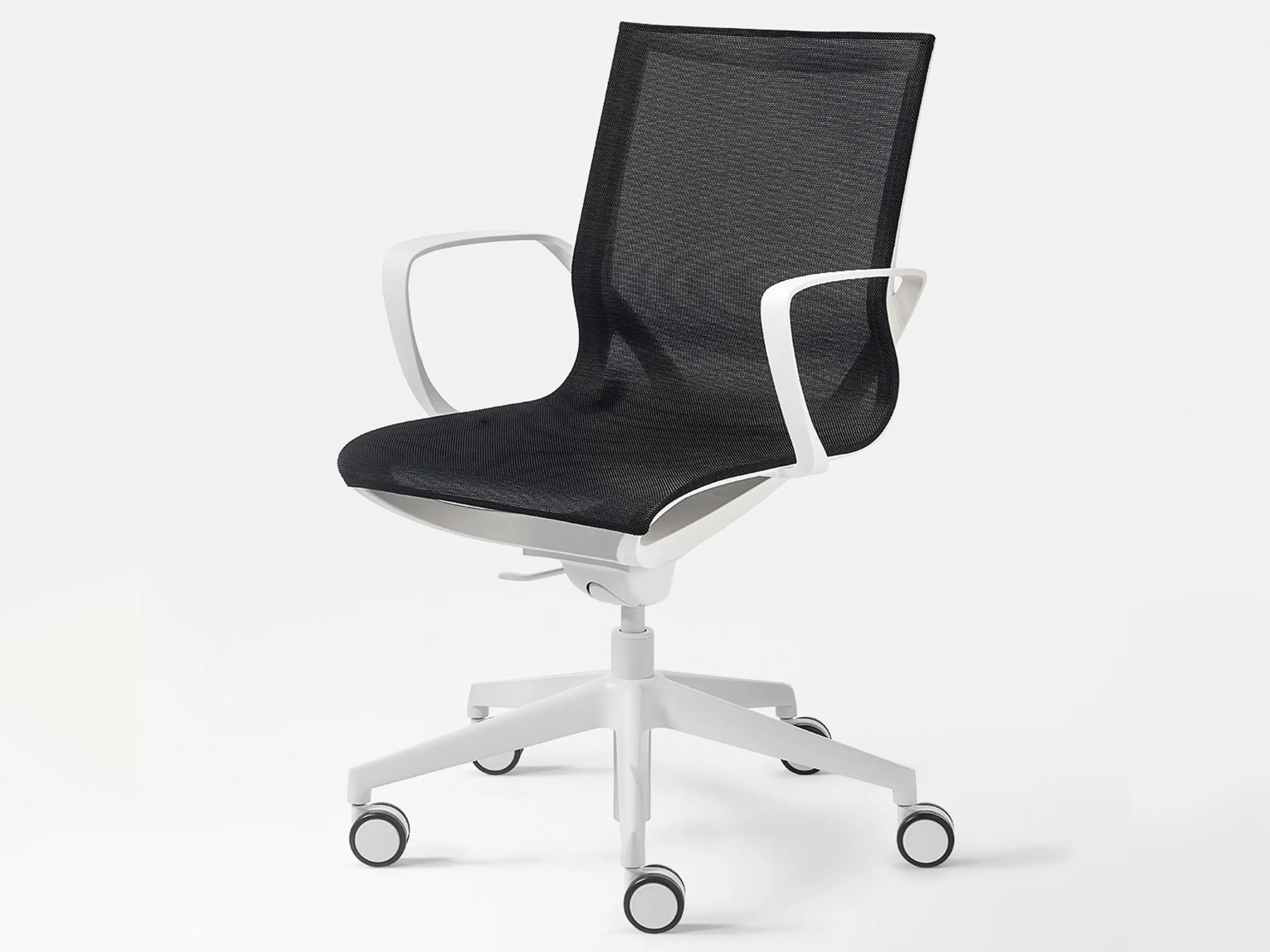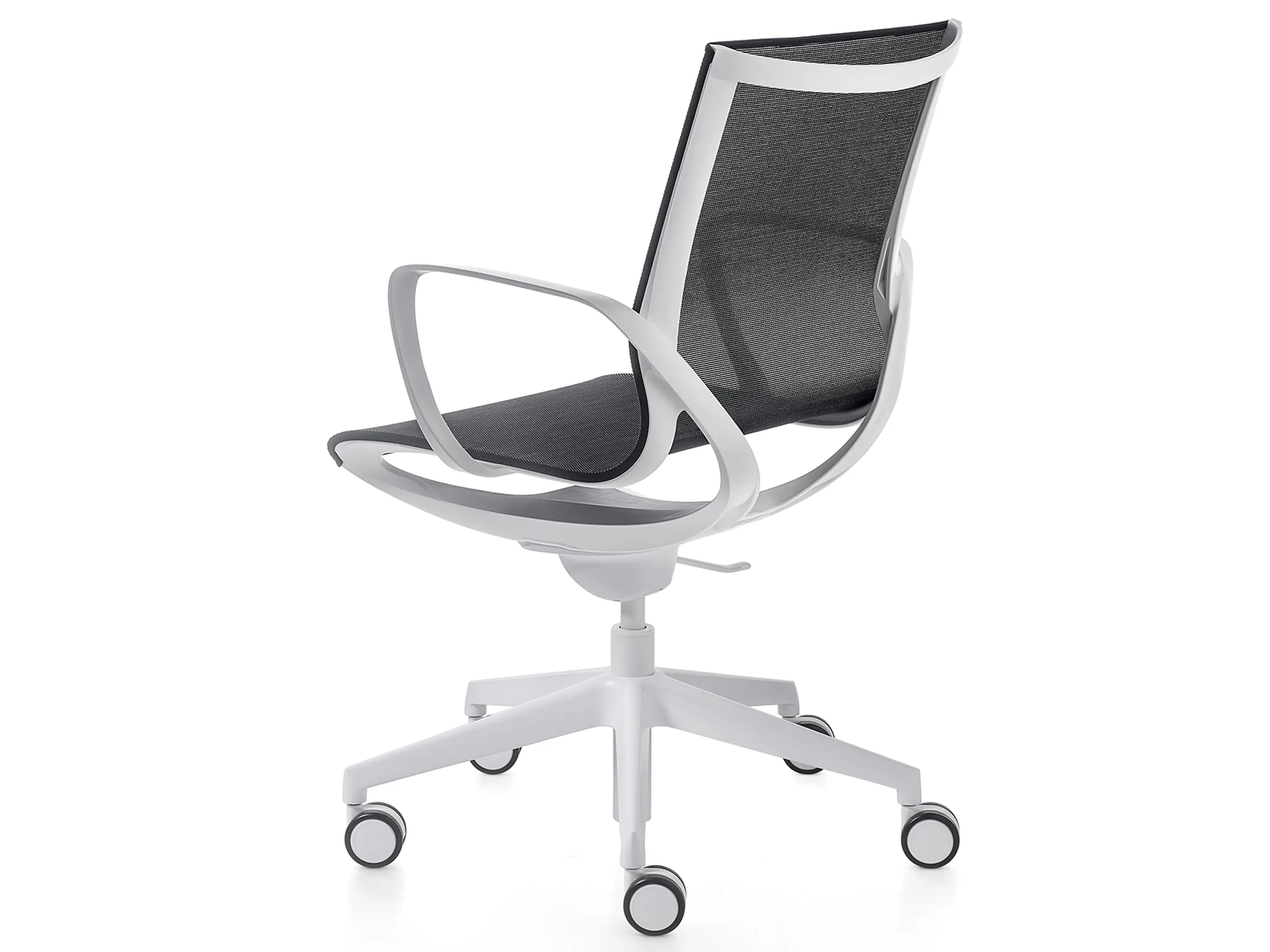 Bureaustoel met een gekleurde mesh rug op een 5-teens kruis op wielen. Hoogte-instelbaar, excl. armleggers.