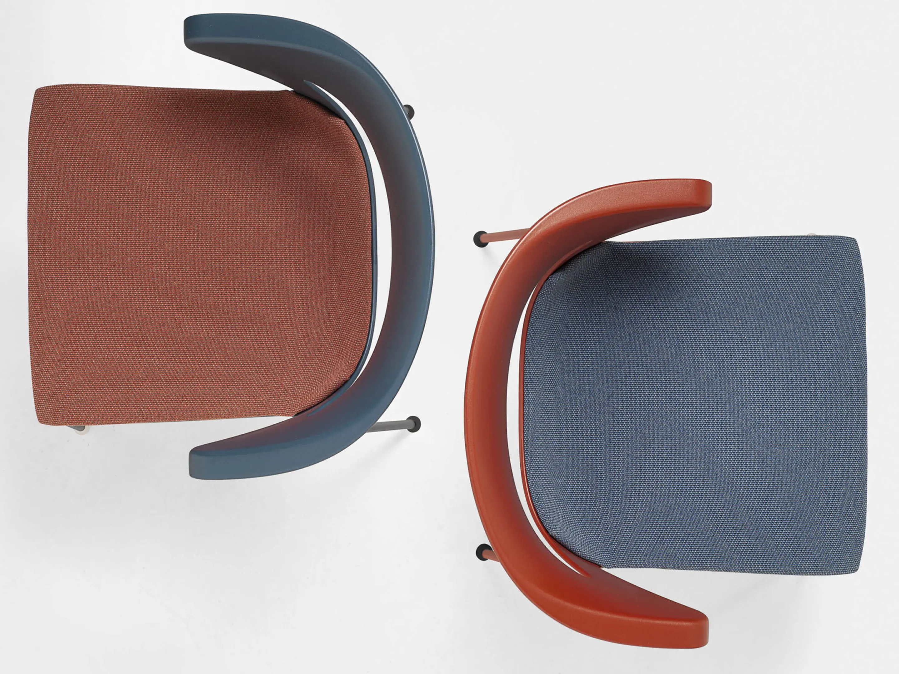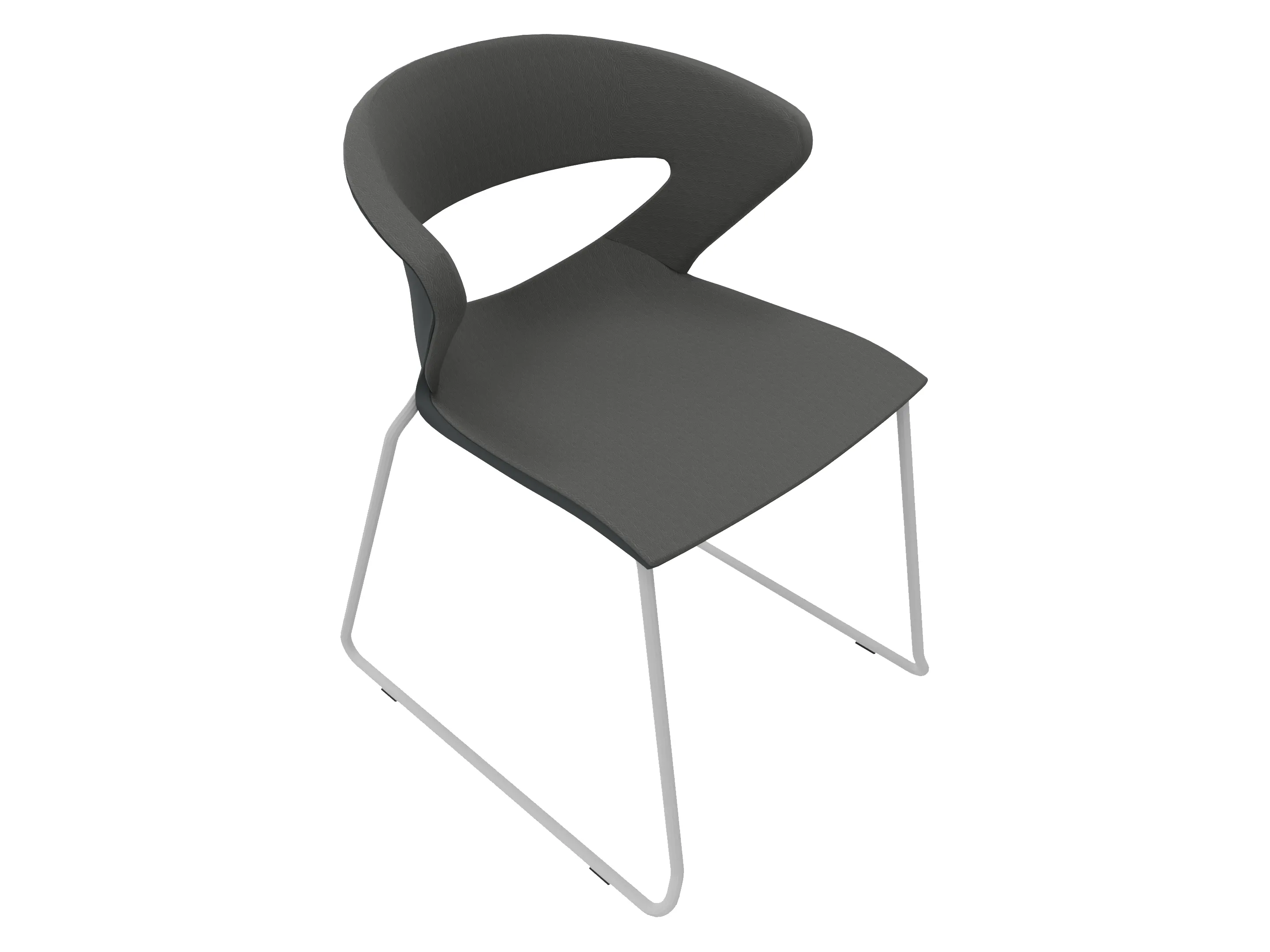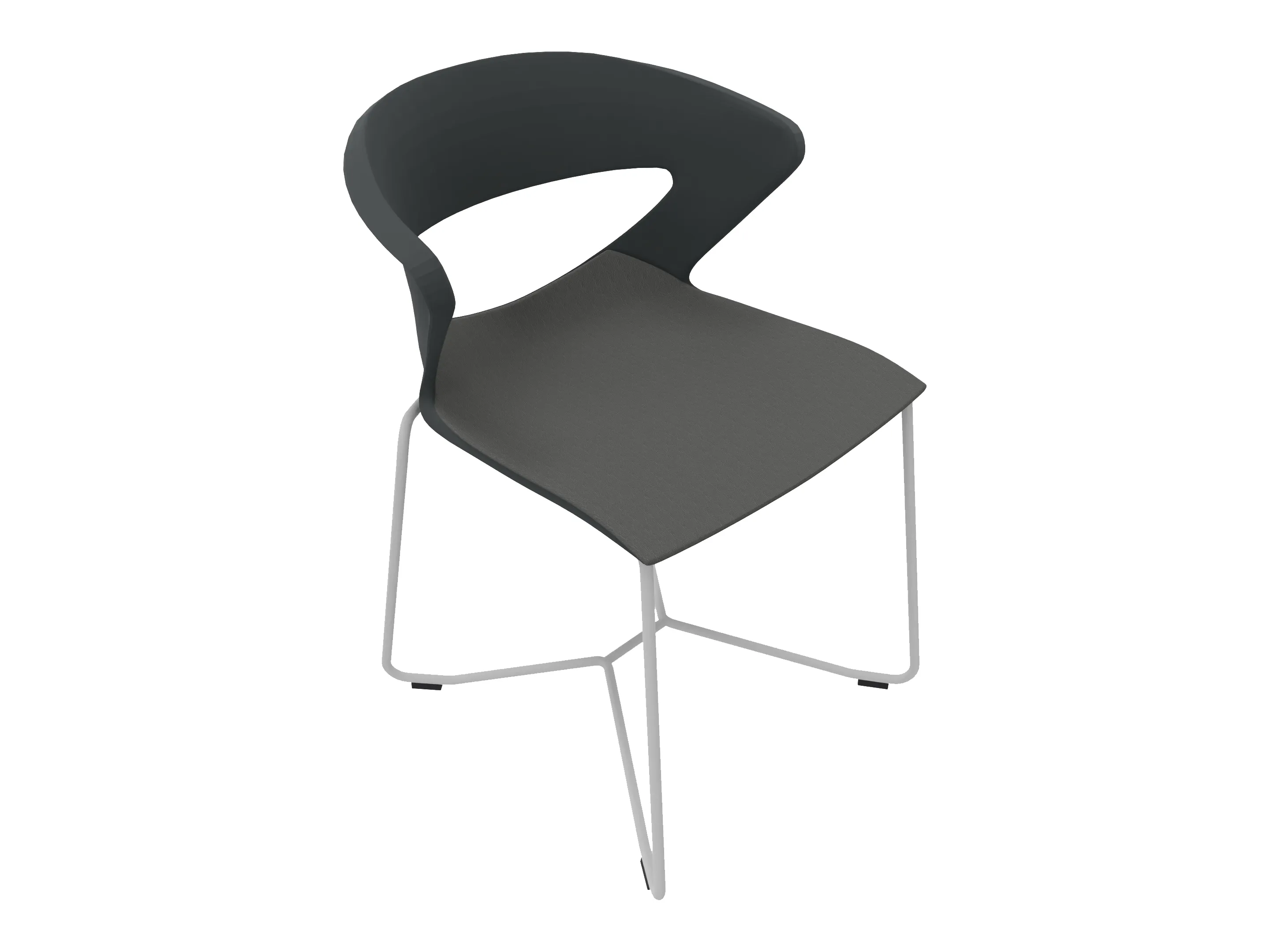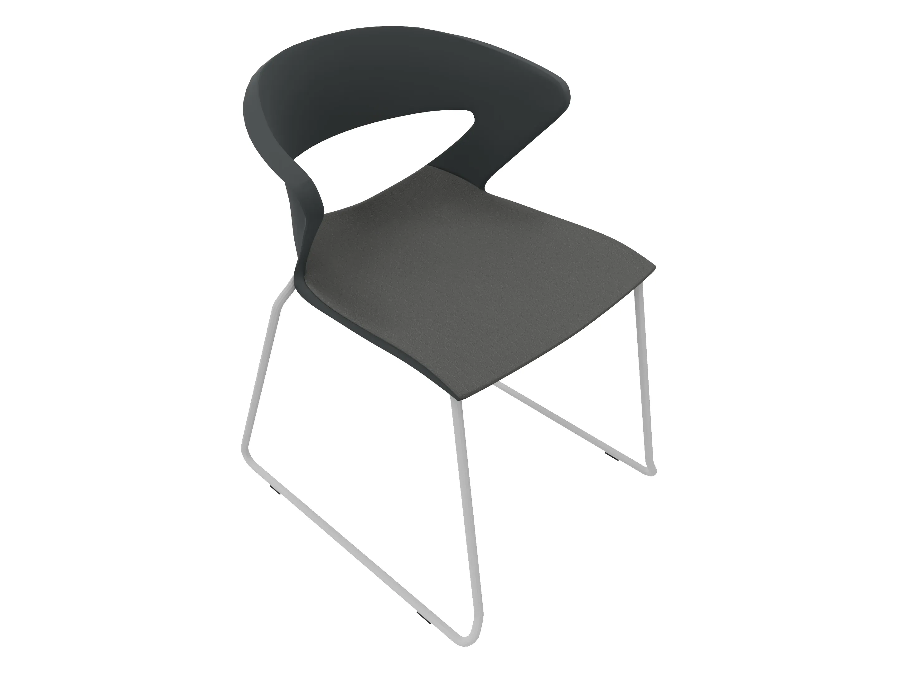 Stoel met een polypropyleen kuip met opdekstoffering op de zitting op een sledeframe op glijders. Stapelbaar tot 4 stuks met gebruik van een onderzitting zowel zonder als op trolley.