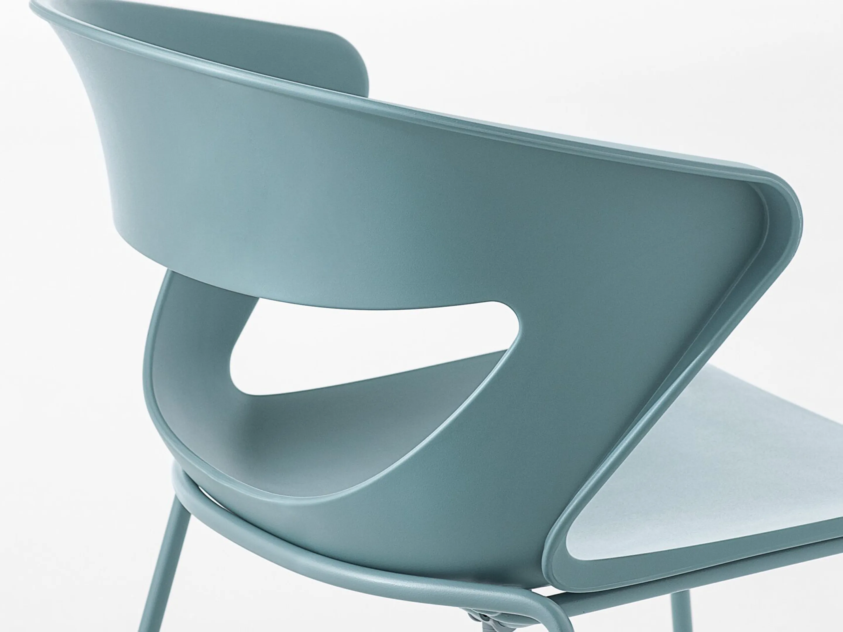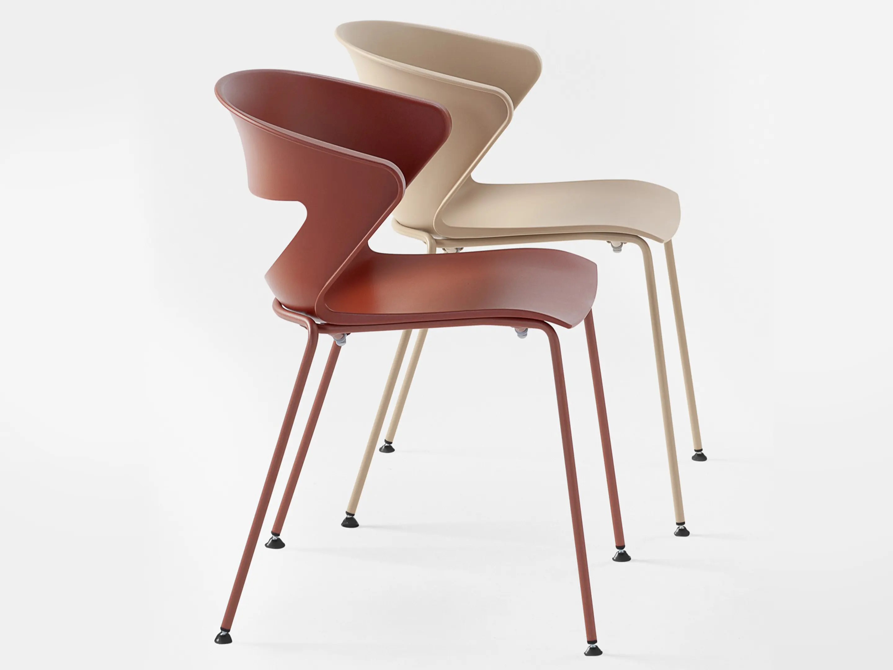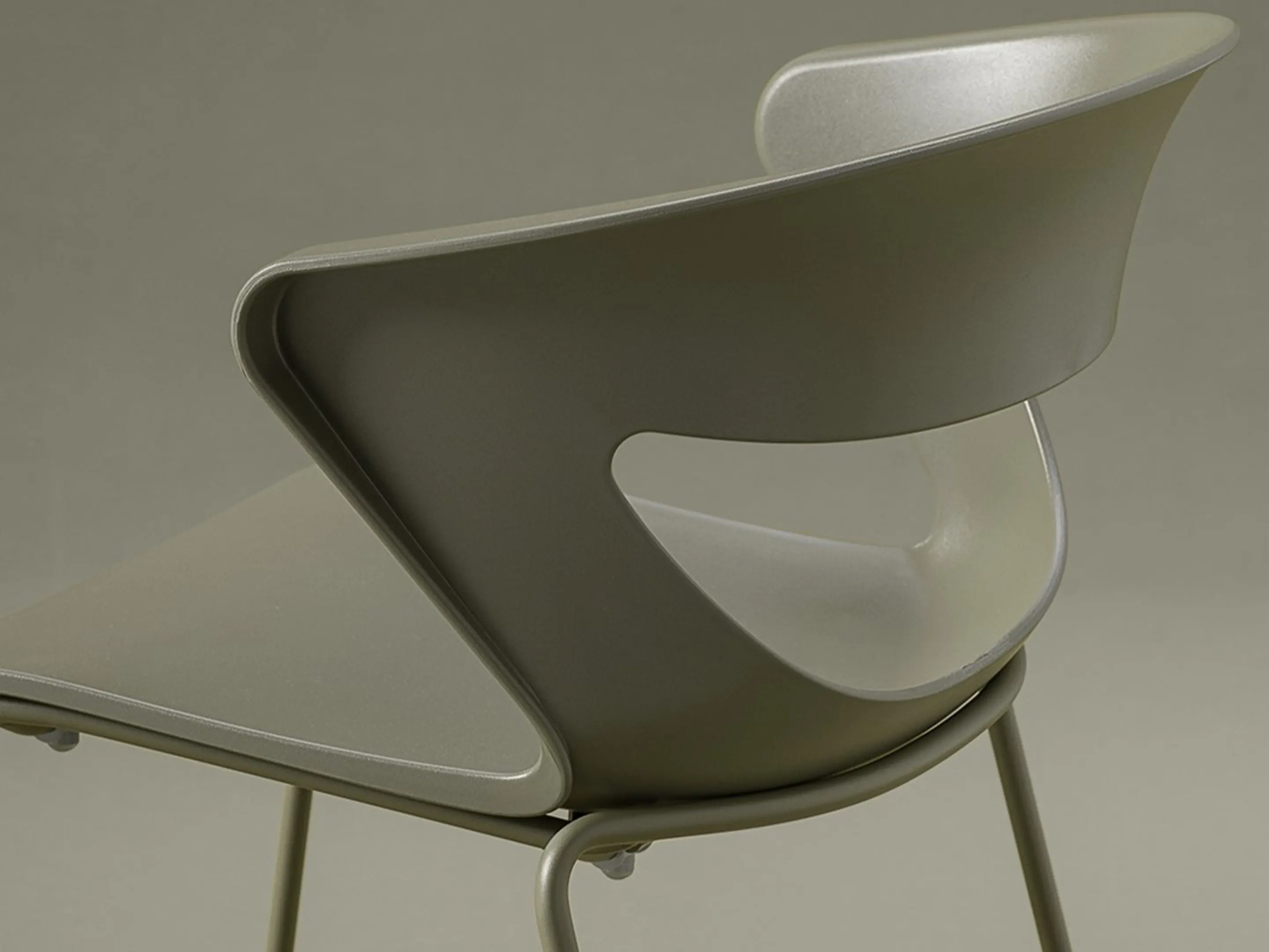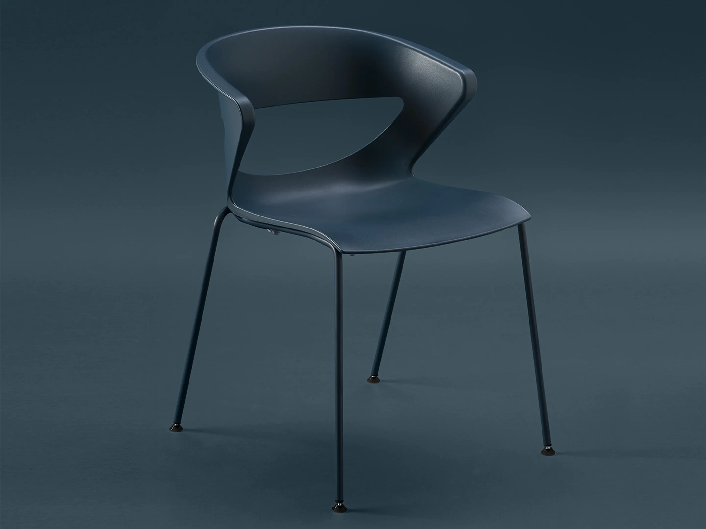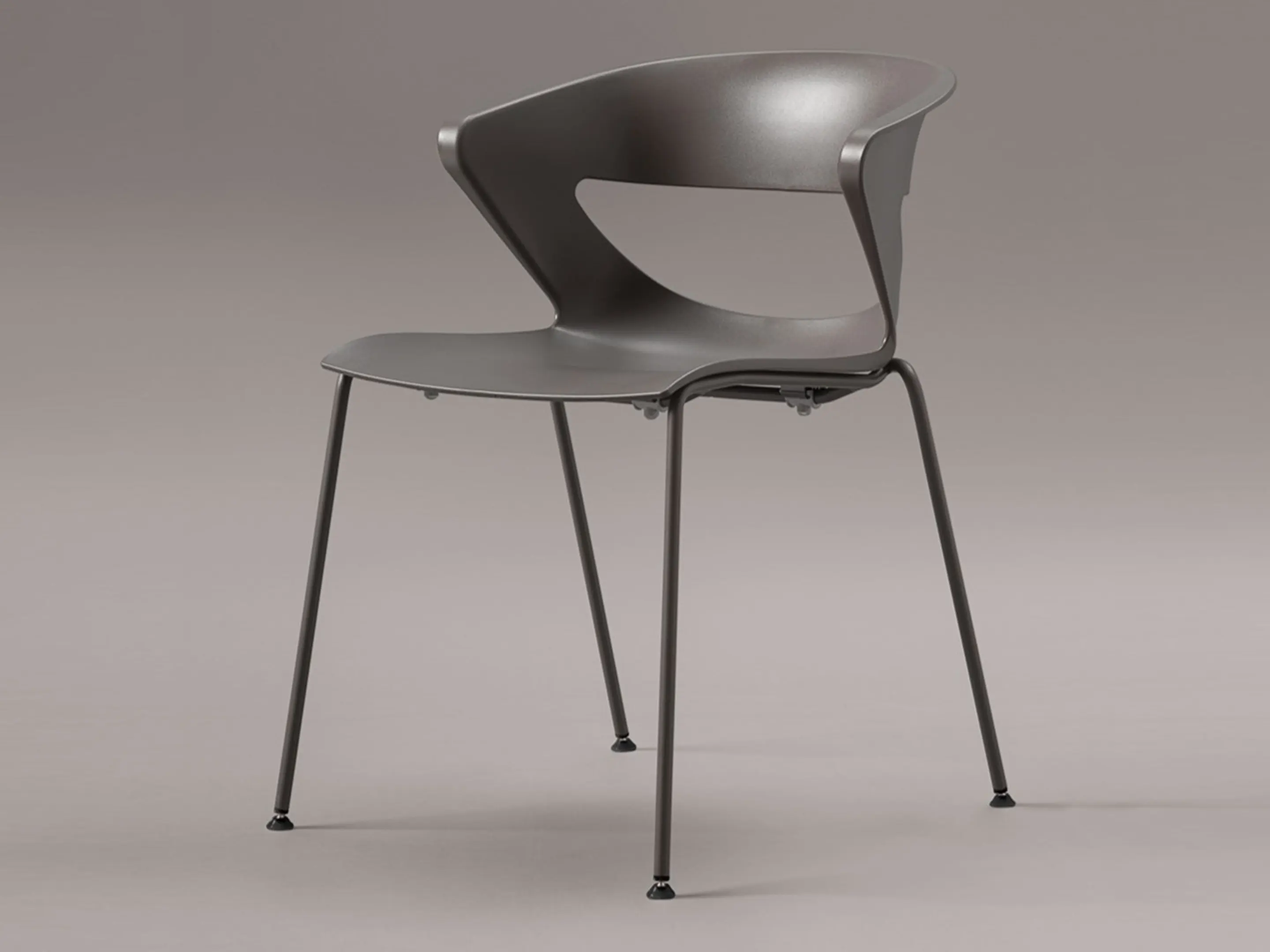 Stoel met een polypropyleen kuip op een 4-poots frame op glijders. Stapelbaar tot 8 stuks zonder trolley of 10 stuks op trolley.