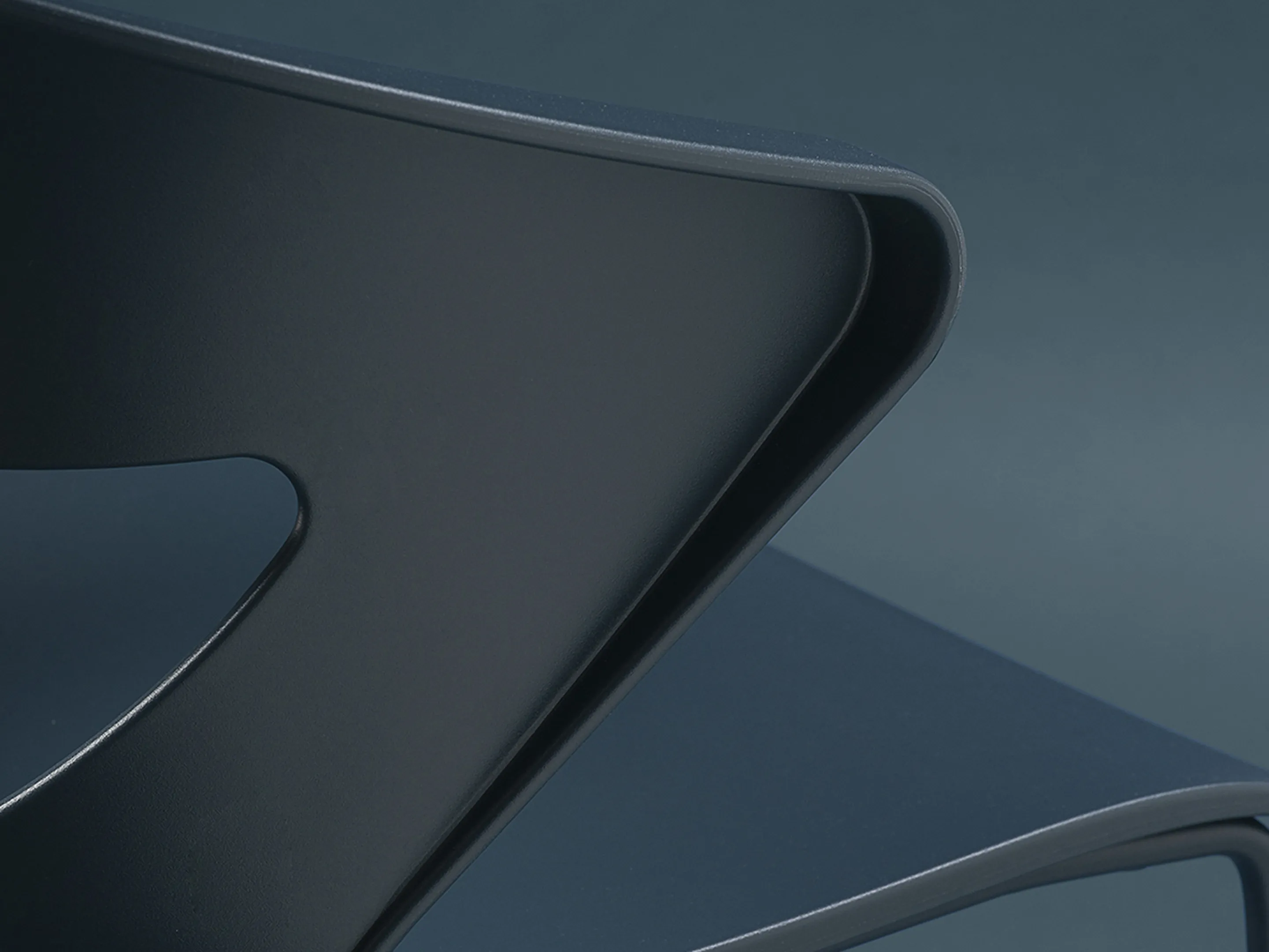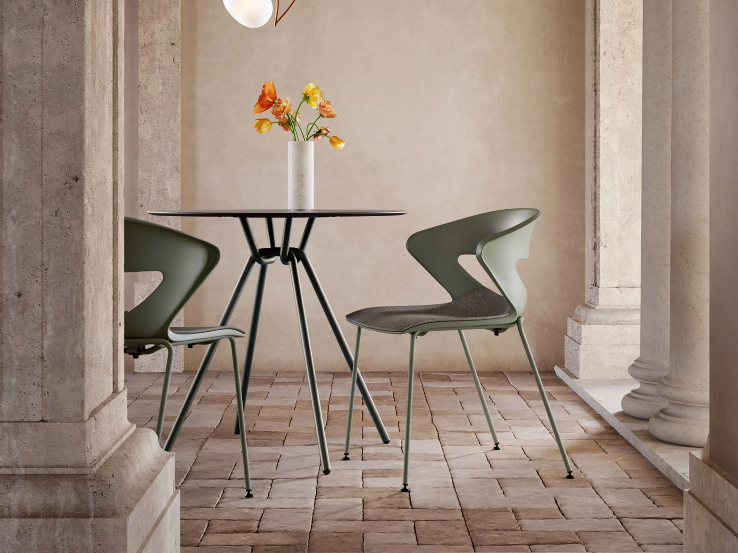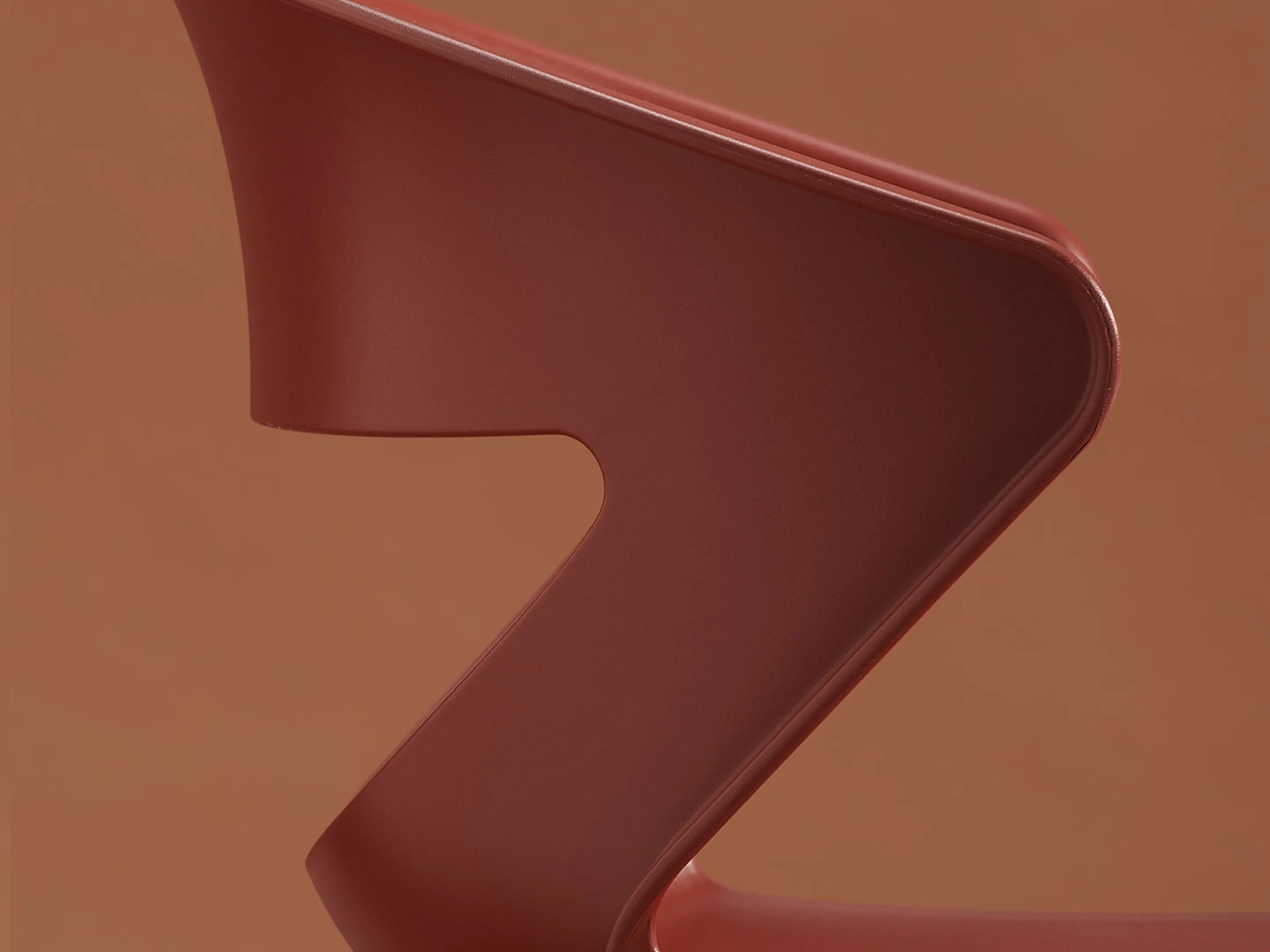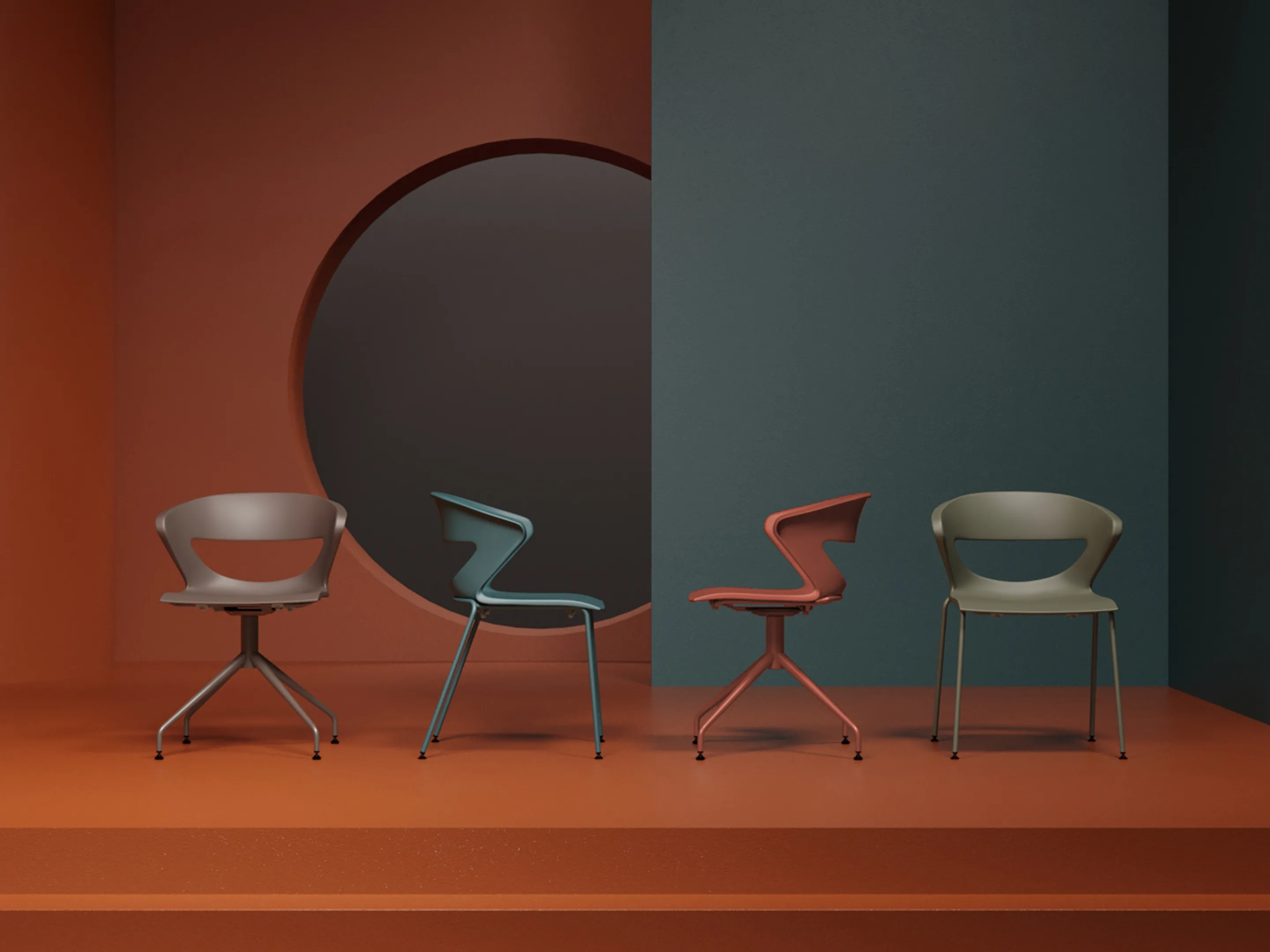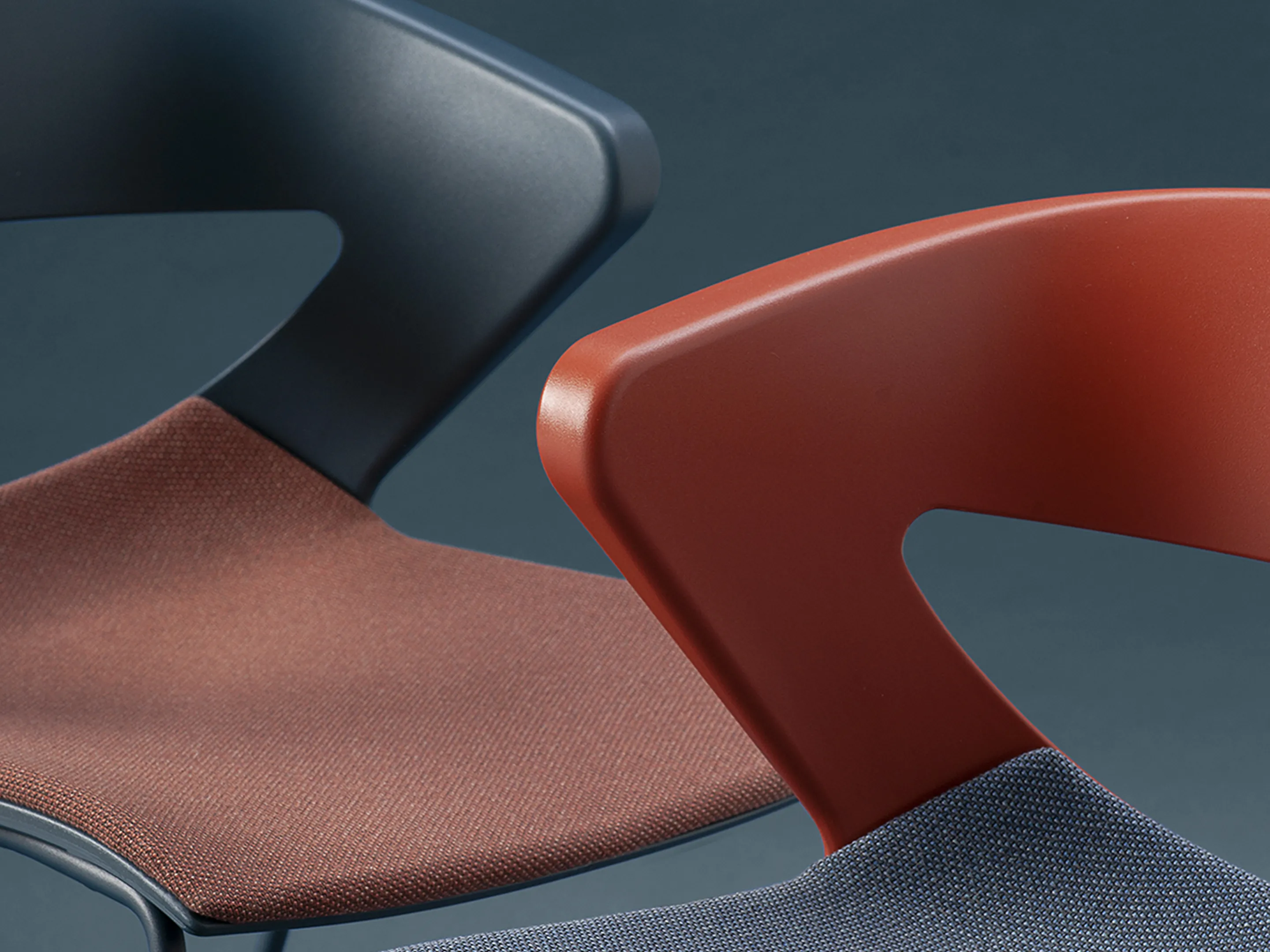 Stoel met een polypropyleen kuip met opdekstoffering op de zitting en rugleuning op een sledeframe op glijders. Stapelbaar tot 3 stuks met gebruik van een onderzitting zonder trolley en tot 4 stuks met gebruik van een onderzitting en trolley.
