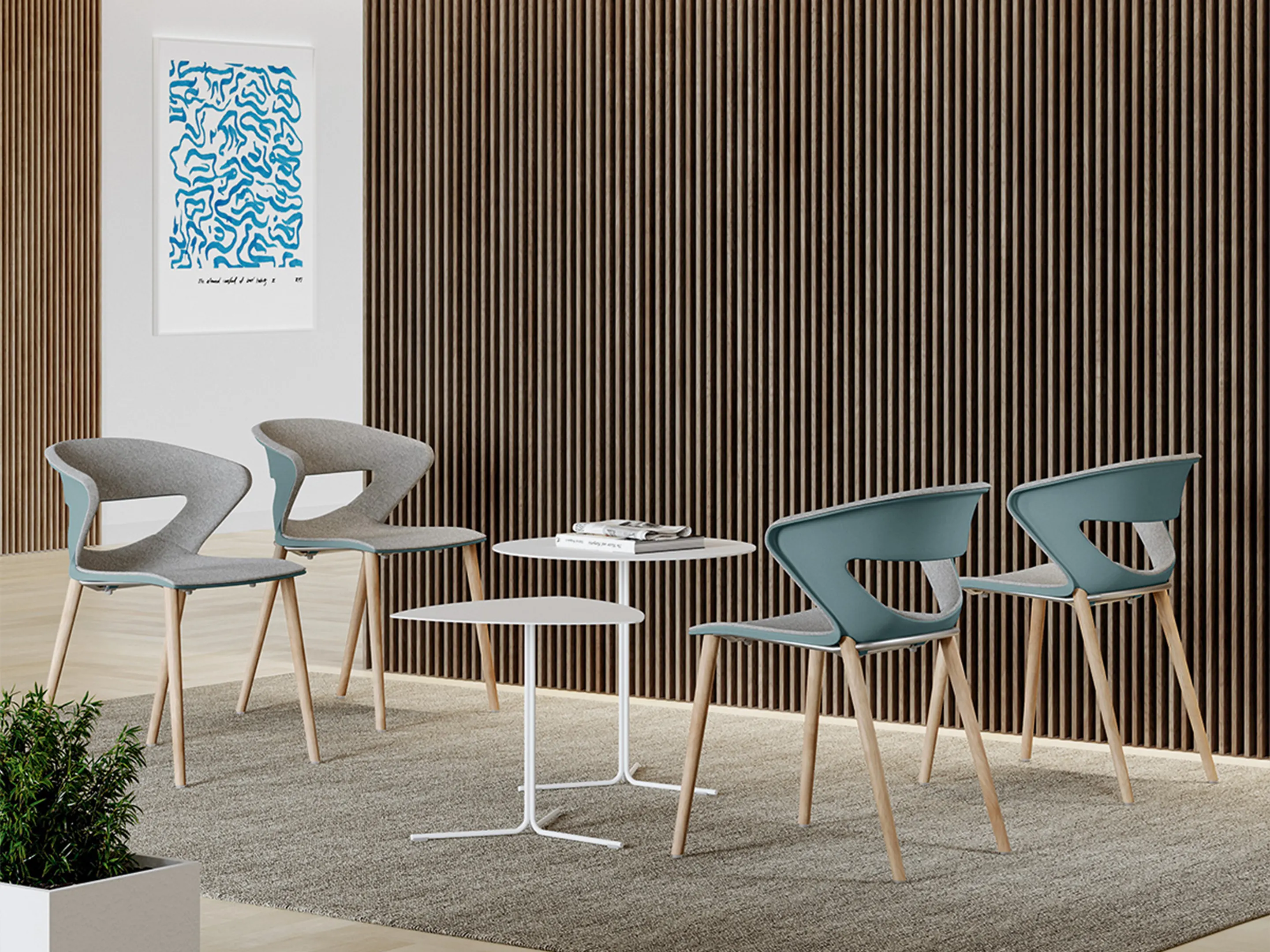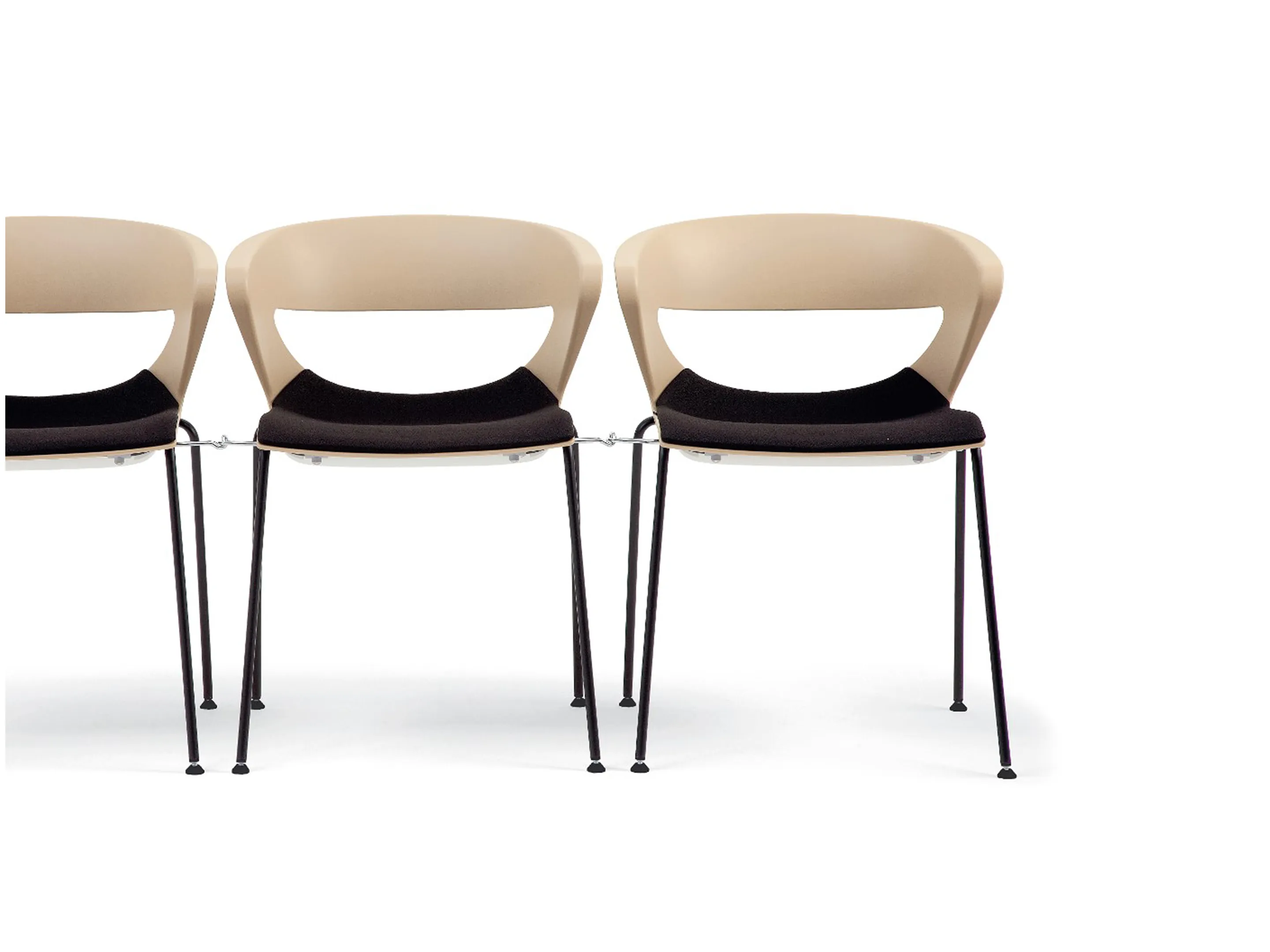 Stoel met een polypropyleen kuip met opdekstoffering op de zitting op een 4-poots frame op glijders. Stapelbaar tot 4 stuks met gebruik van een onderzitting zowel zonder als op trolley.
