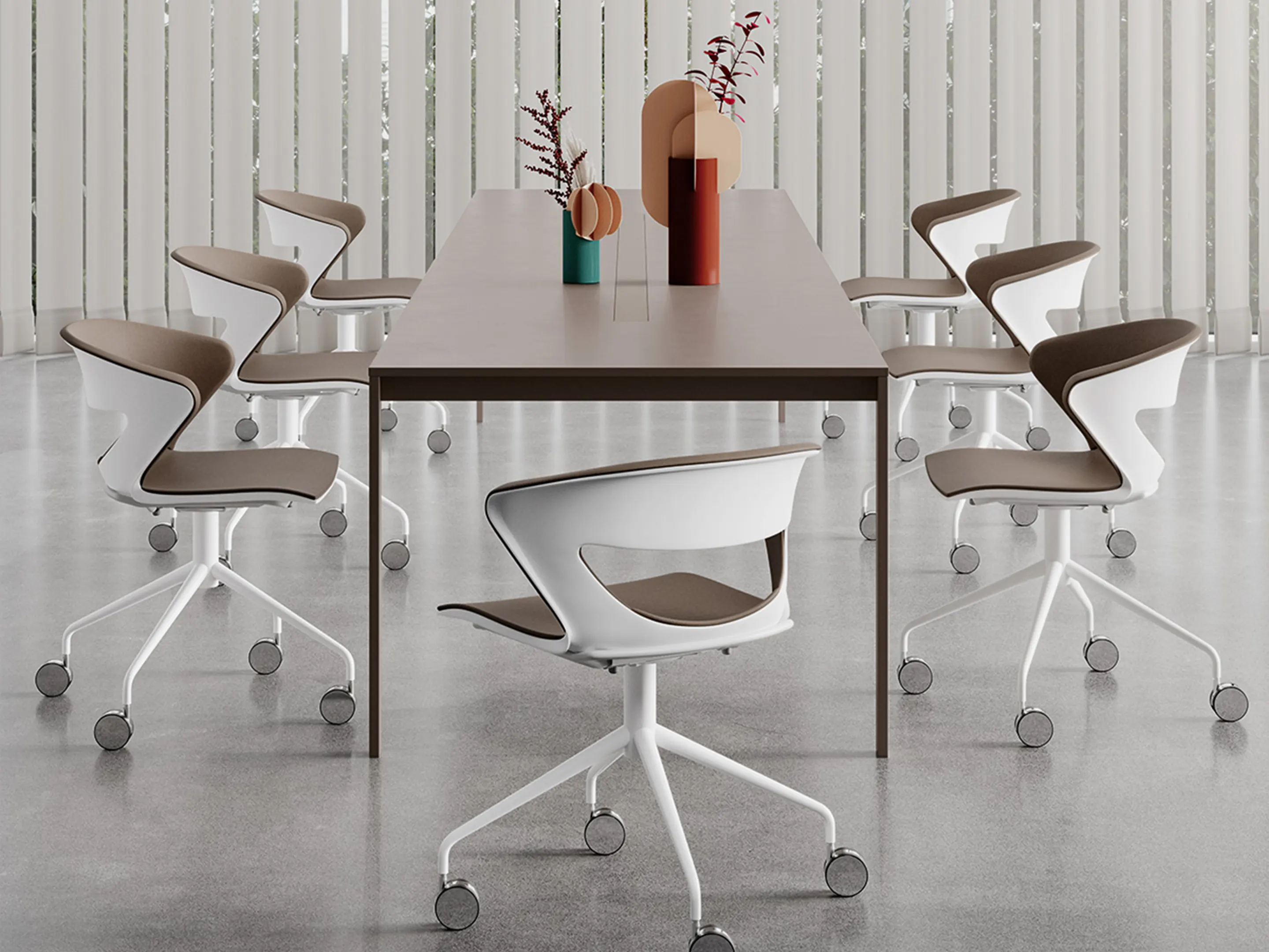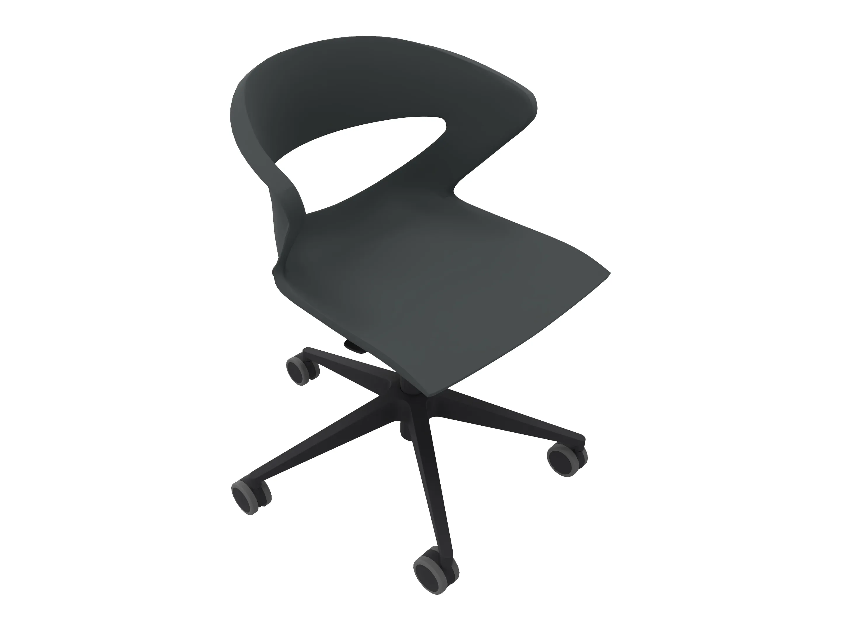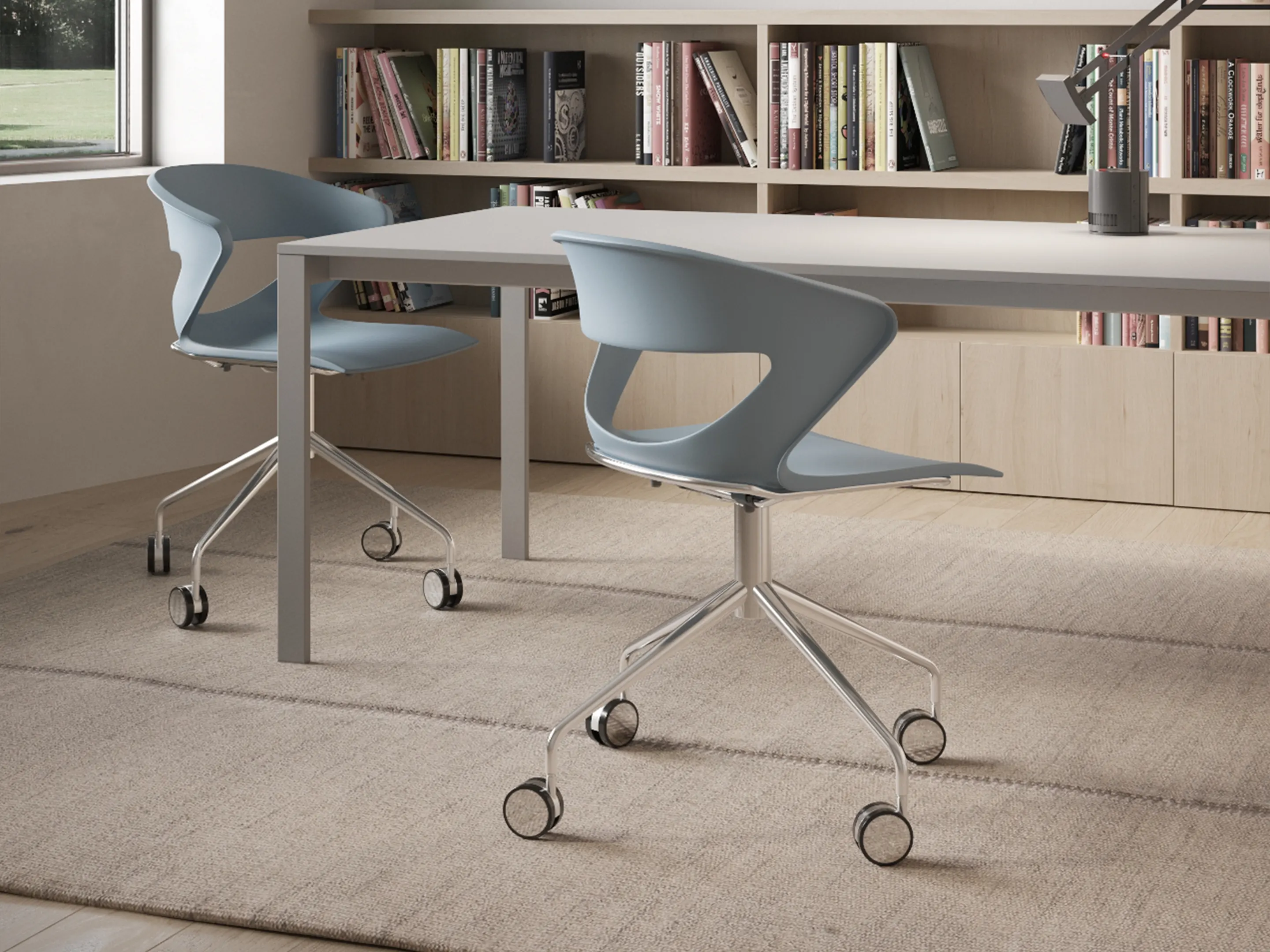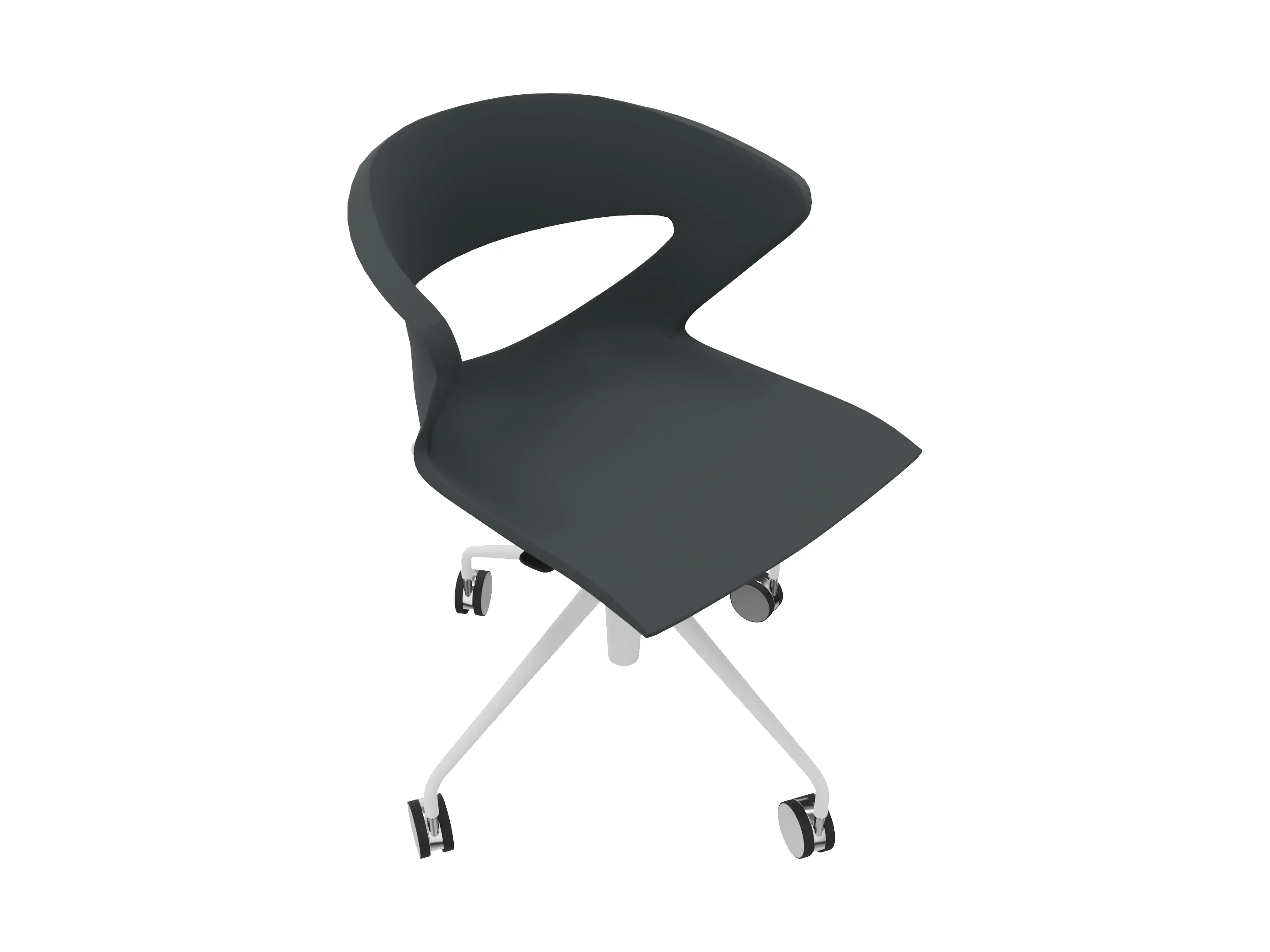 Stoel met een polypropyleen kuip op een 4-teens kruis op wielen. Draaibaar.