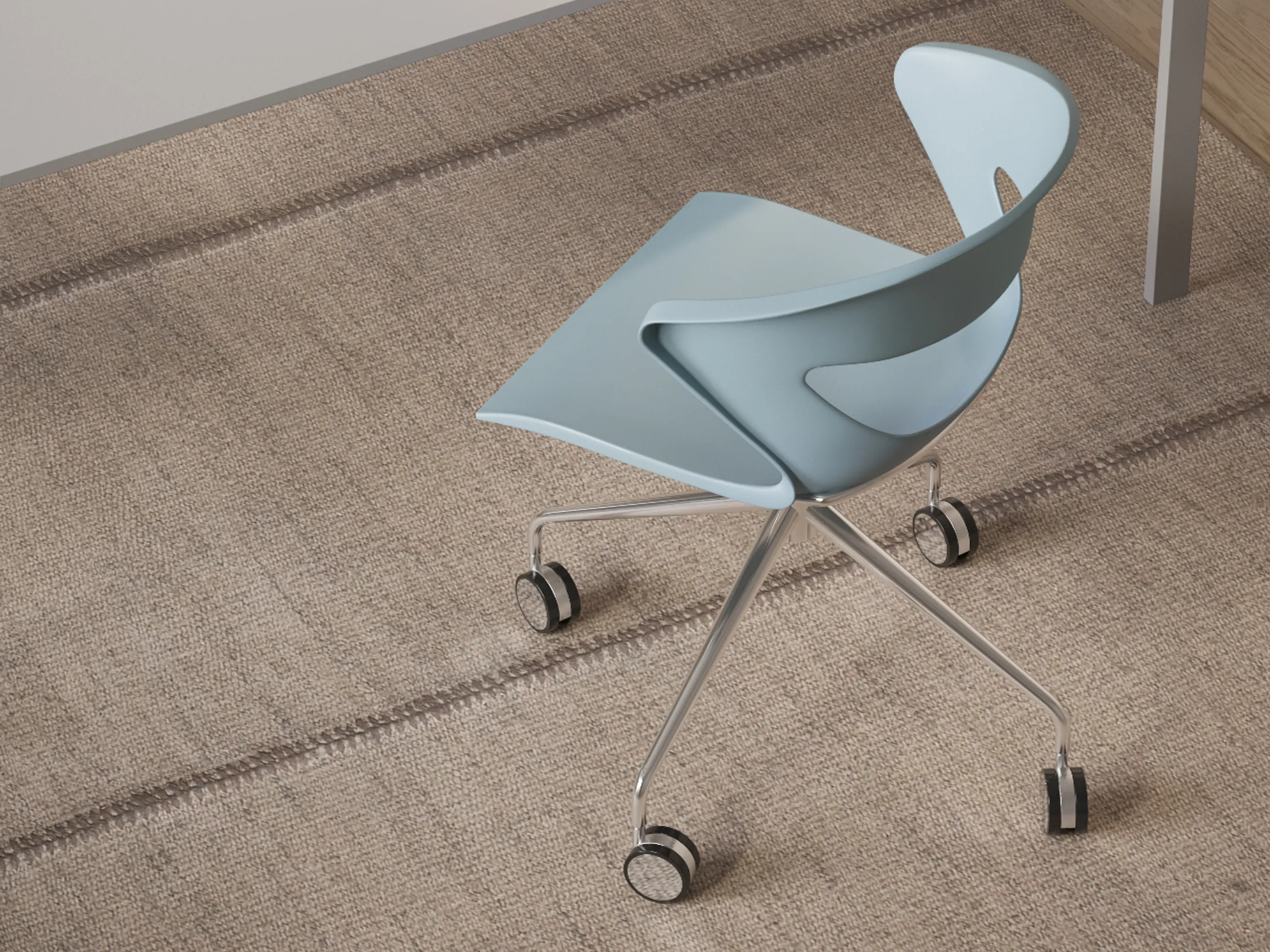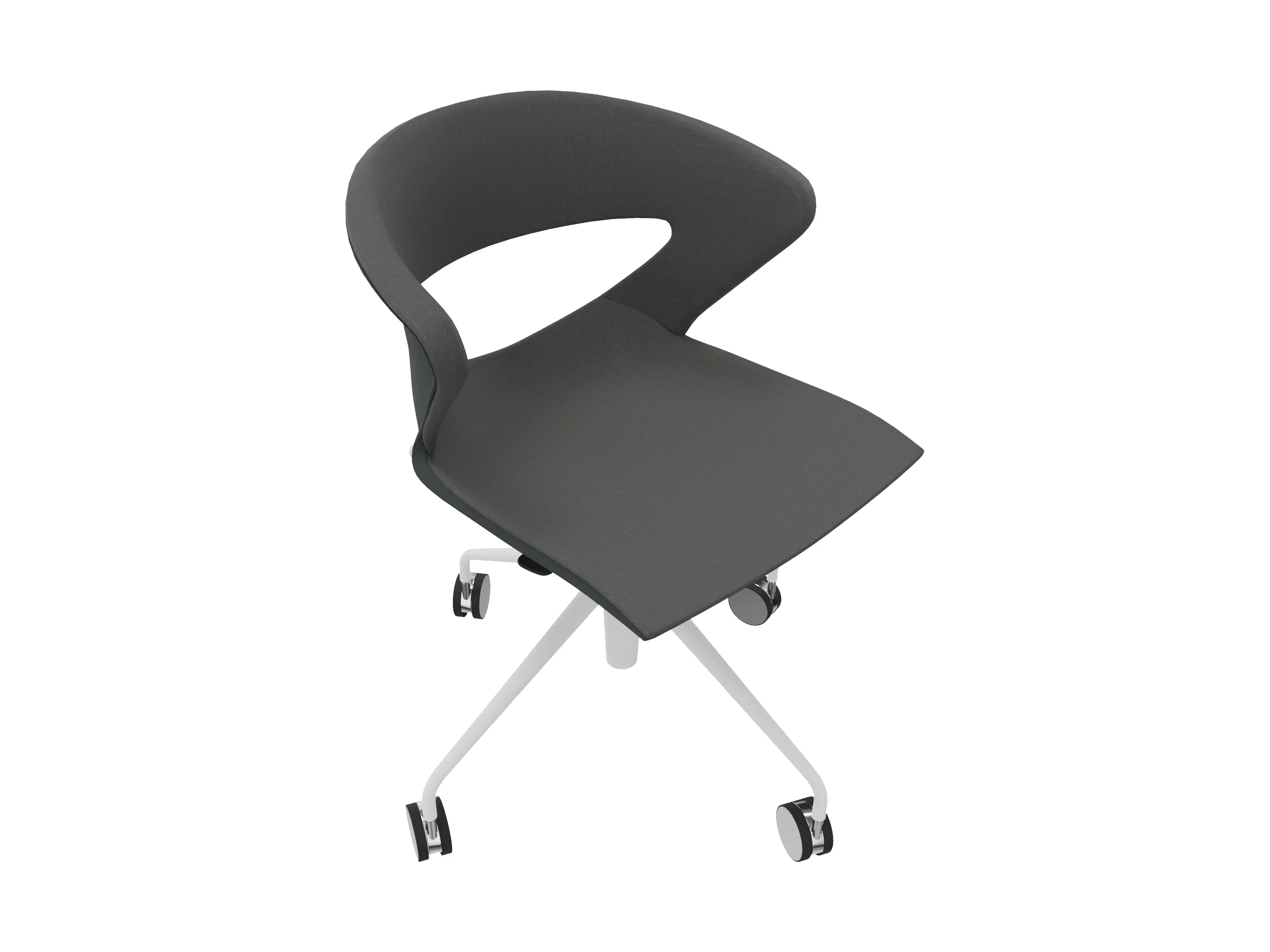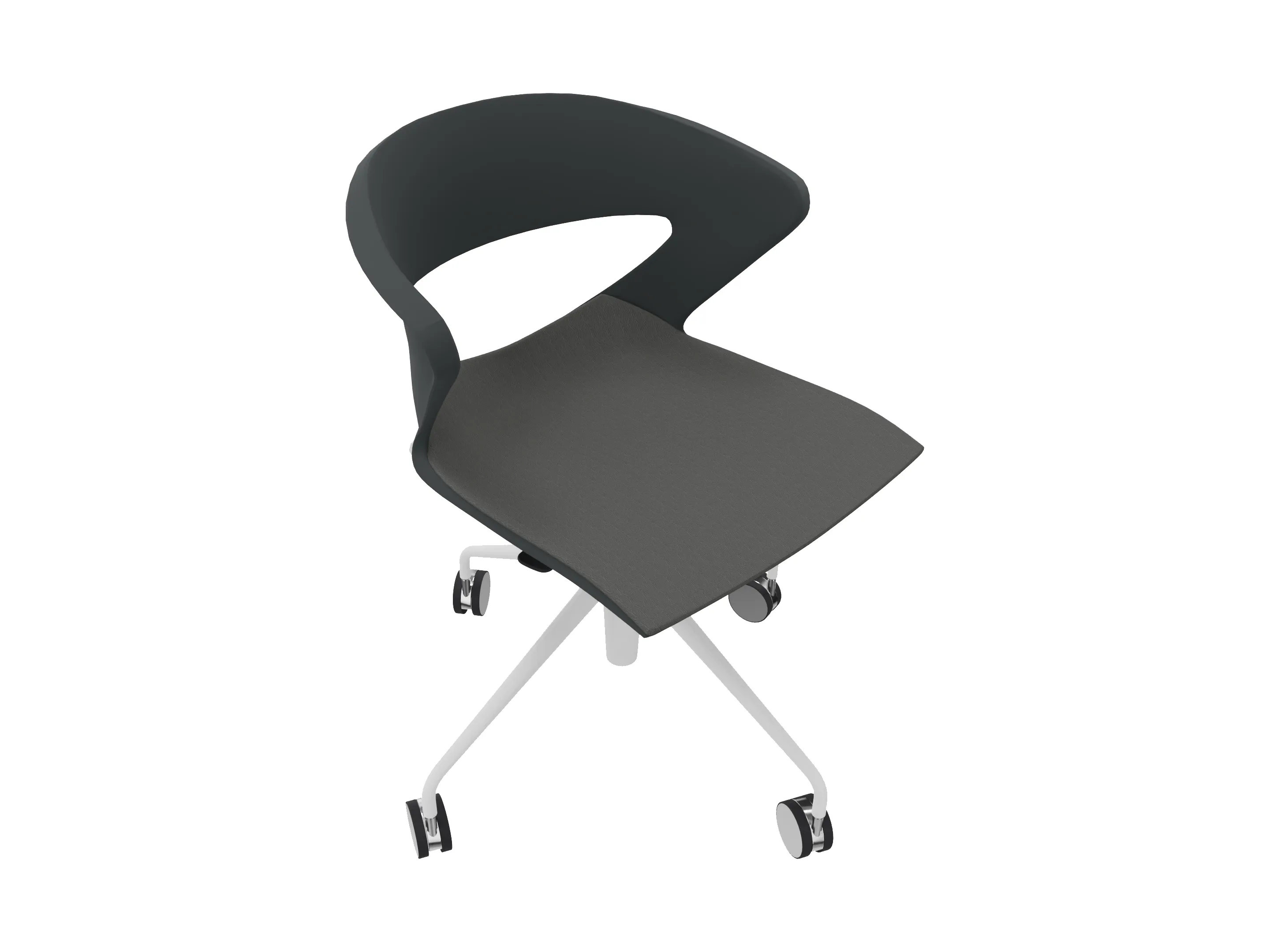 Stoel met een polypropyleen kuip met opdekstoffering op de zitting op een 4-teens kruis op wielen. Draaibaar.