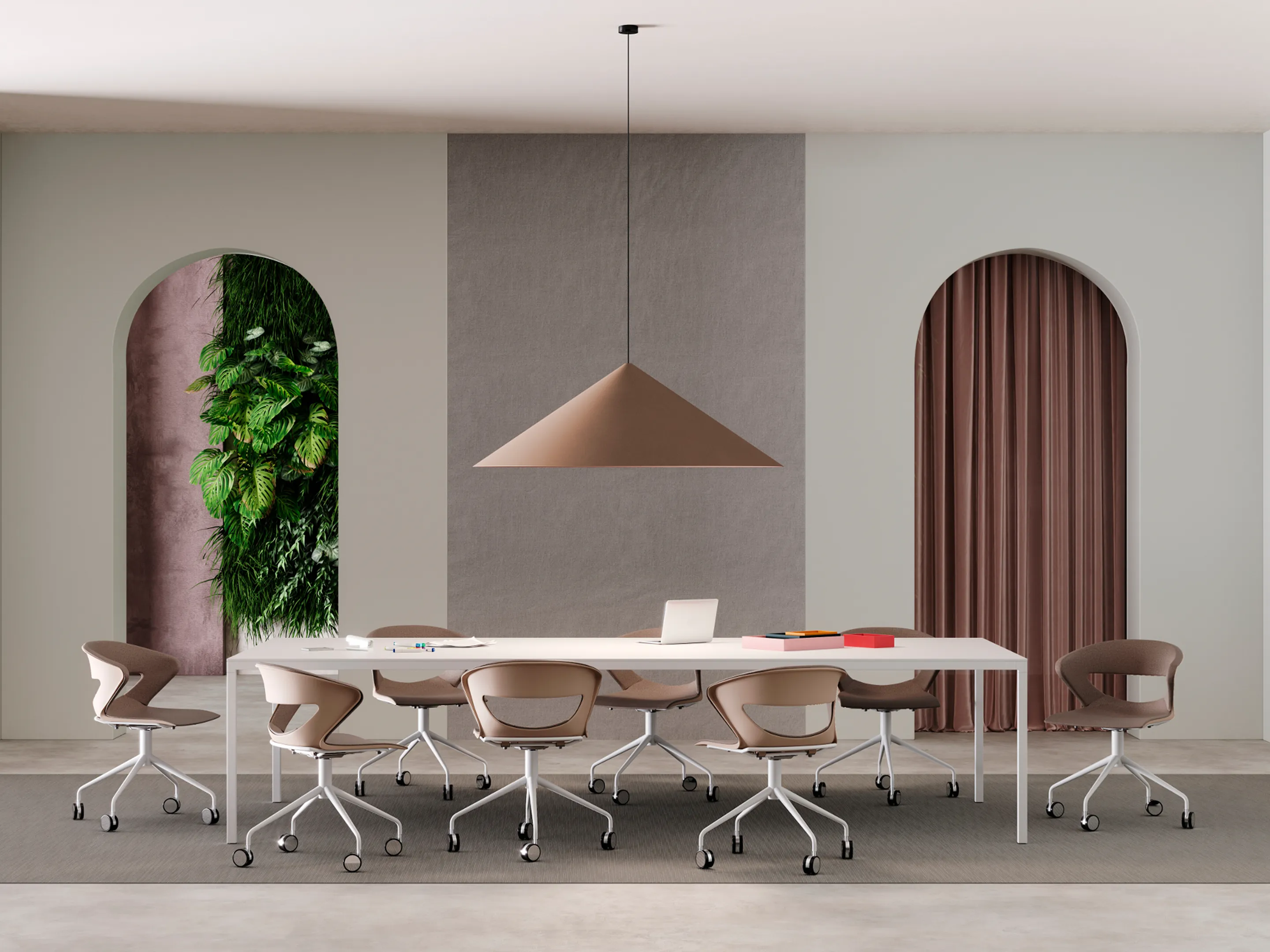 Stoel met een polypropyleen kuip met opdekstoffering op de zitting op een 5-teens kruis op wielen. Draaibaar en hoogte-instelbaar.