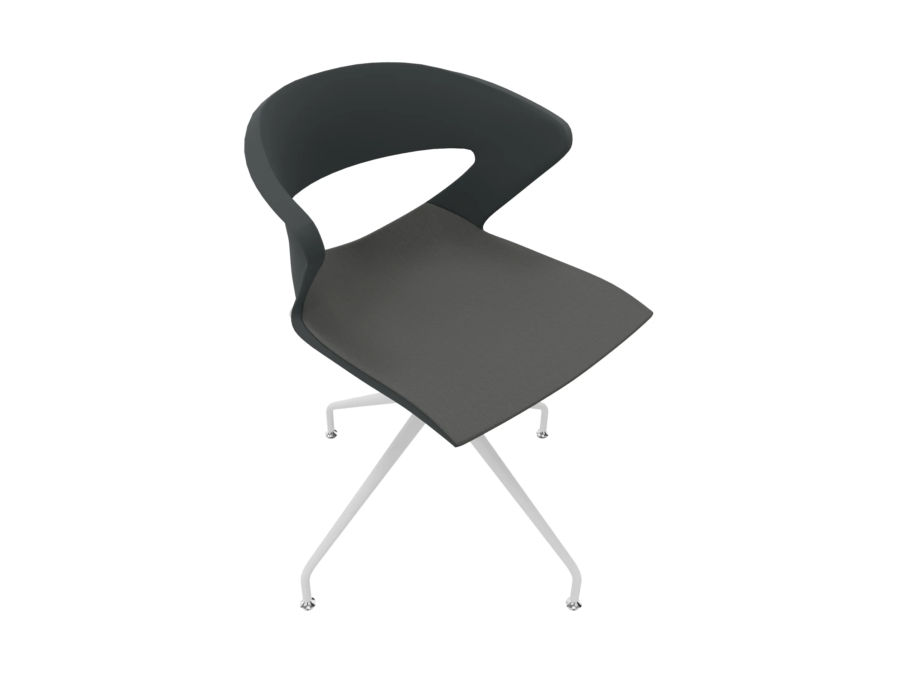 Stoel met een polypropyleen kuip met opdekstoffering op de zitting en rugleuning op een 4-teens kruis op glijders. Draaibaar.