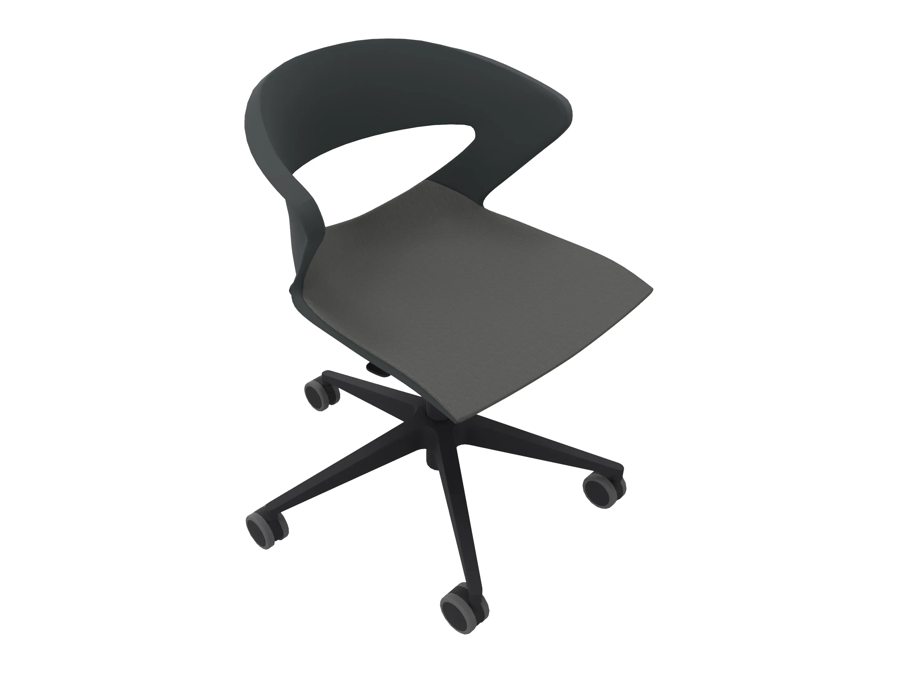 Stoel met een polypropyleen kuip met opdekstoffering op zitting en rugleuning op een 5-teens kruis op wielen. Draaibaar en hoogte-instelbaar.