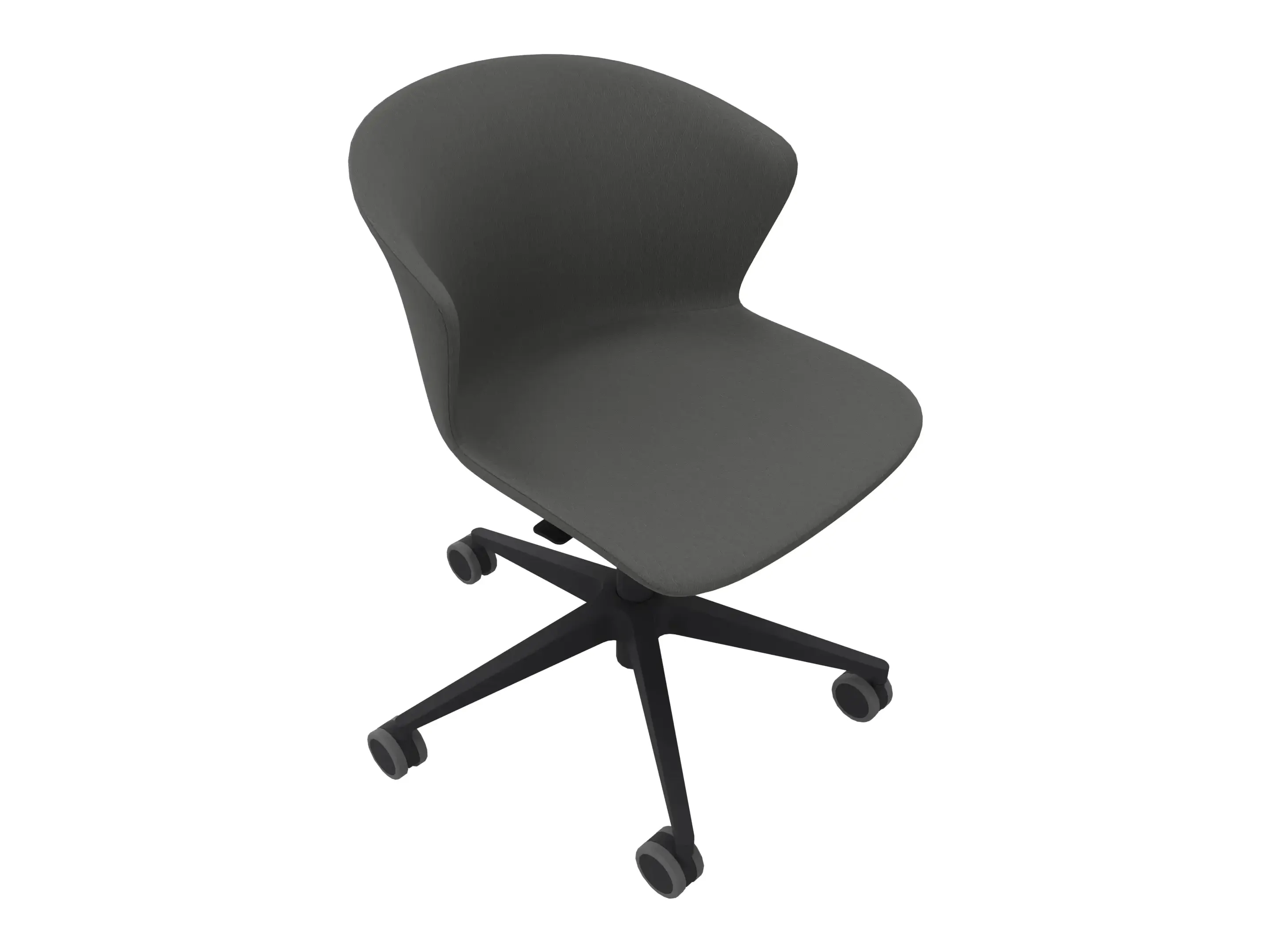 Stoel met een volledig gestoffeerde kuip op een 5-teens kruis met wielen. Draaibaar en hoogte-instelbaar.