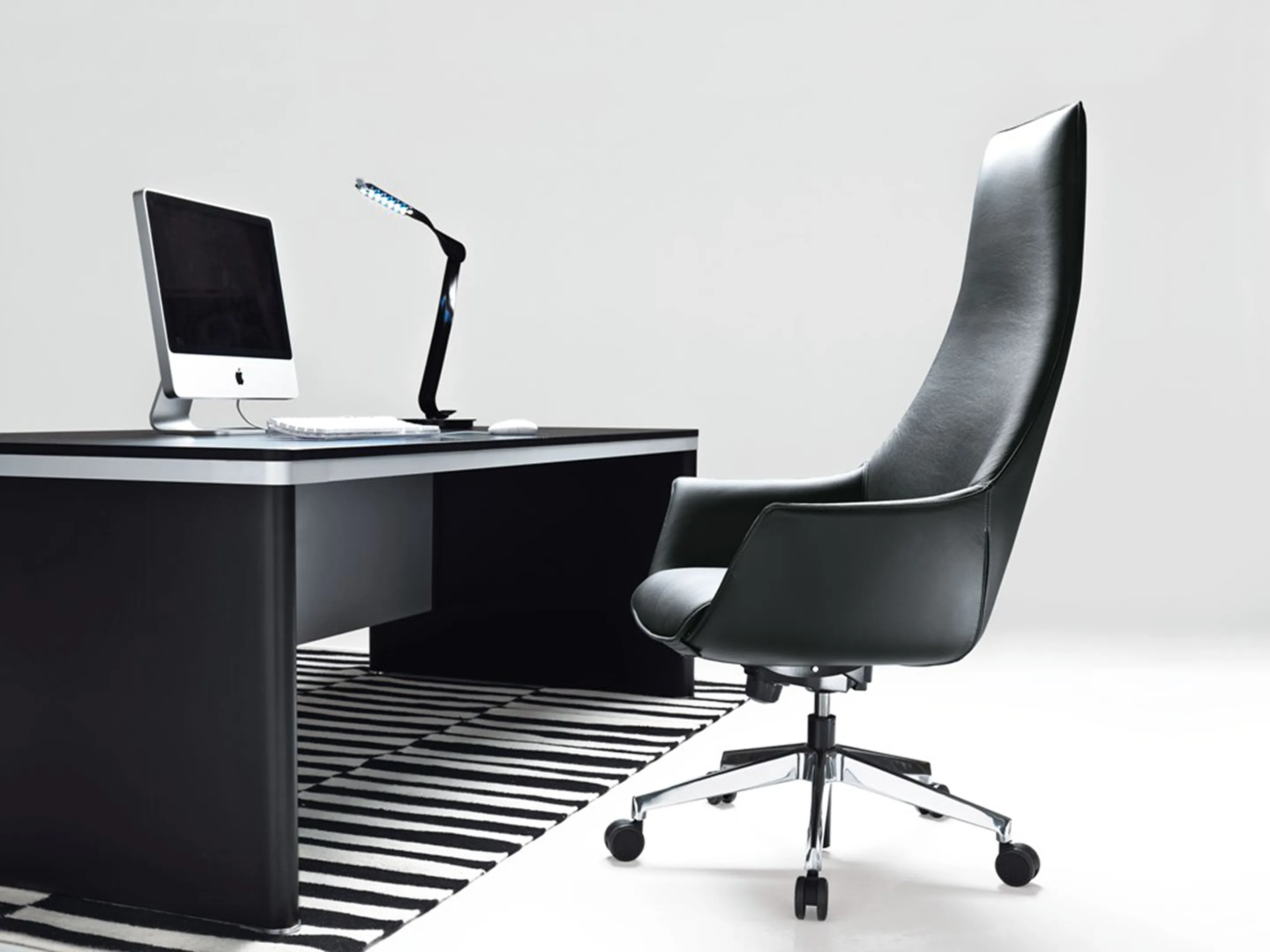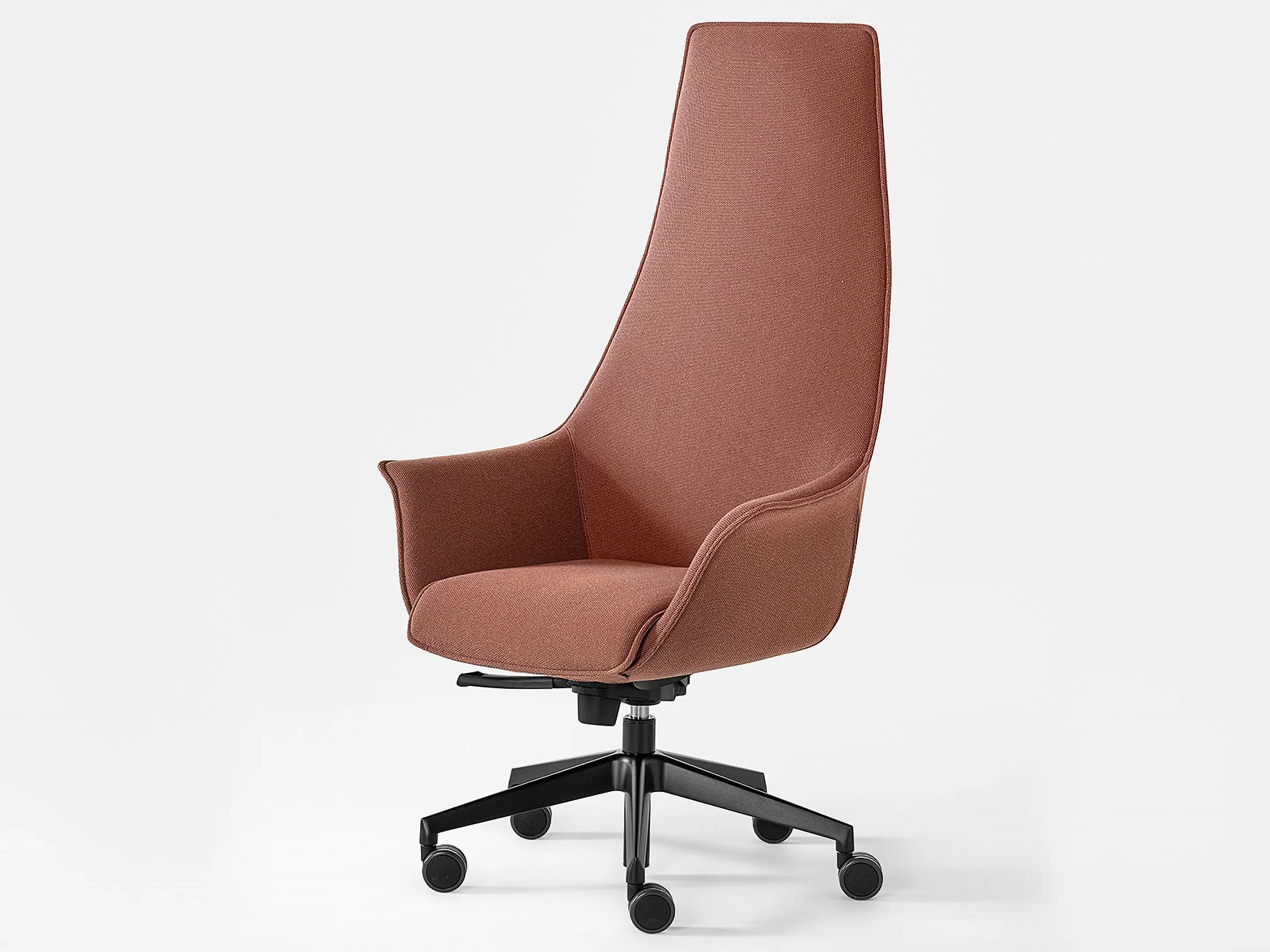 Directiestoel met een hoge rug, volledig gestoffeerd op een 5-teens kruis op wielen. Draaibaar, hoogte-instelbaar en kantelbaar met een knie-kantelmechanisme.