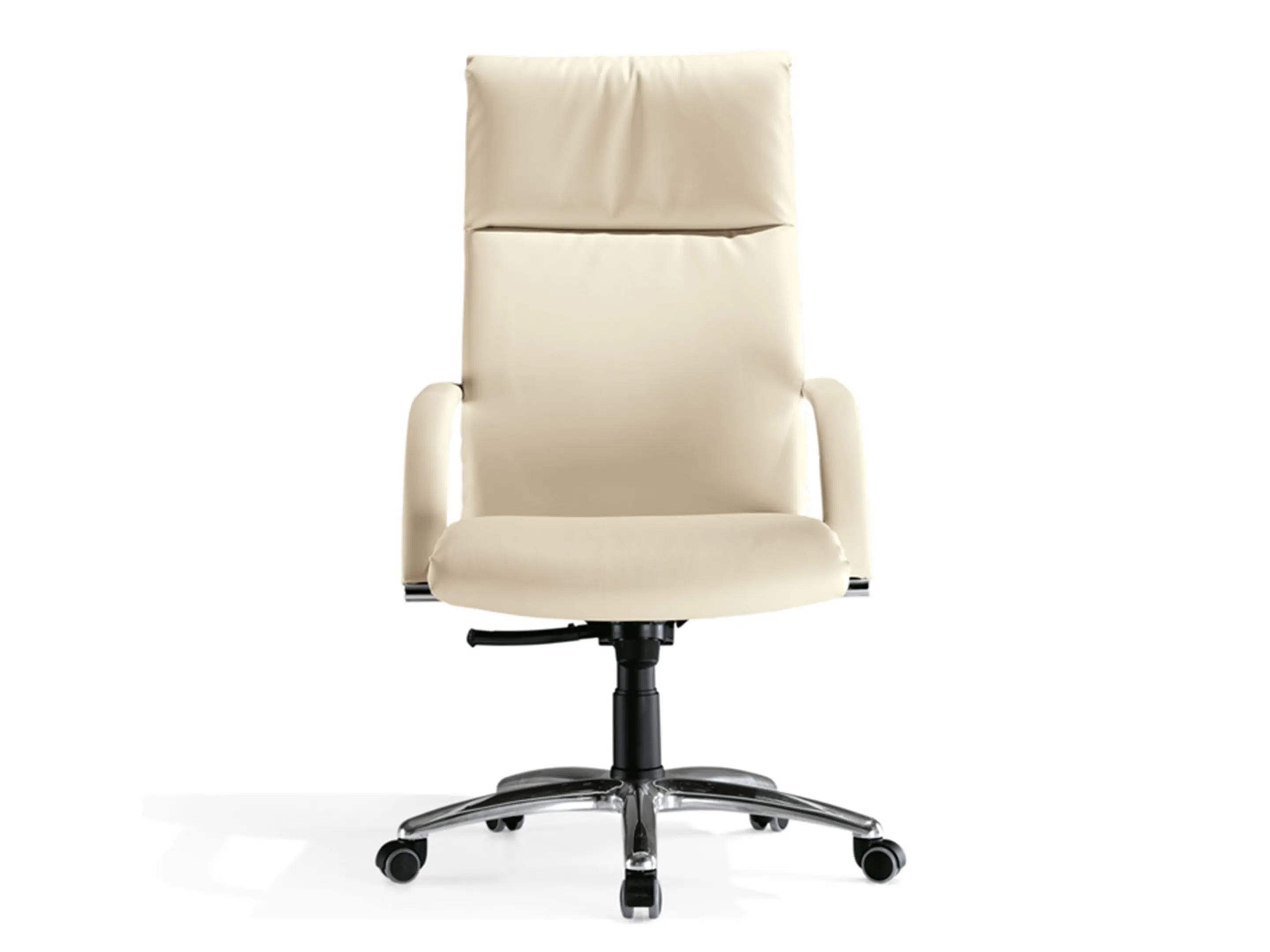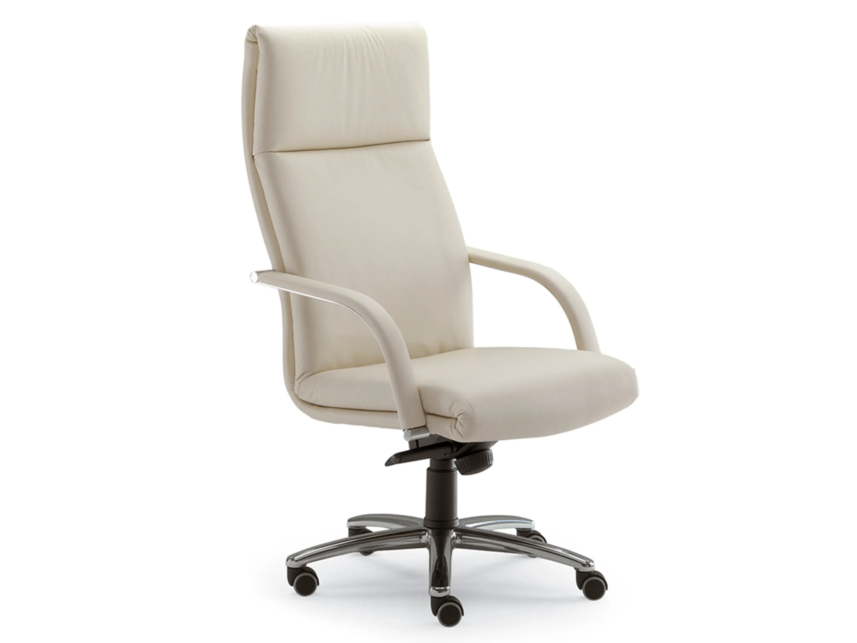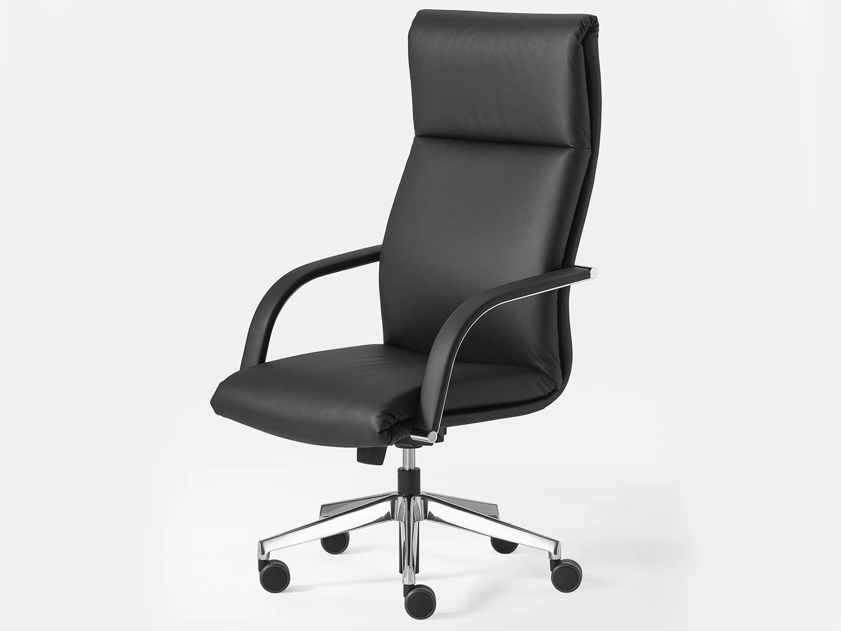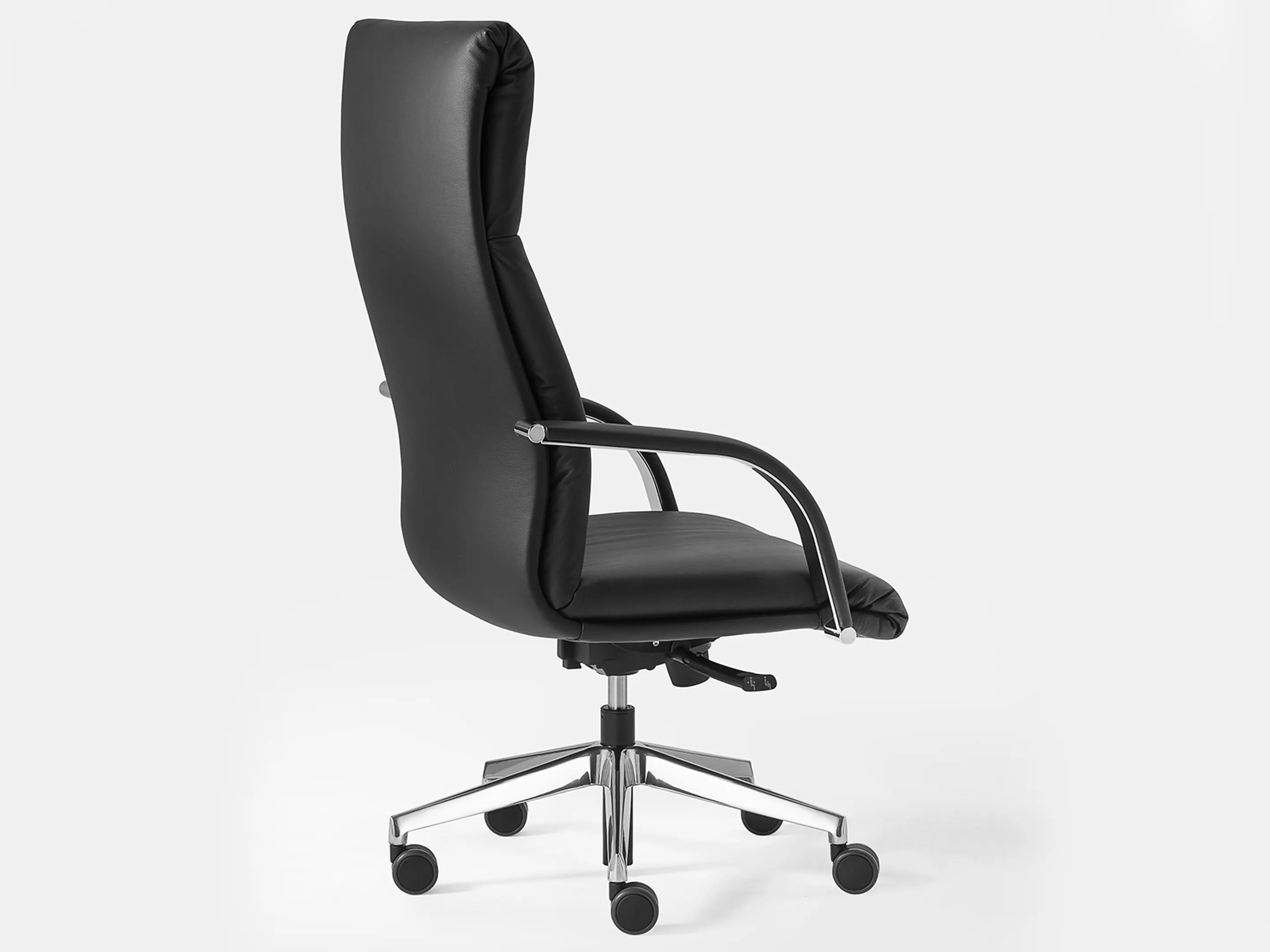 Directiestoel met een hoge rug, volledig gestoffeerd op een 5-teens kruis op wielen incl. chromen armsteunen. Draaibaar, hoogte-instelbaar en kantelbaar met een knie-kantelmechanisme.