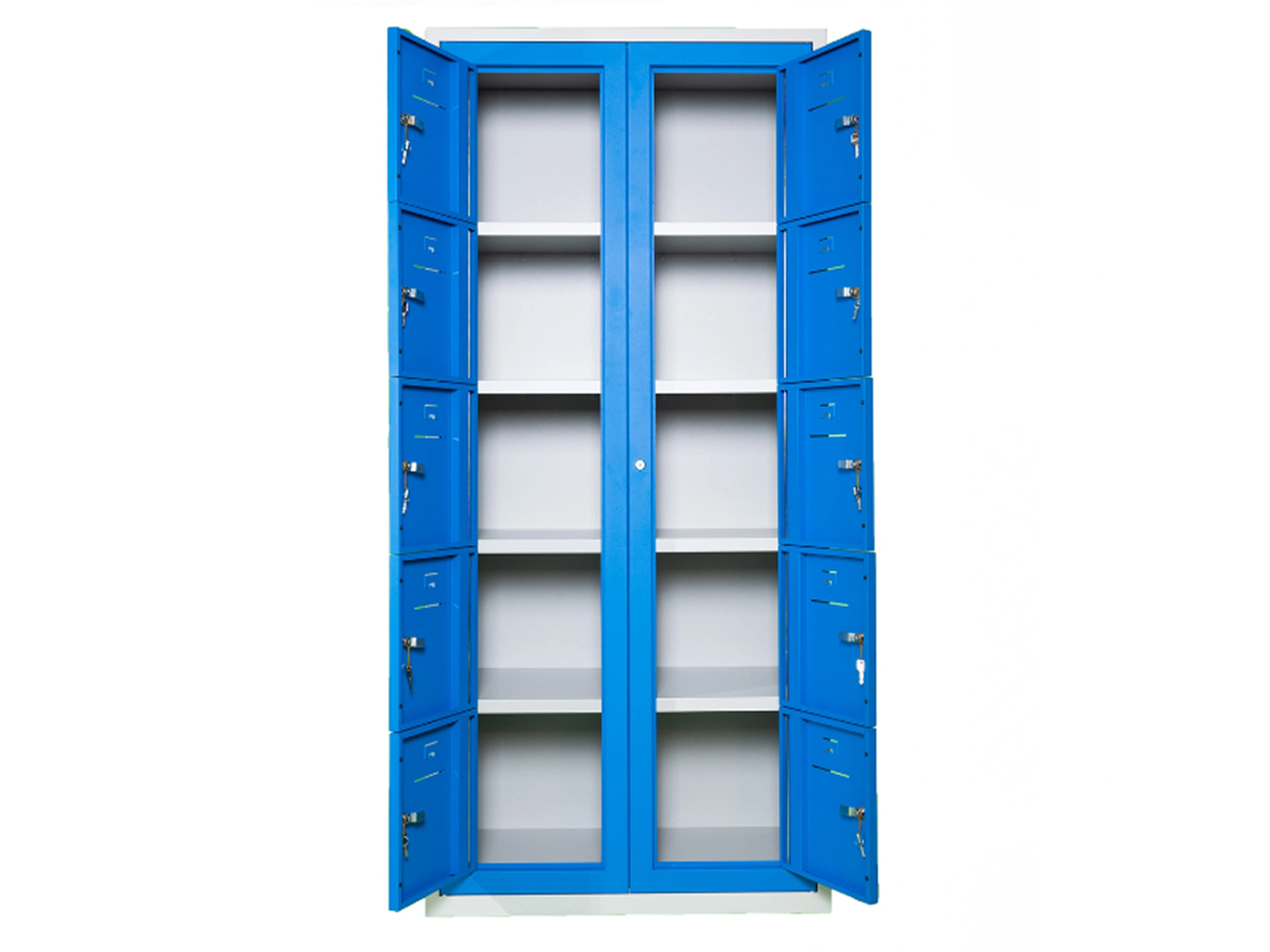 draaideur (met postsleuf), type slot: cilinderslot. Kleur romp: grijs (RAL7035), kleur deuren: blauw (RAL5015). Afmeting: 195x50x50 cm (HxBxD). Indeling: Aantal deuren: 5, aantal sleutels: .