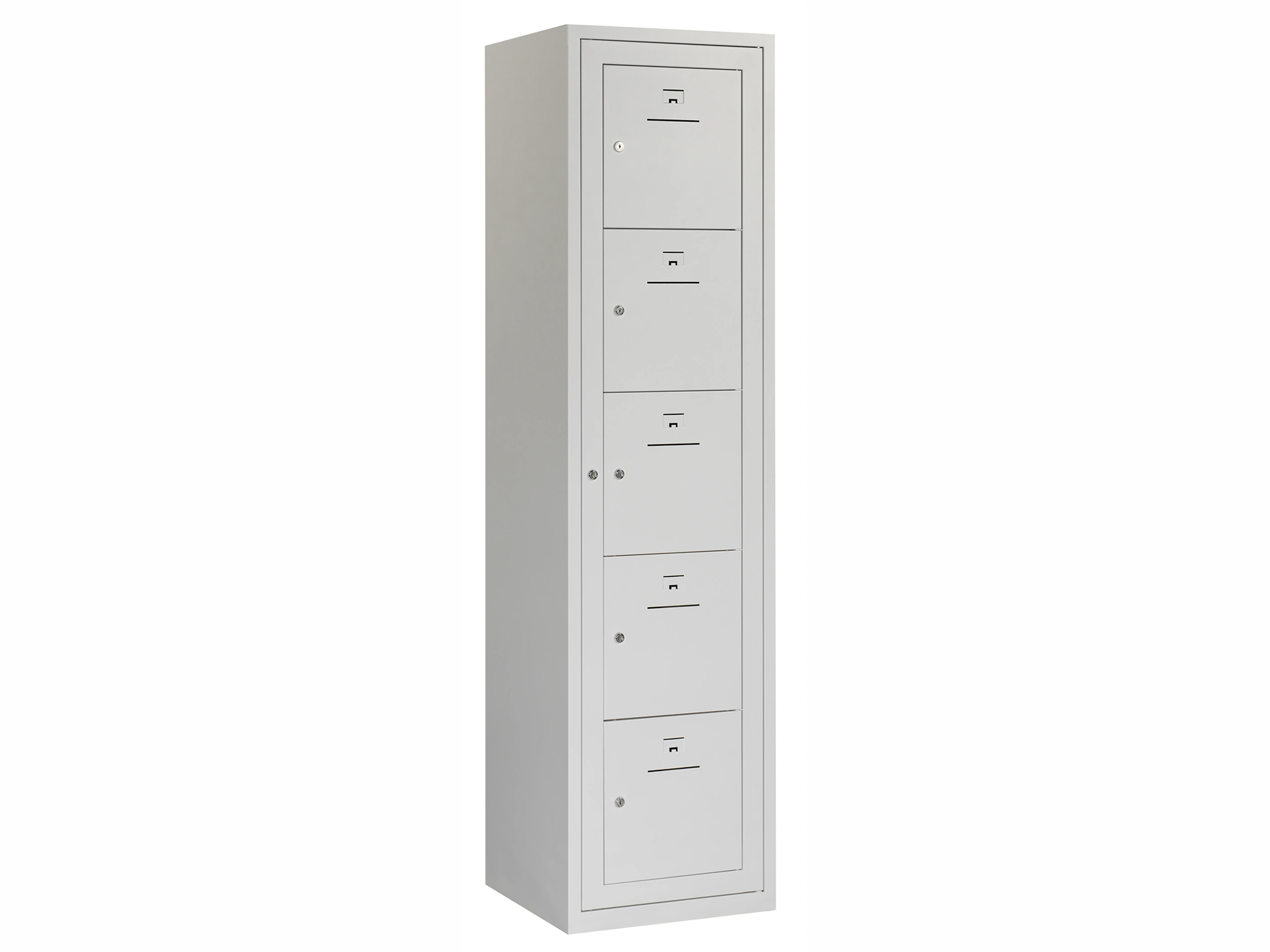 draaideur (met postsleuf), type slot: cilinderslot. Kleur romp: grijs (RAL7035), kleur deuren: grijs (RAL7035). Afmeting: 195x50x50 cm (HxBxD). Indeling: Aantal deuren: 5, aantal sleutels: .