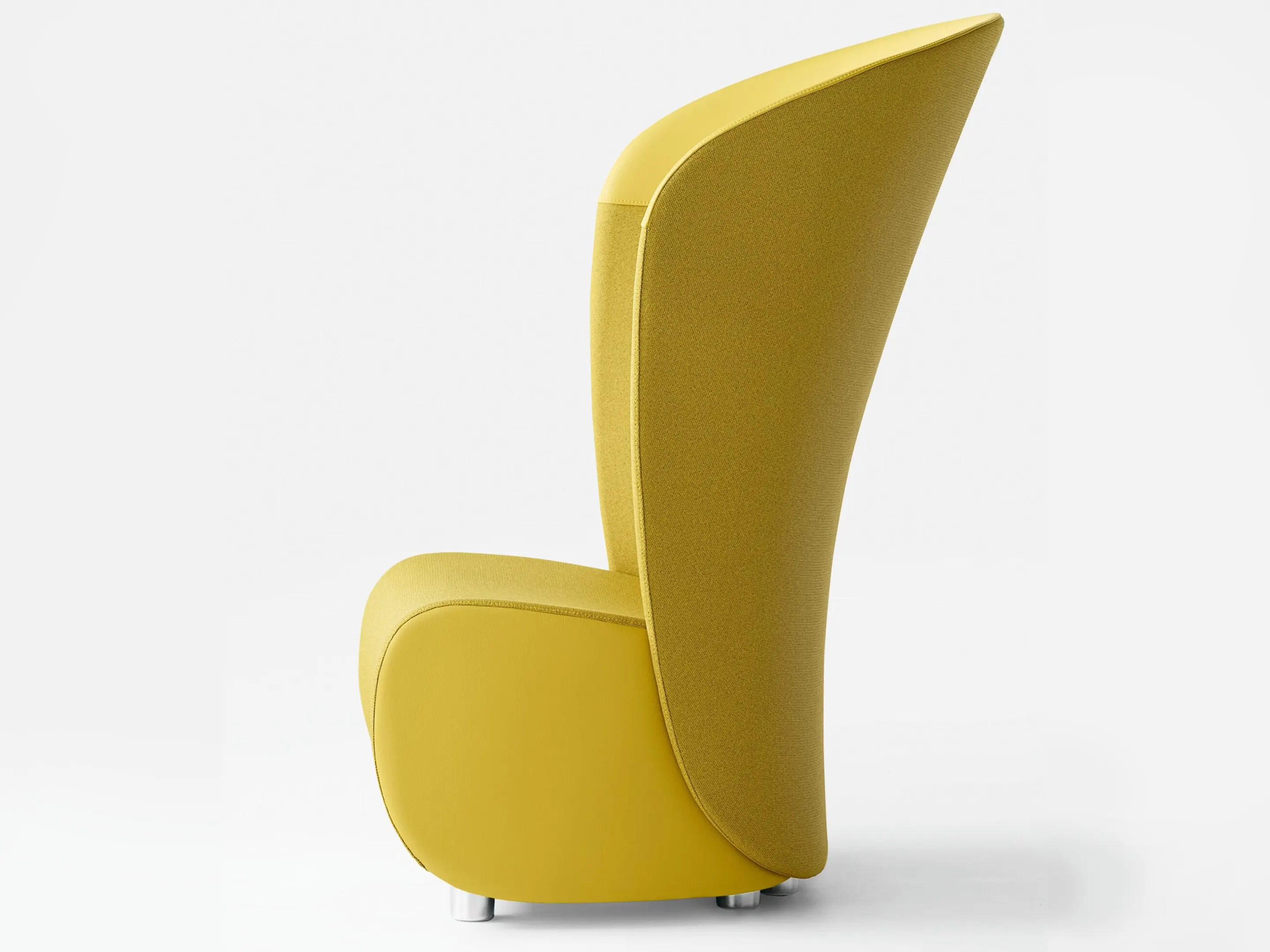 Volledig gestoffeerde fauteuil met hoge rug op 4 glijders.