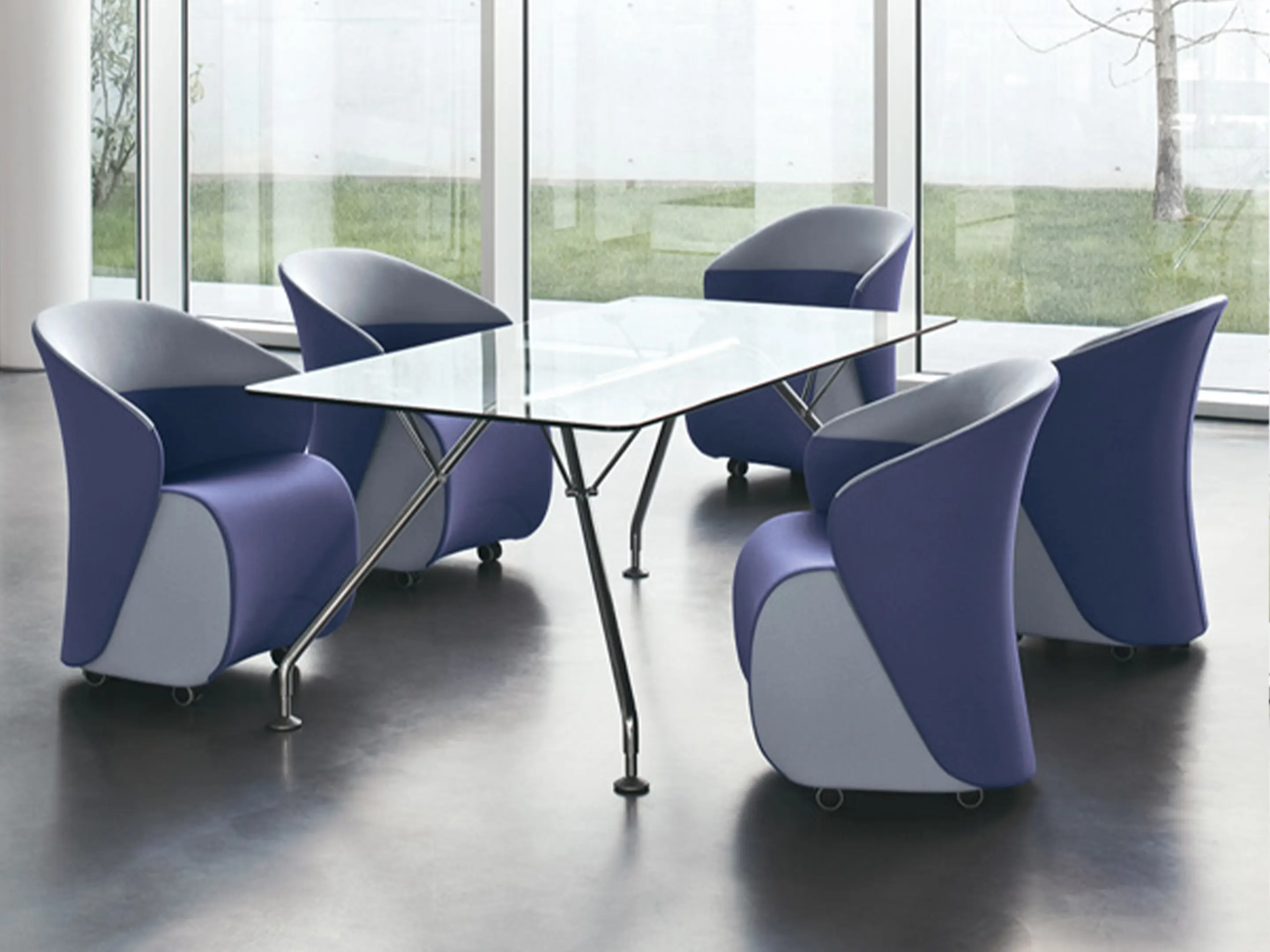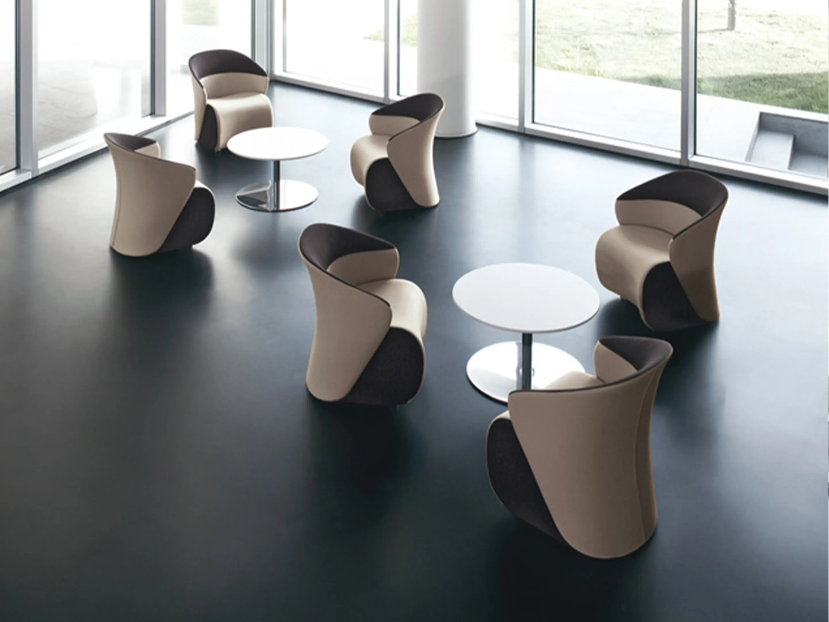 Volledig gestoffeerde fauteuil met lage rug op 4 glijders.