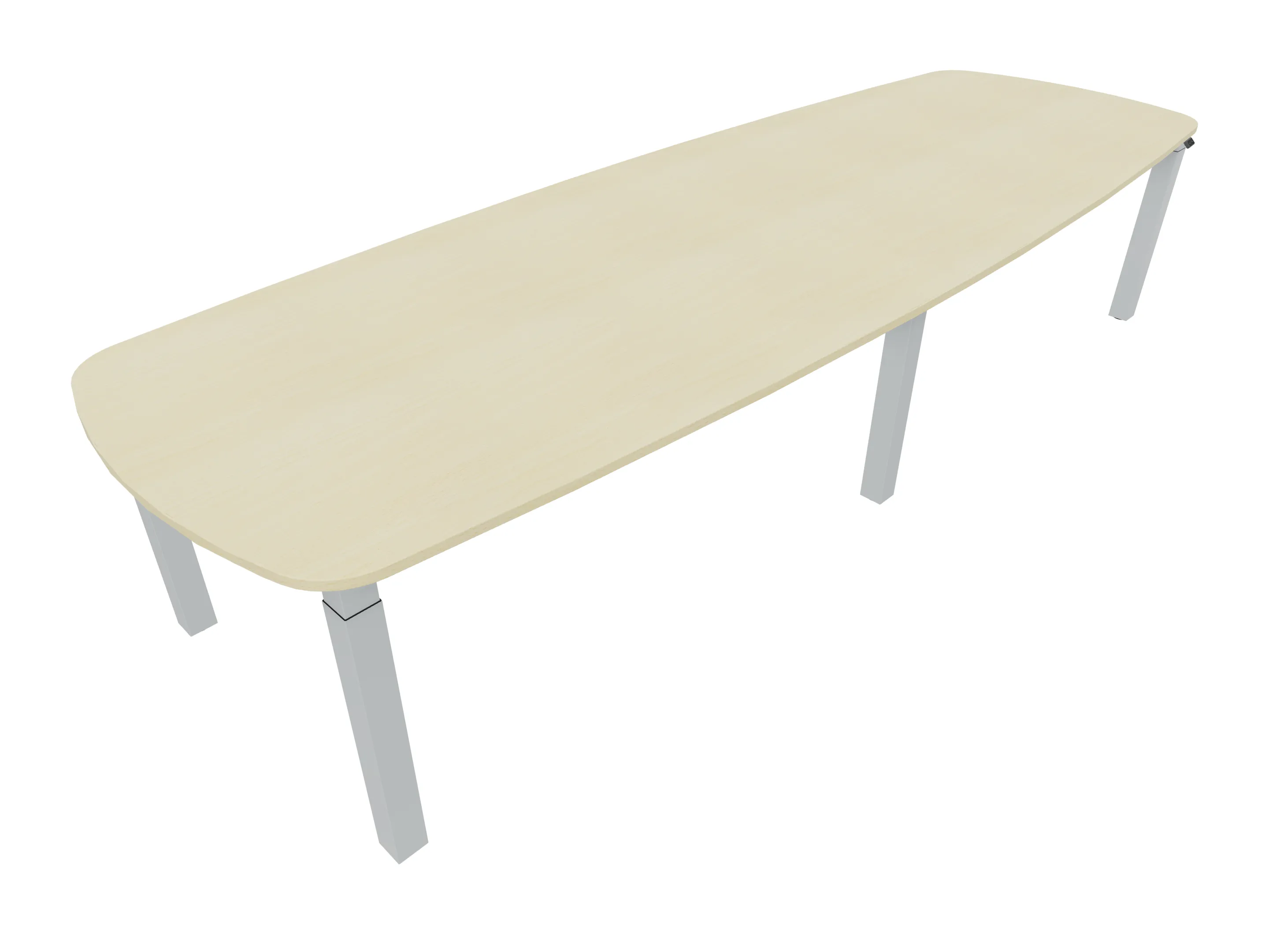 Elektrisch hoogte instelbare tonvormige vergadertafel met rechte hoeken, tussen 720-1080mm, compleet met 6 poten en bediening. Afmeting: 3600 x 720 x 1200mm (BxHxD)