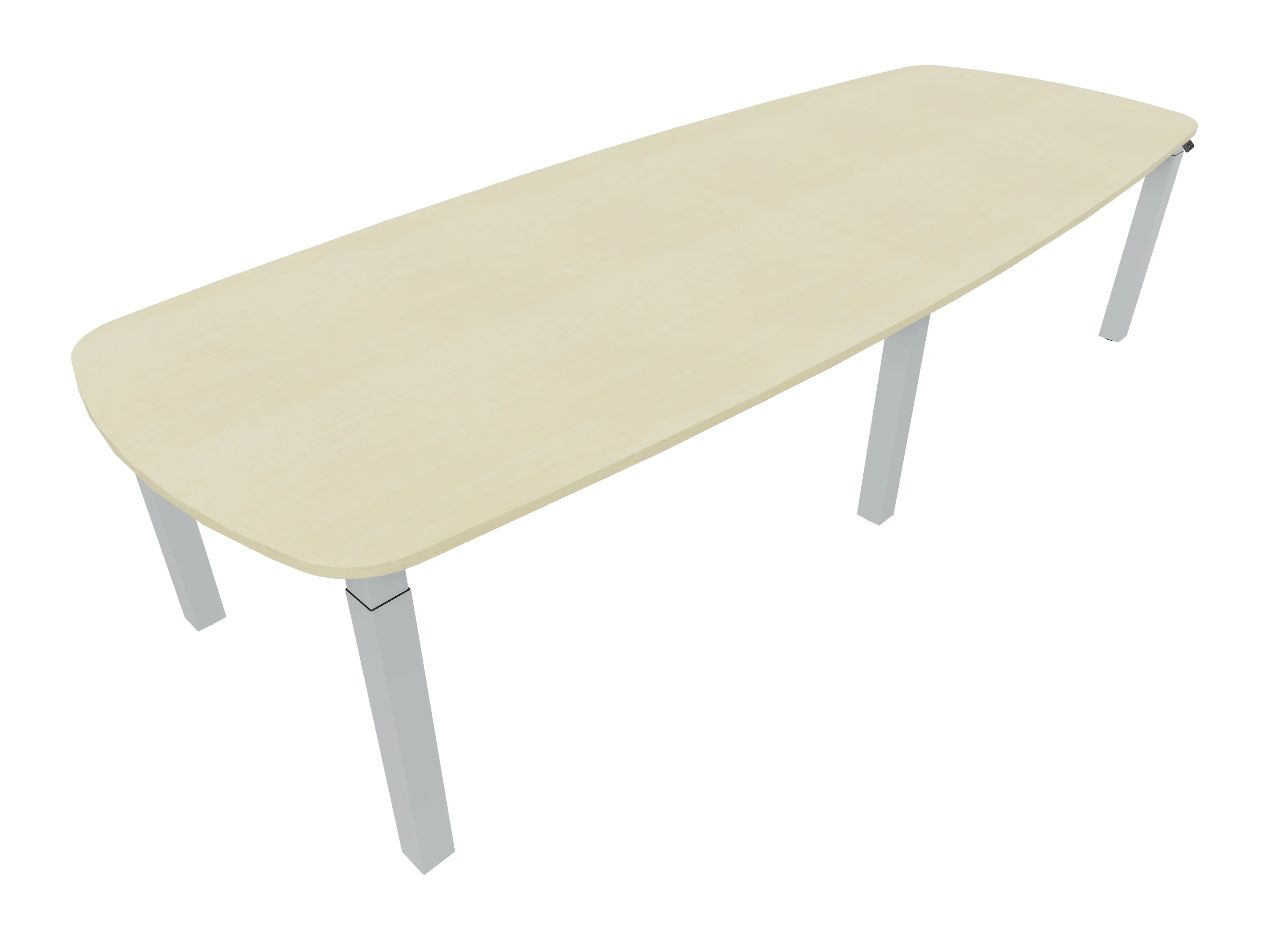 Elektrisch hoogte instelbare tonvormige vergadertafel met ronde hoeken, tussen 720-1080mm, compleet met 6 poten en bediening. Afmeting: 3600 x 720 x 1200mm (BxHxD)