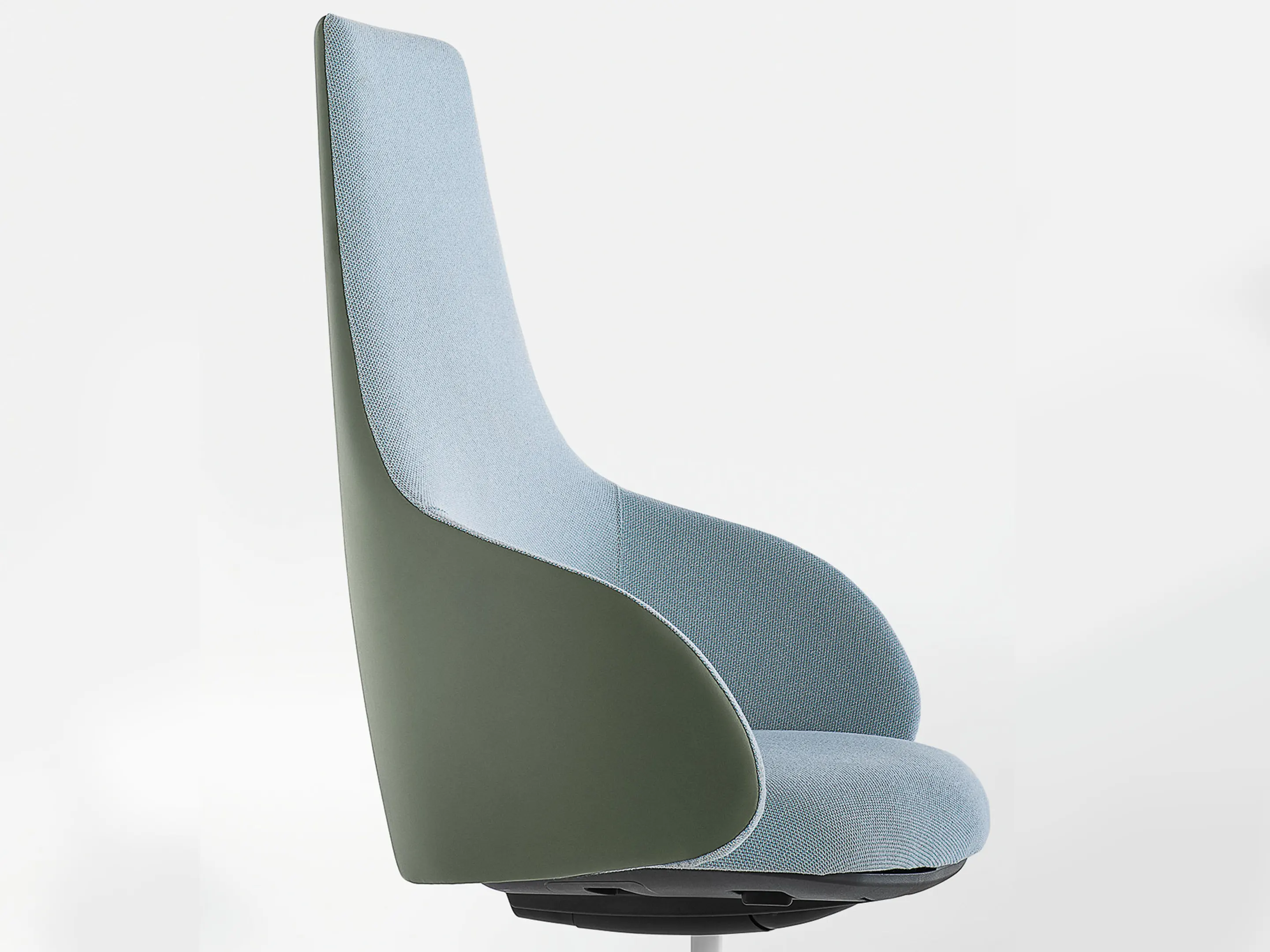 Vergaderstoel met een hoge rug en hoofdsteun met een volledige stoffering op een 5-teens kruis op wielen. Draaibaar, hoogte-instelbaar.