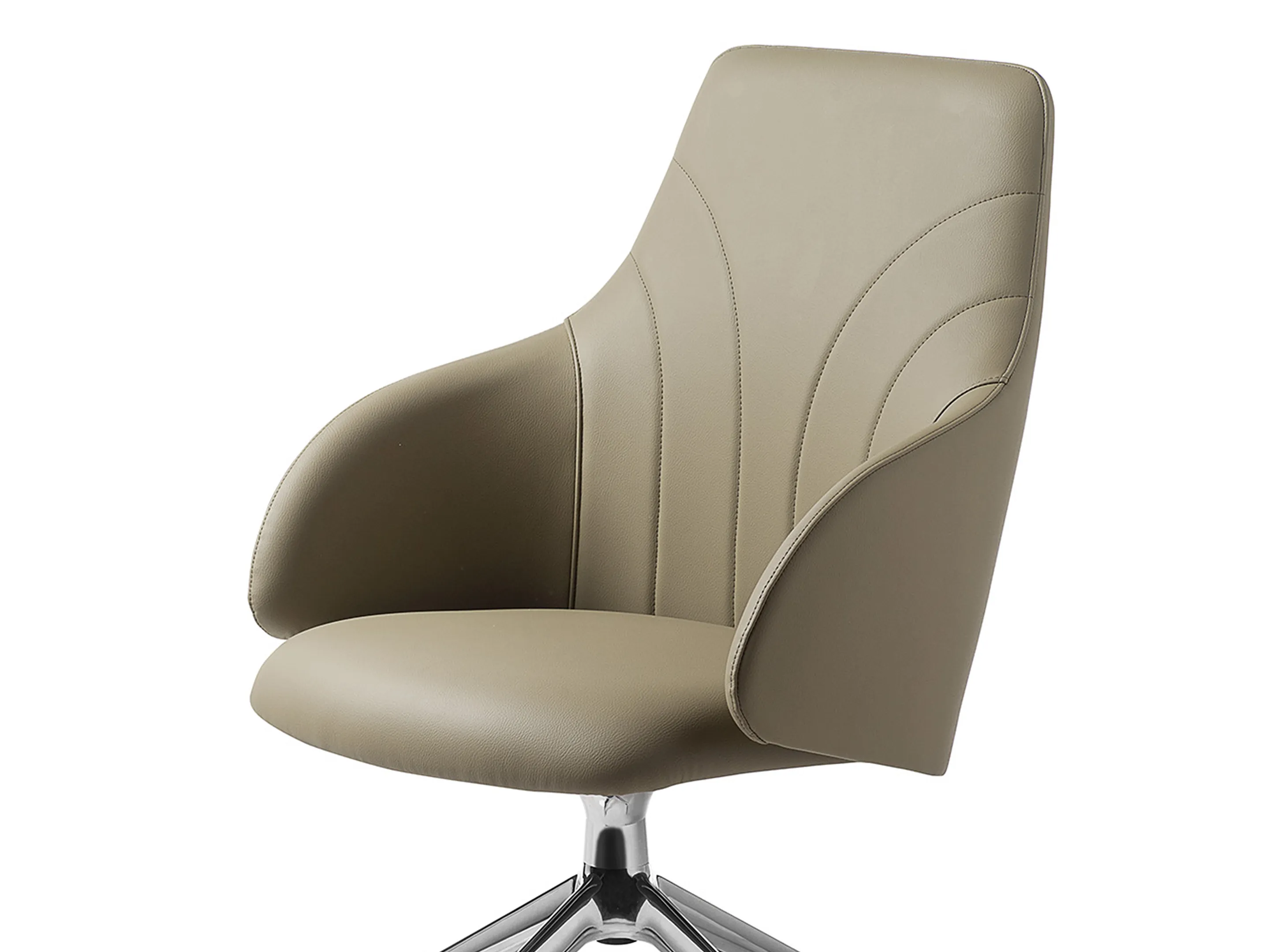 Vergaderstoel met een lage rug met een volledige stoffering met stiksel op de rugleuning op een 5-teens kruis op wielen. Draaibaar, hoogte-instelbaar.