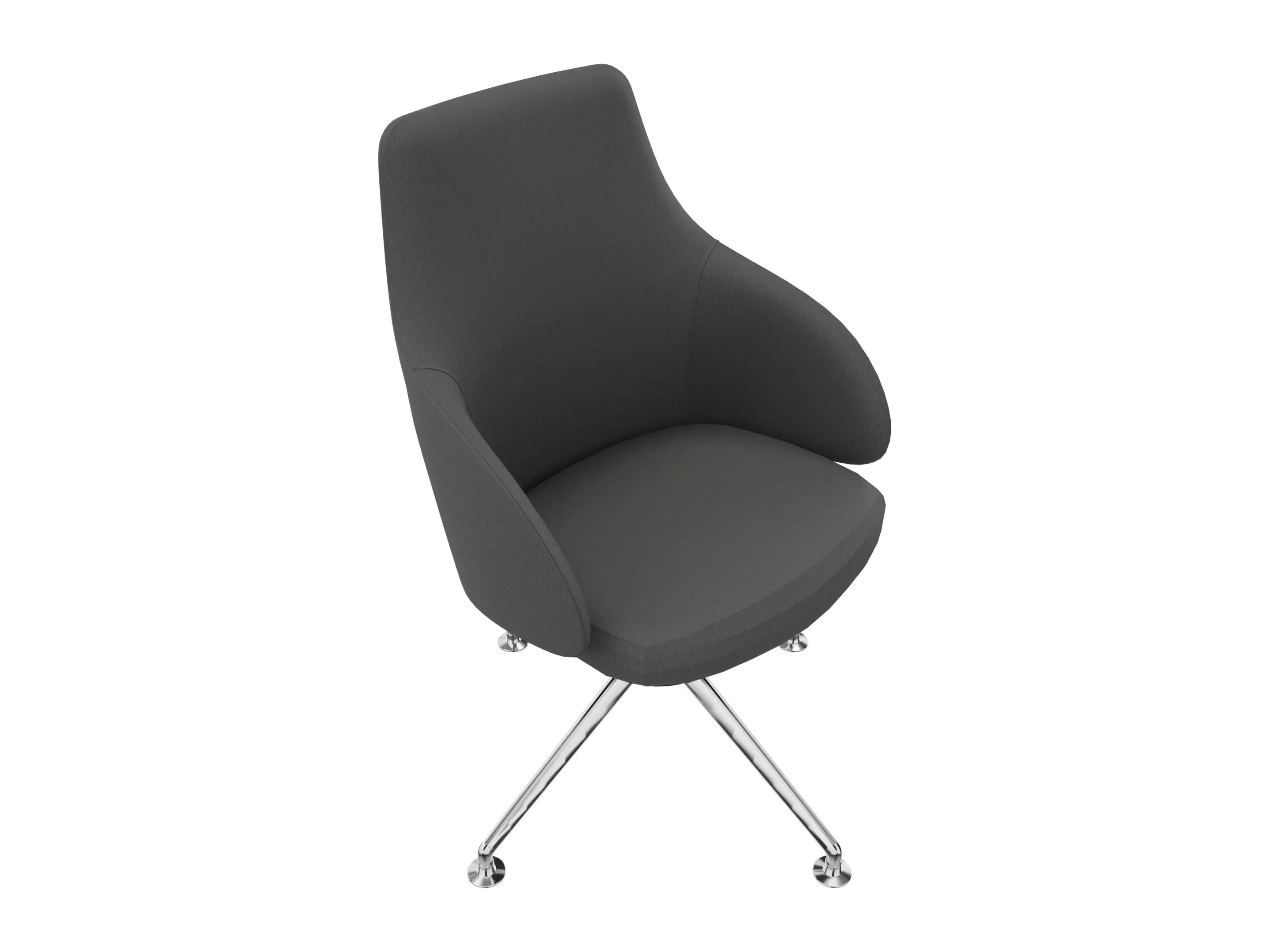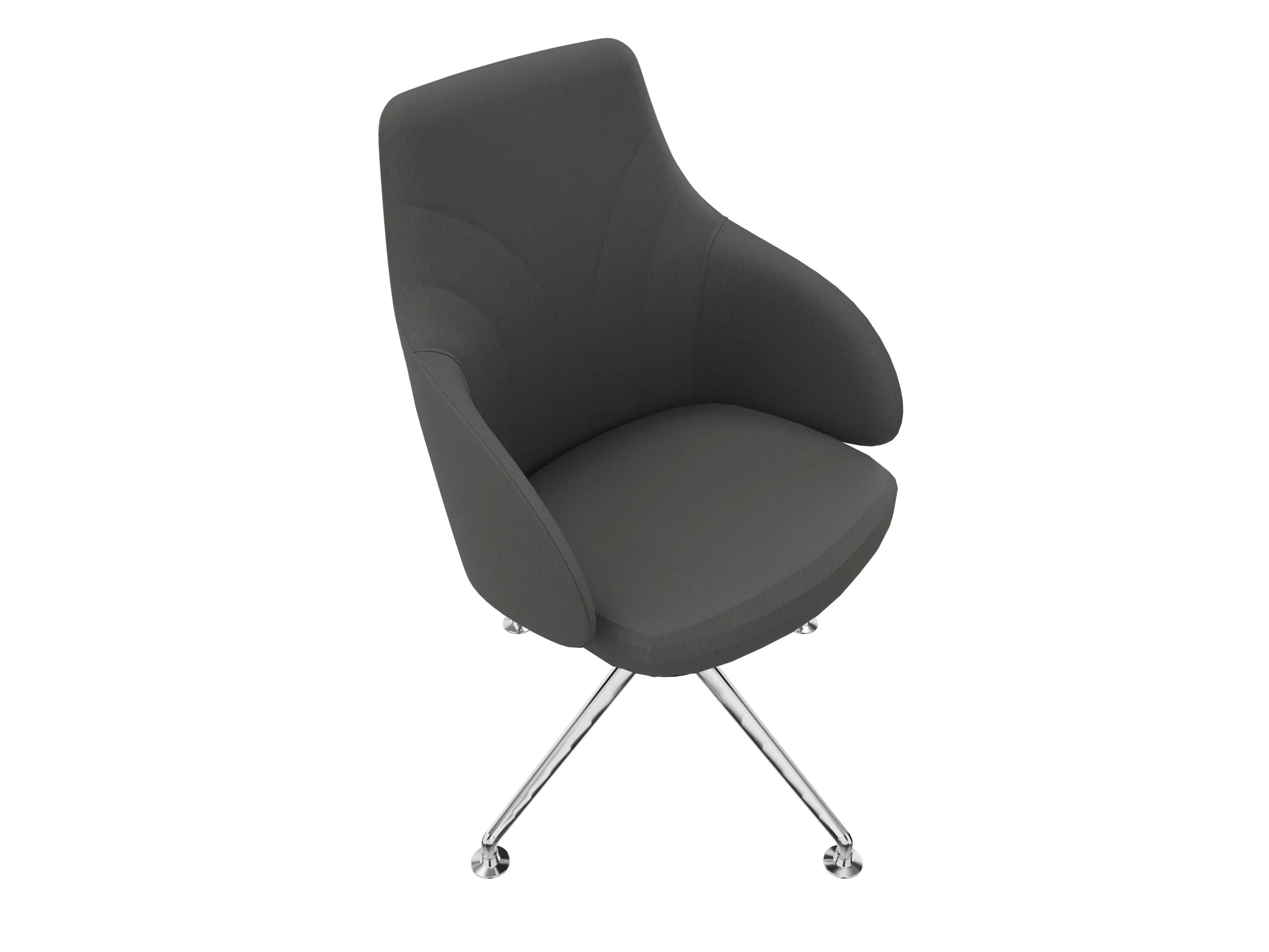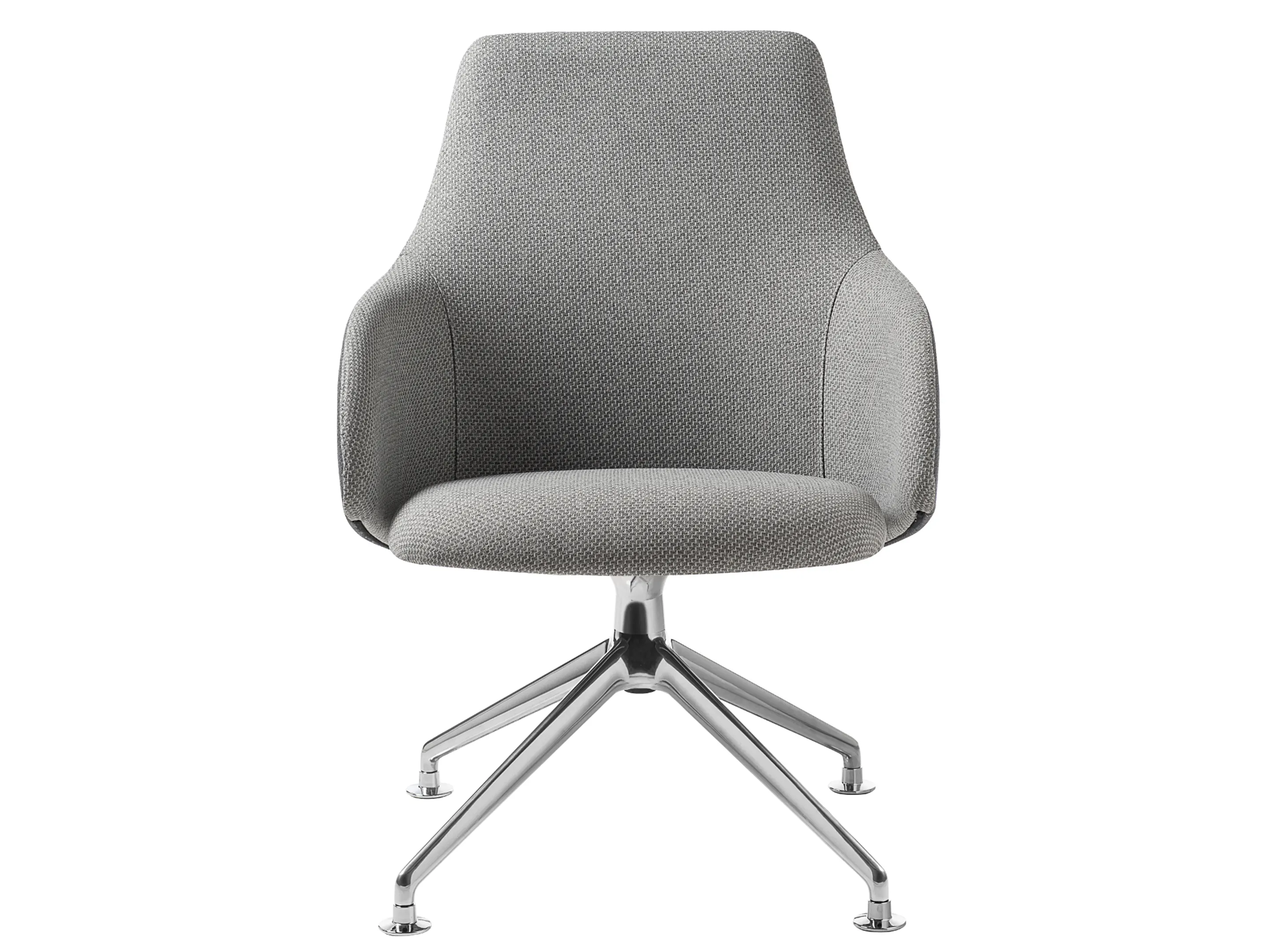 Vergaderstoel met een lage rug met een volledige stoffering op een 4-teens aluminium kruisvoet op glijders. Draaibaar.