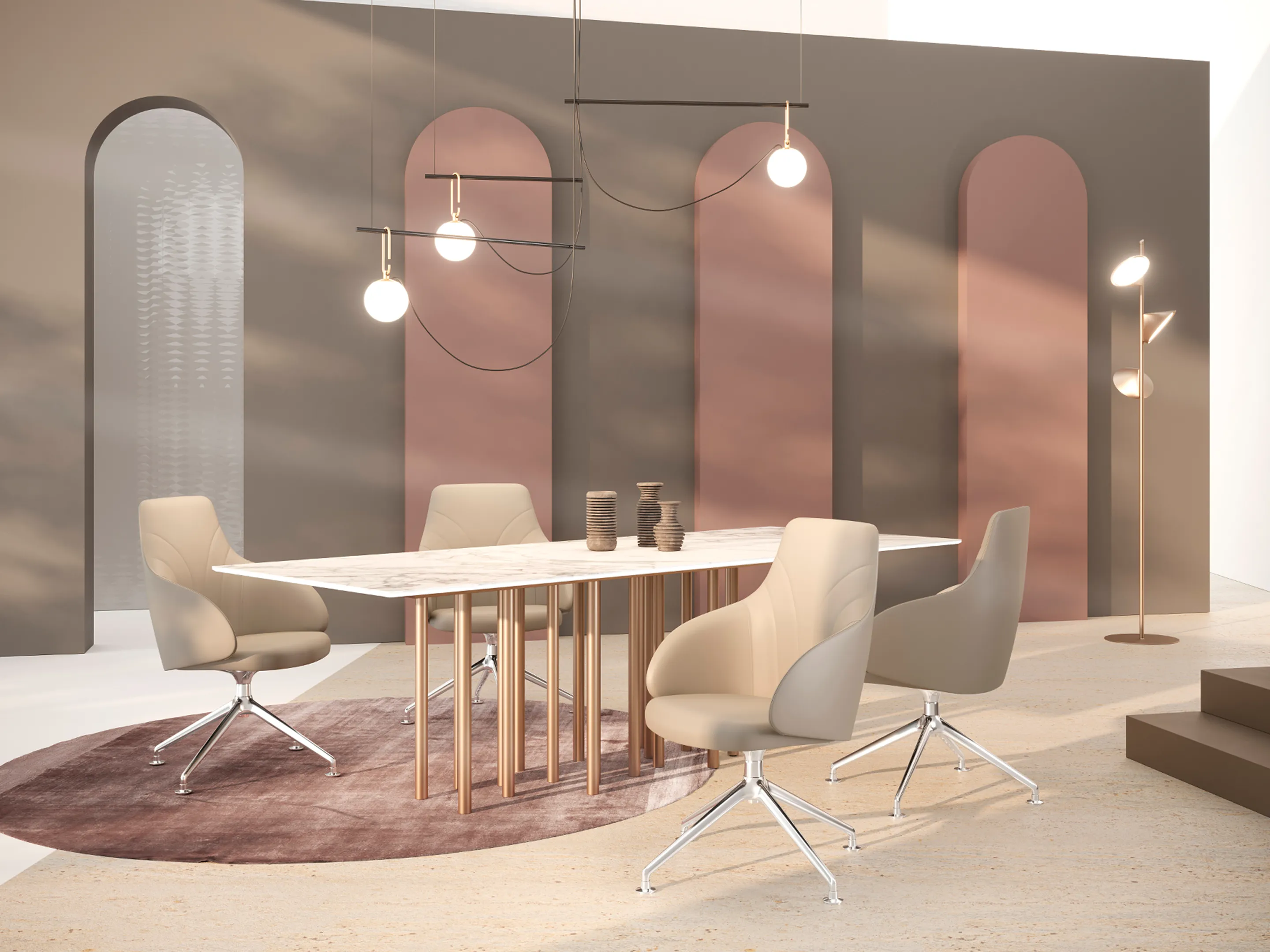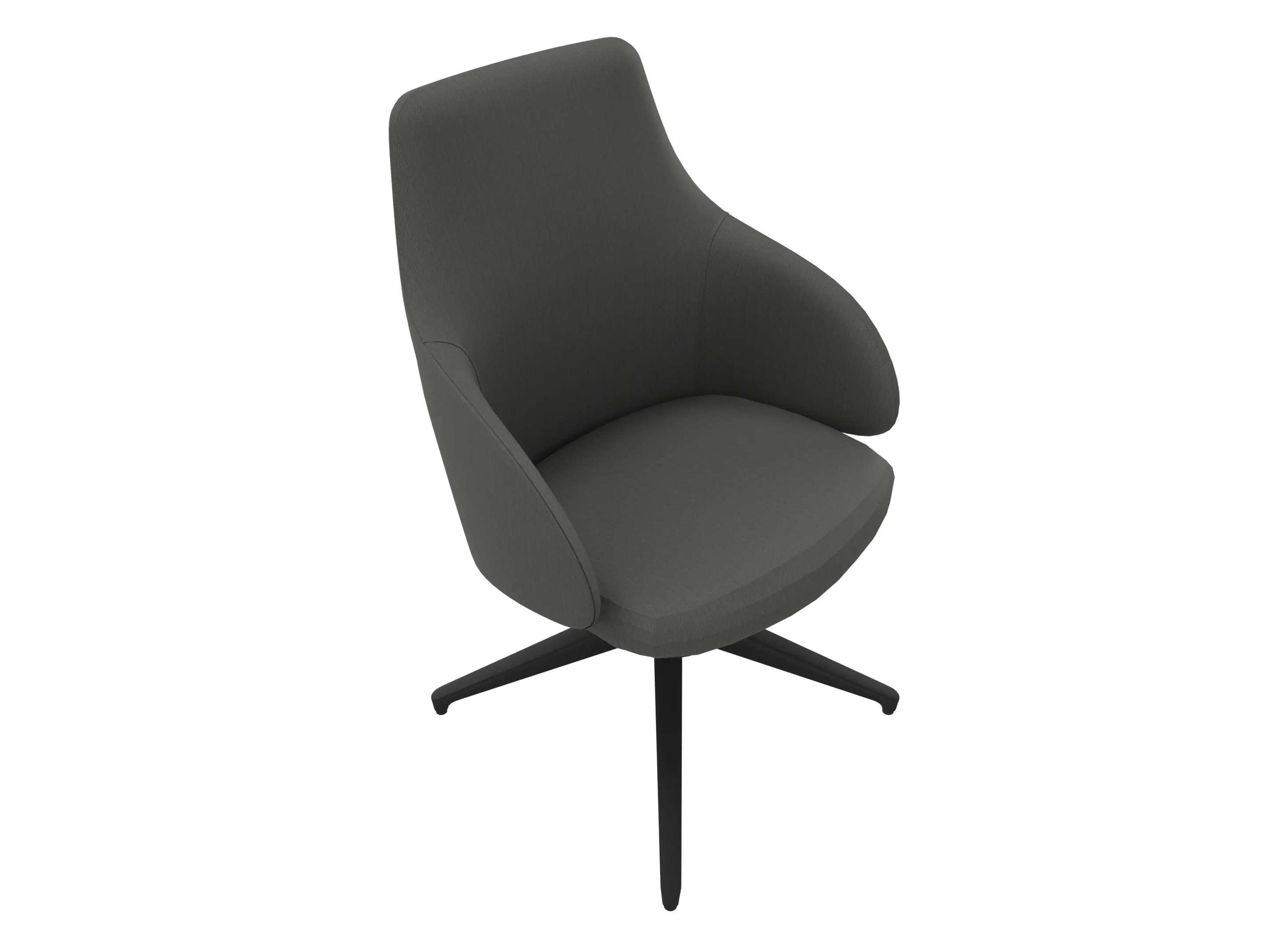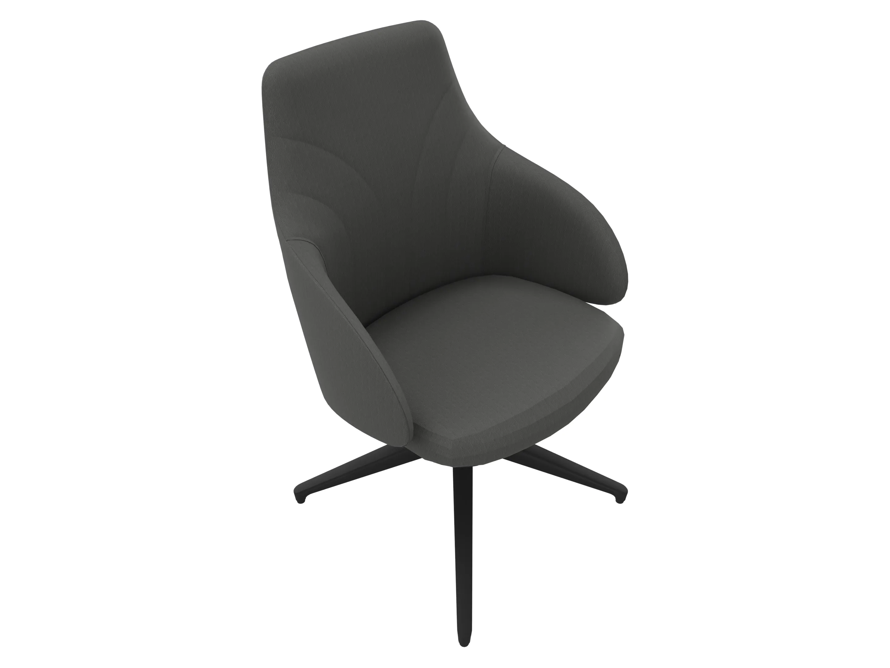 Vergaderstoel met een lage rug met een volledige stoffering op een 4-teens aluminium kruisvoet op glijders. Draaibaar.