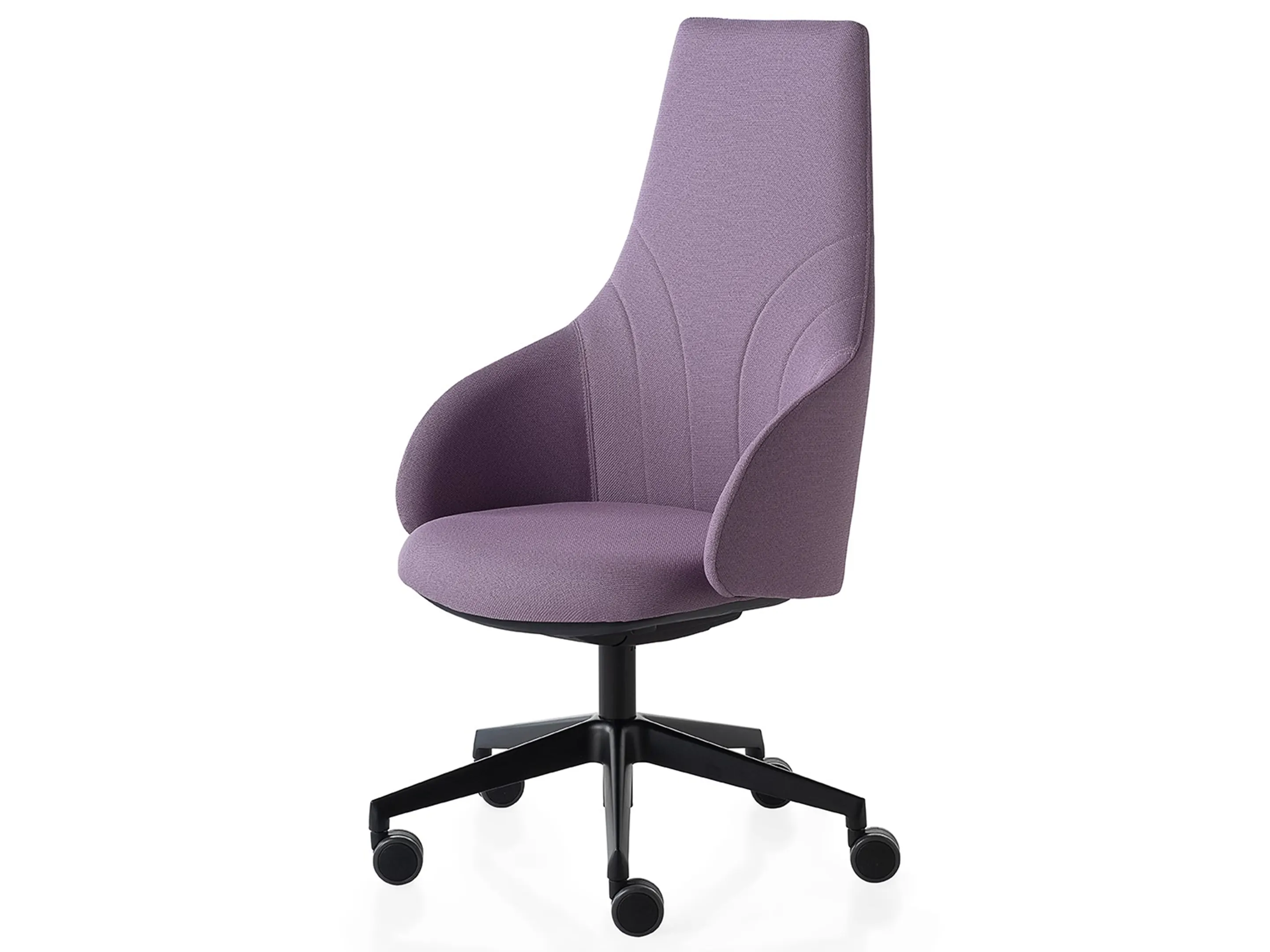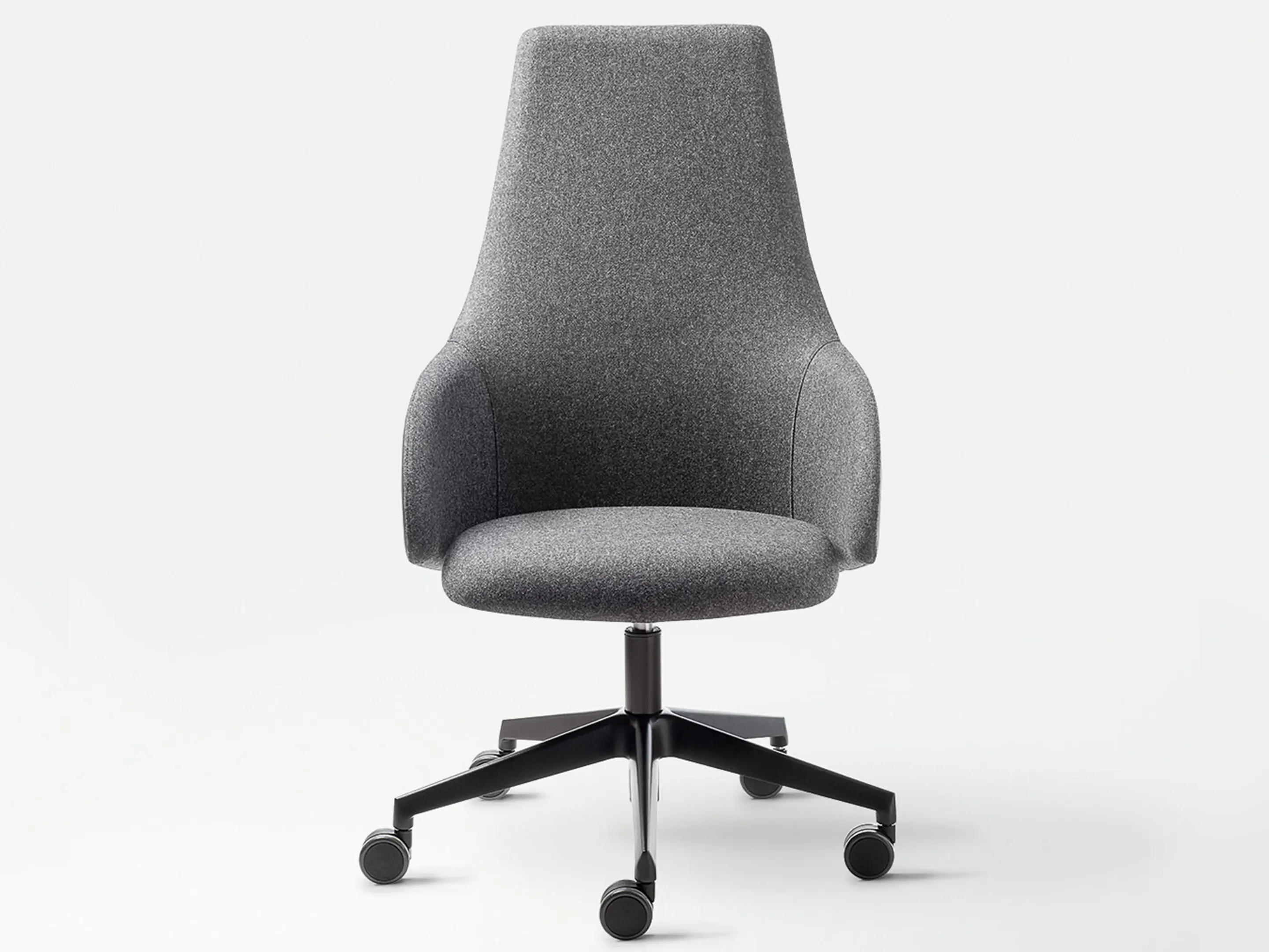 Vergaderstoel met een hoge rug met een volledige stoffering op een 5-teens kruis op wielen. Draaibaar, hoogte-instelbaar.