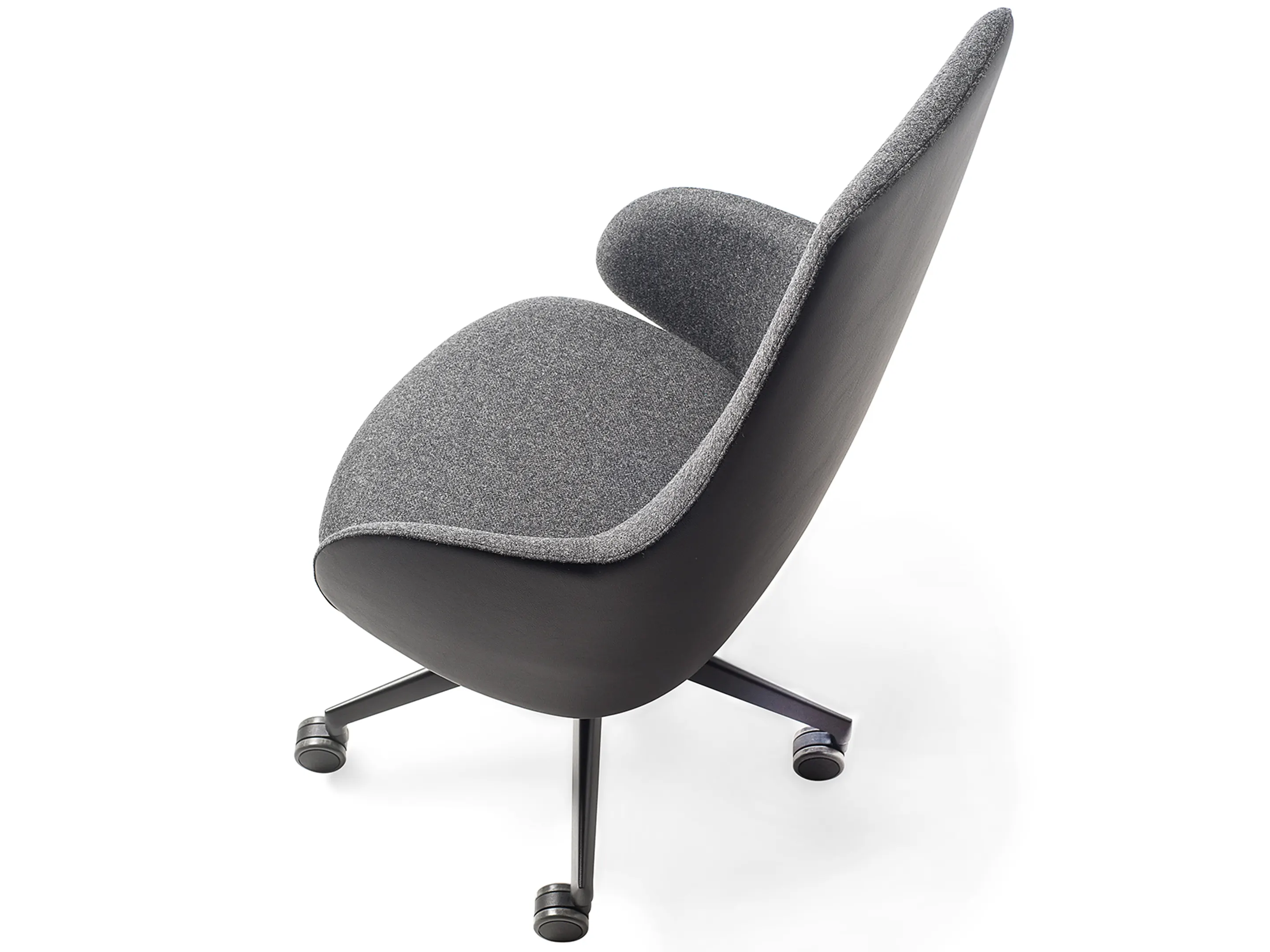 Vergaderstoel met een lage rug met een volledige stoffering op een 5-teens kruis op wielen. Draaibaar, hoogte-instelbaar.