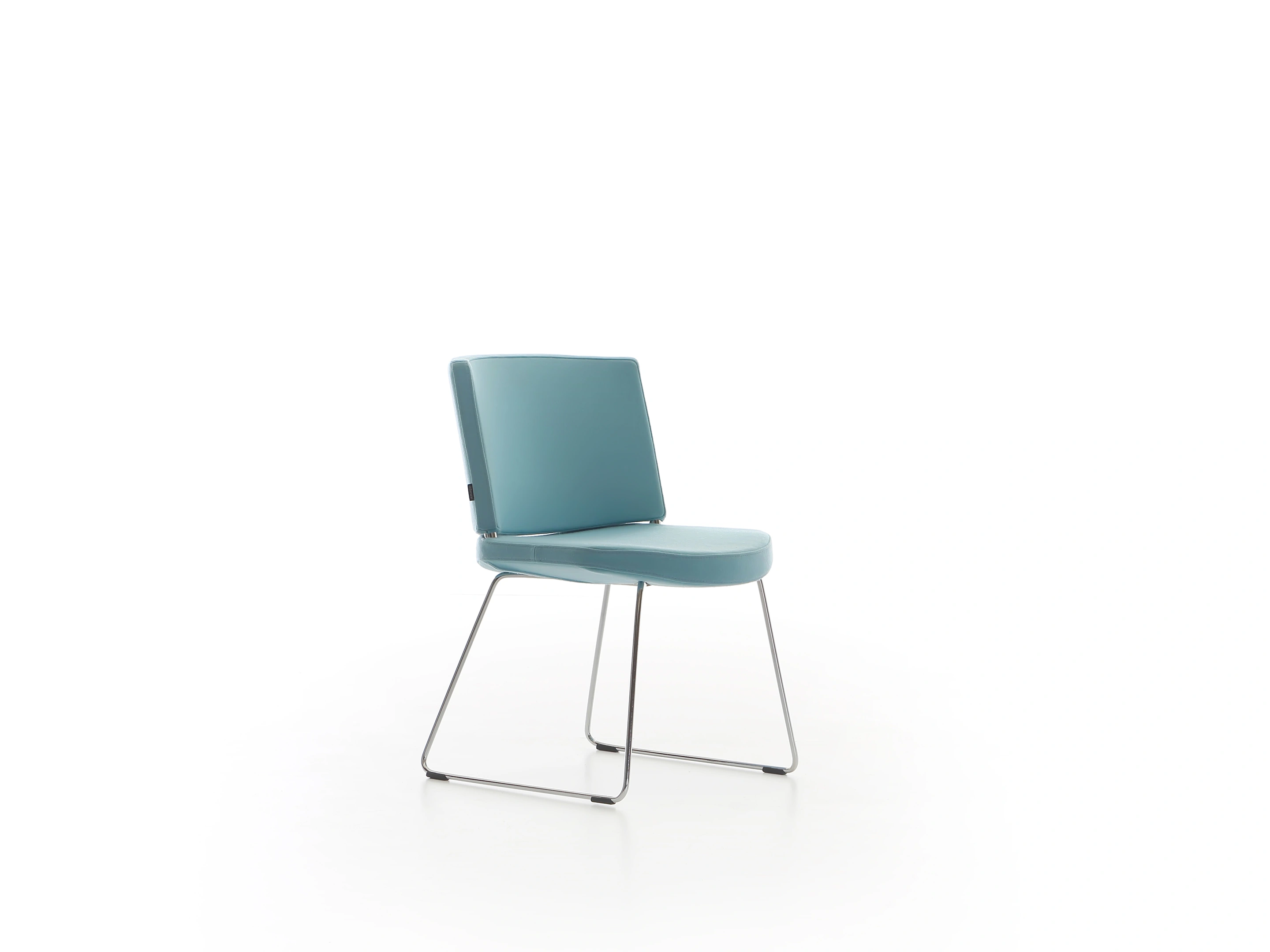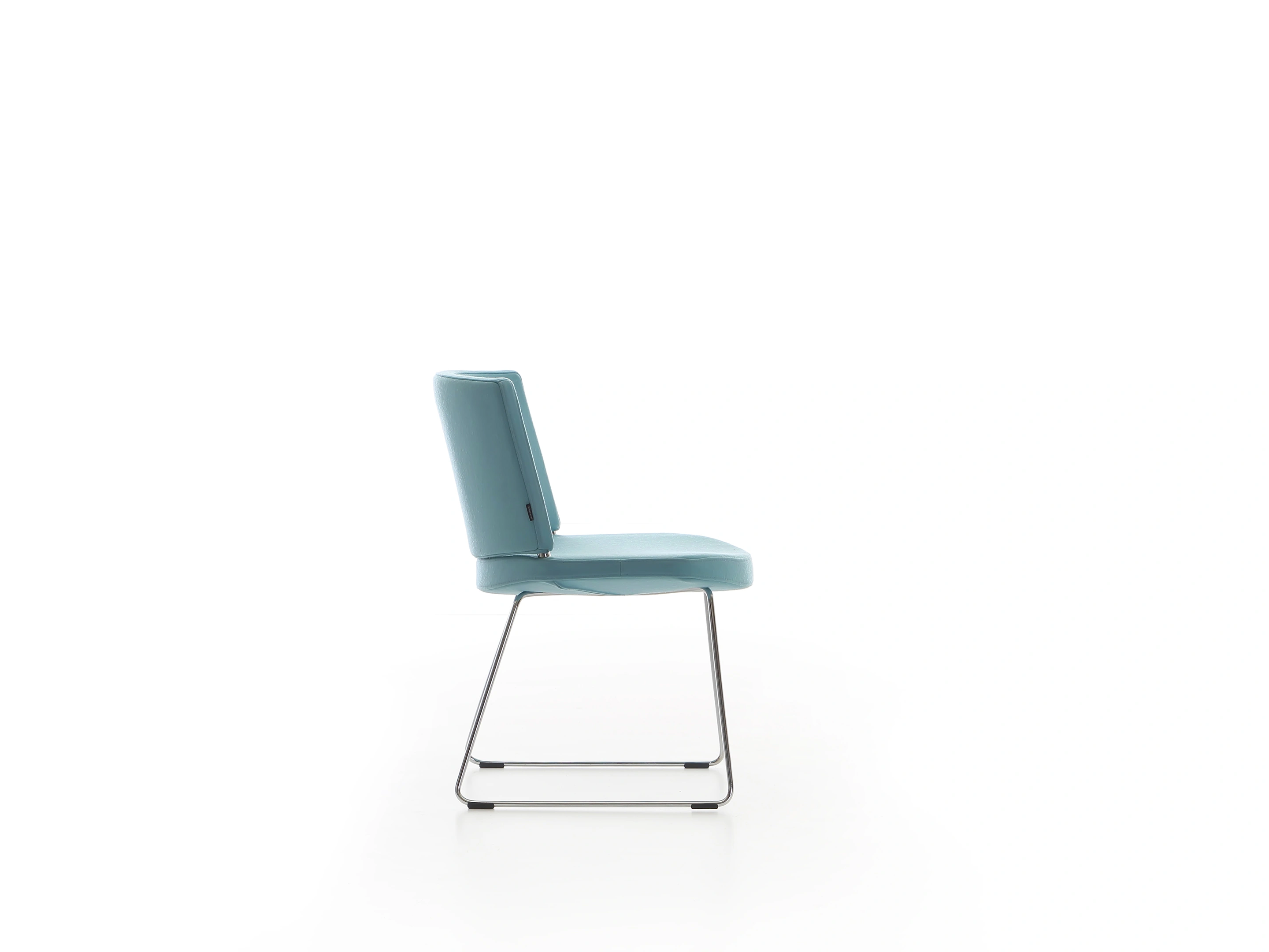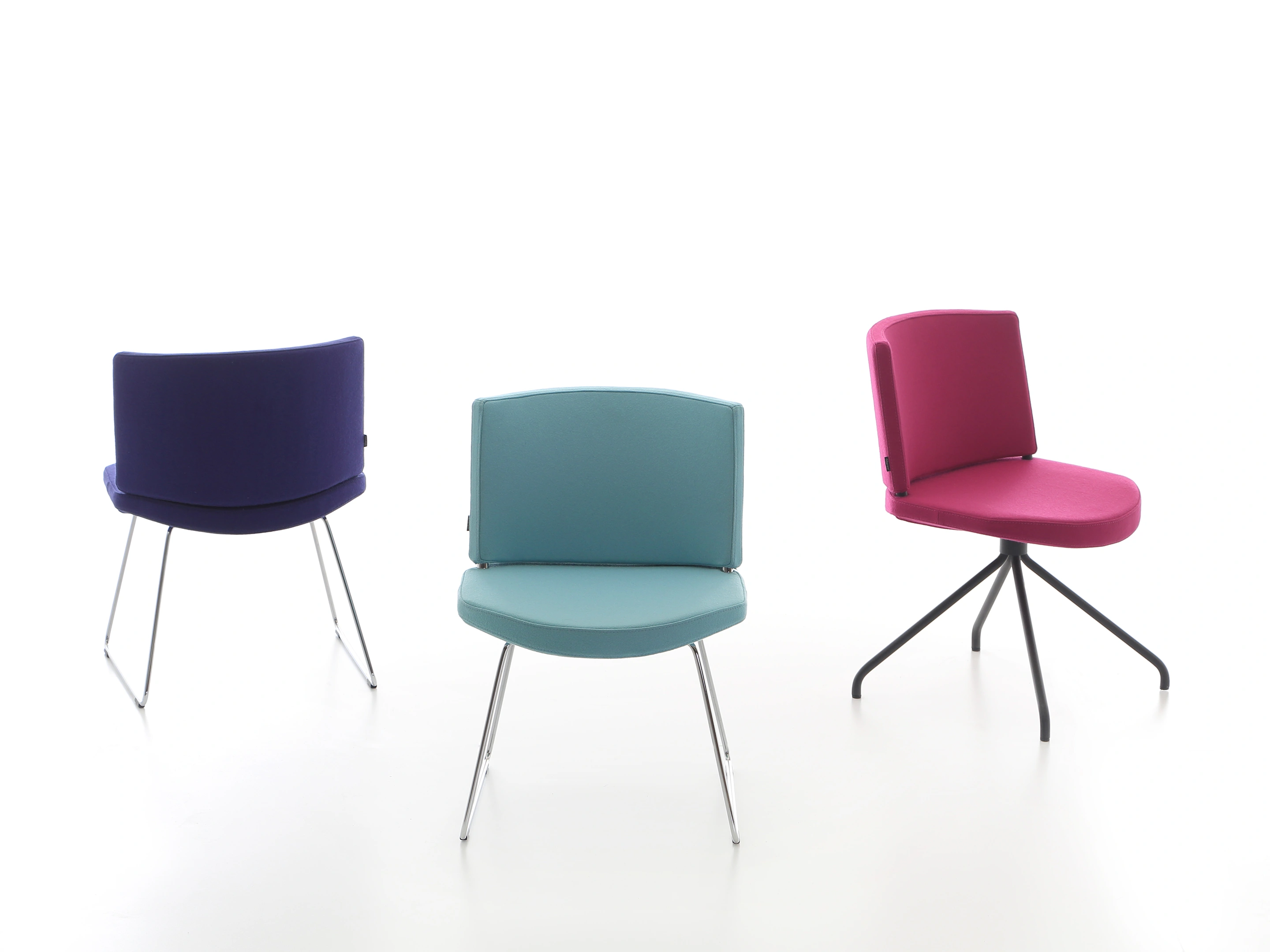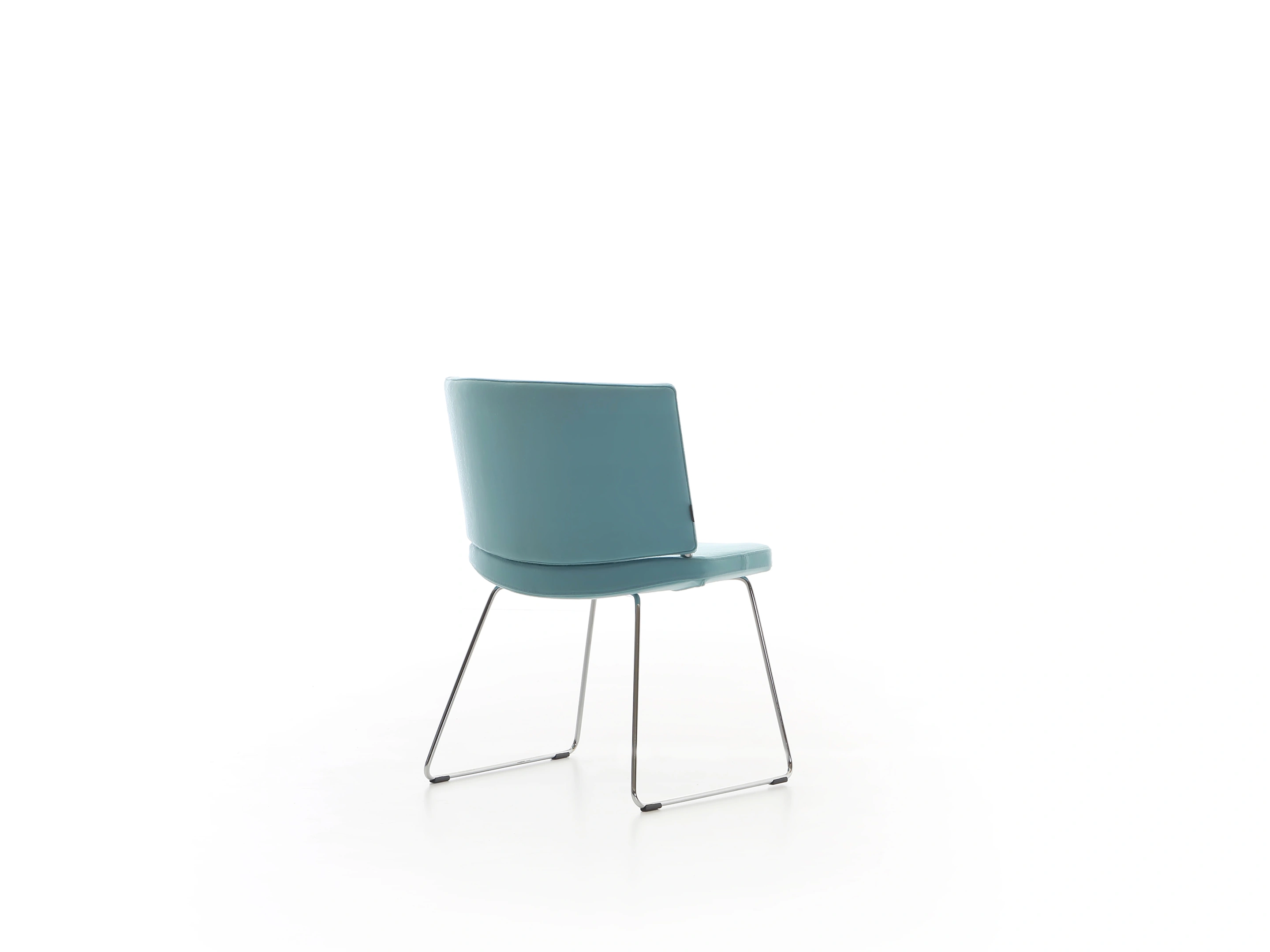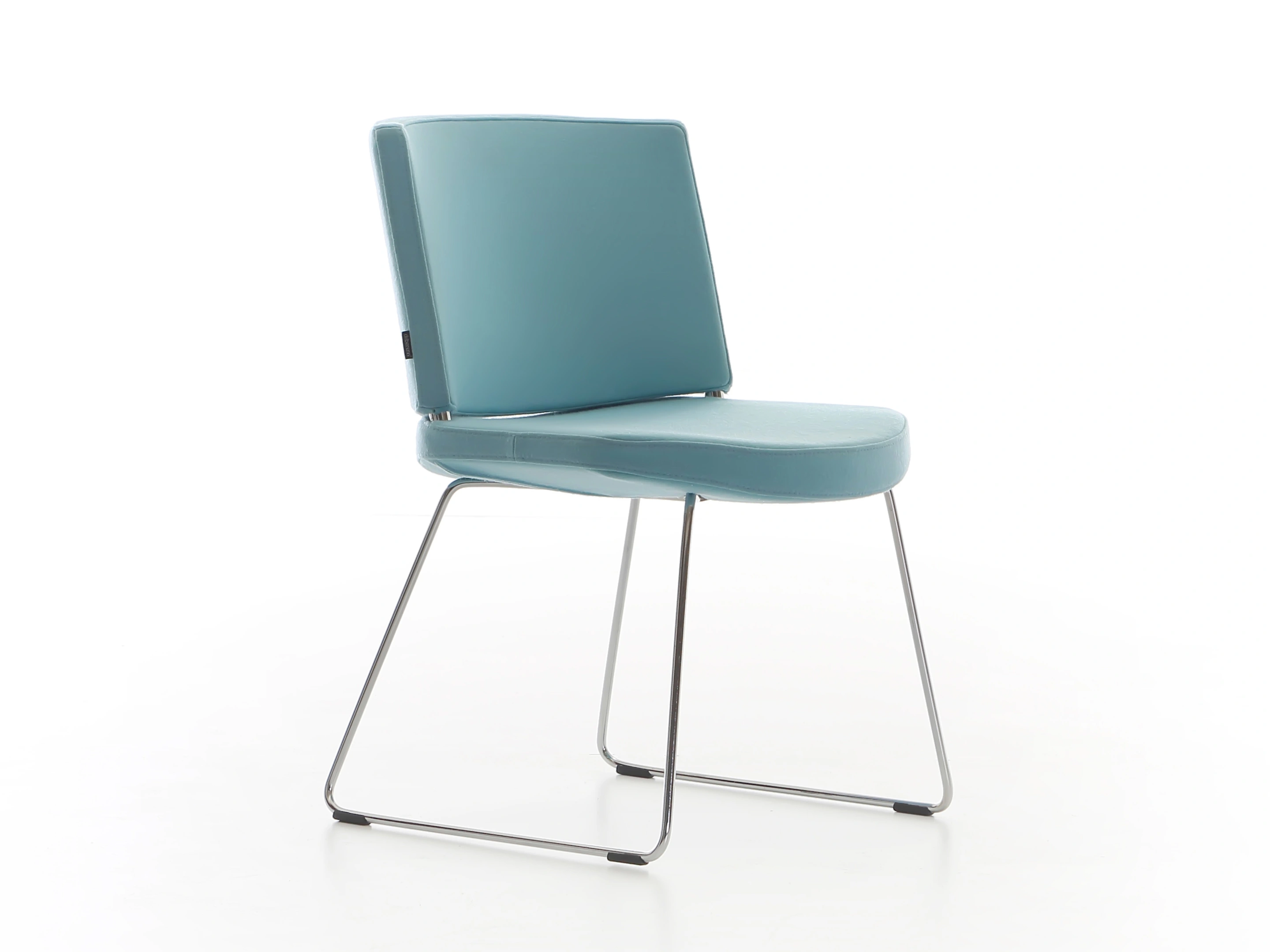 Stoel met volledig gestoffeerde kuip (rug en zitting), op een 4-teens metalen kruis met glijders.