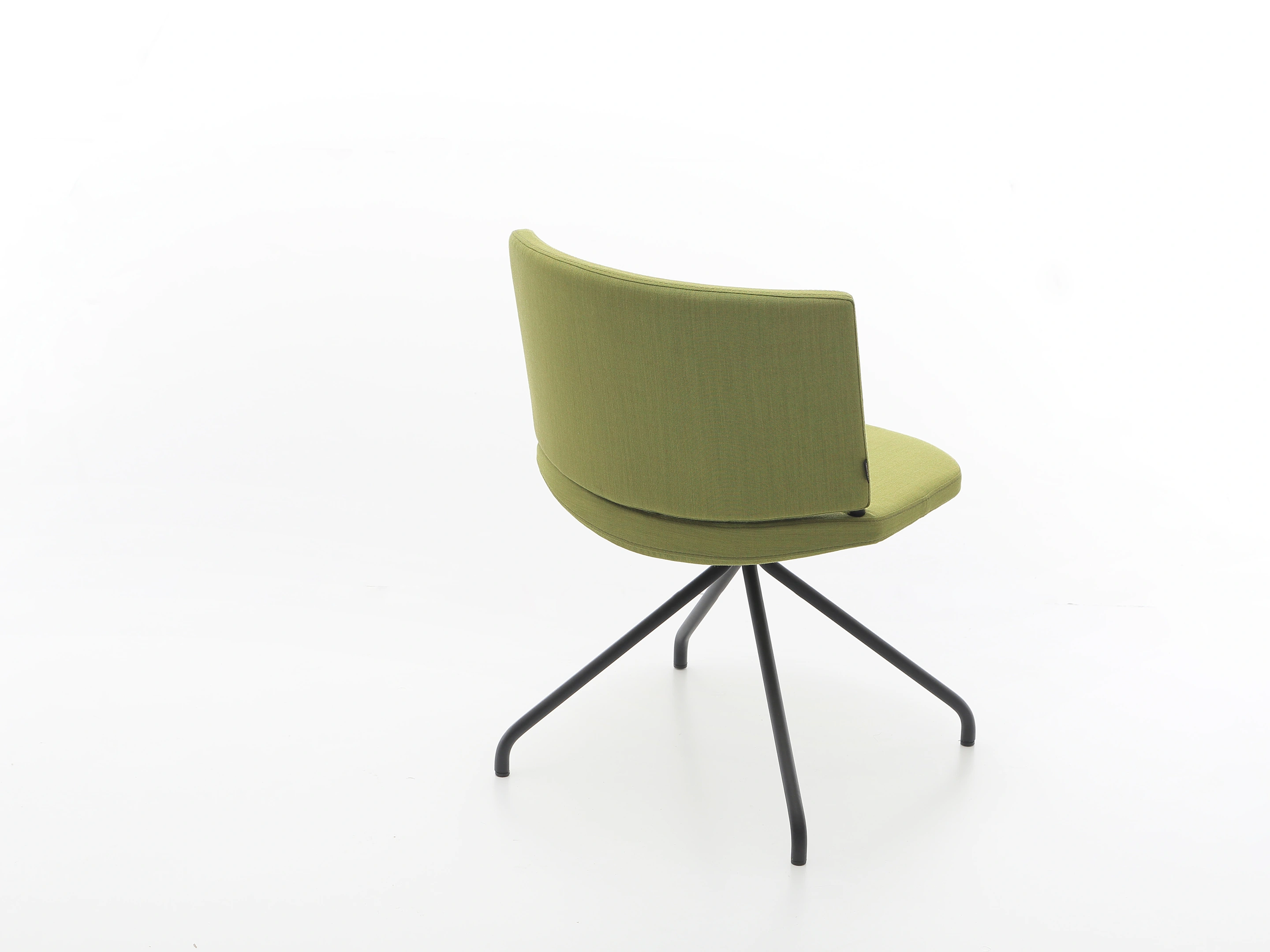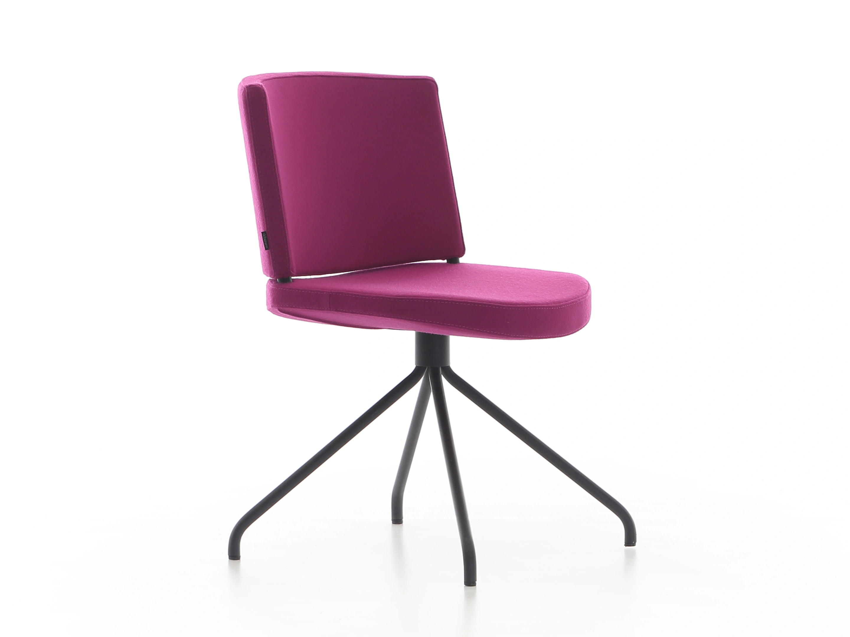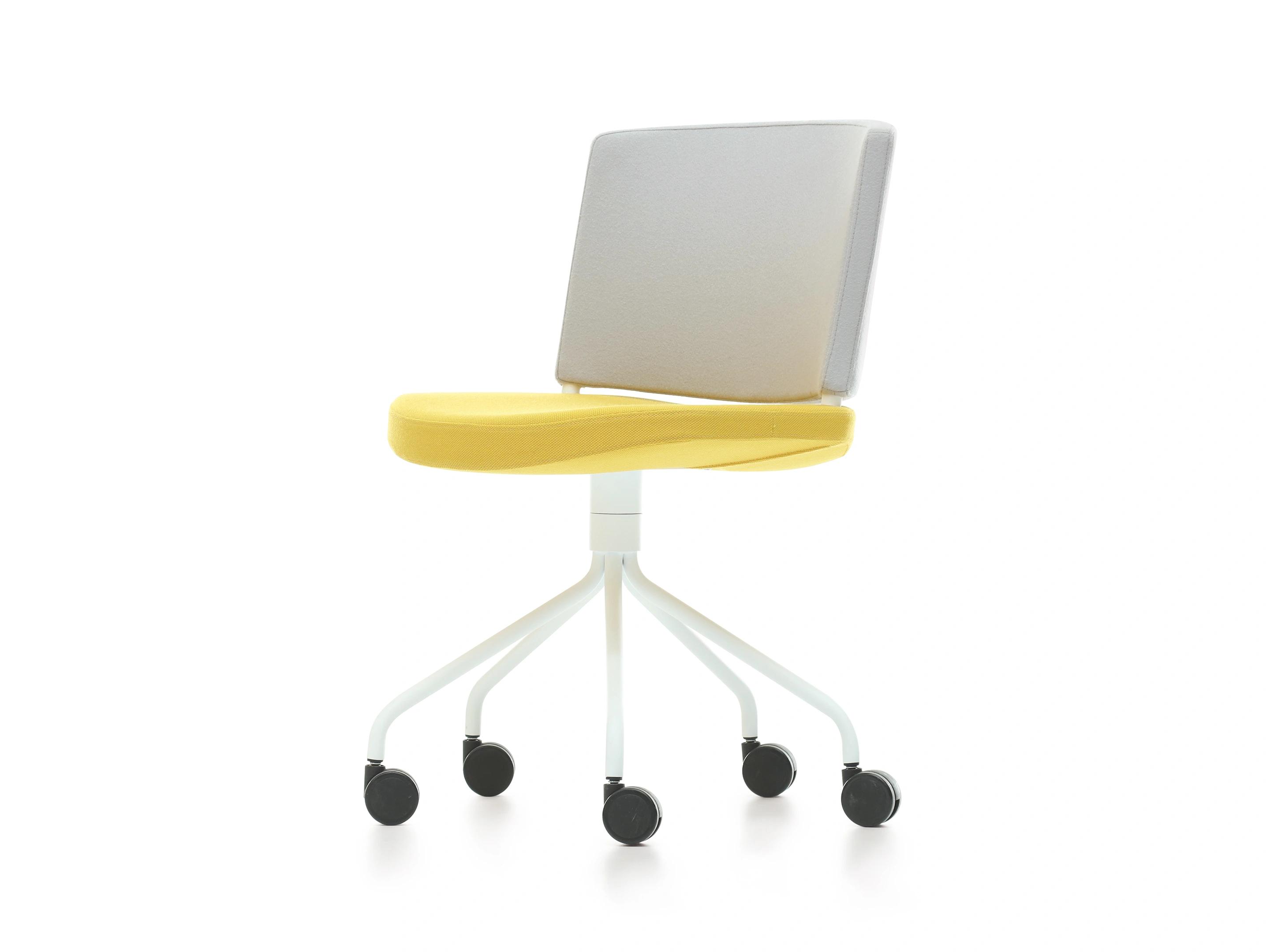 Stoel met volledig gestoffeerde kuip (rug en zitting), op een 5-teens metalen kruis met wielen.
