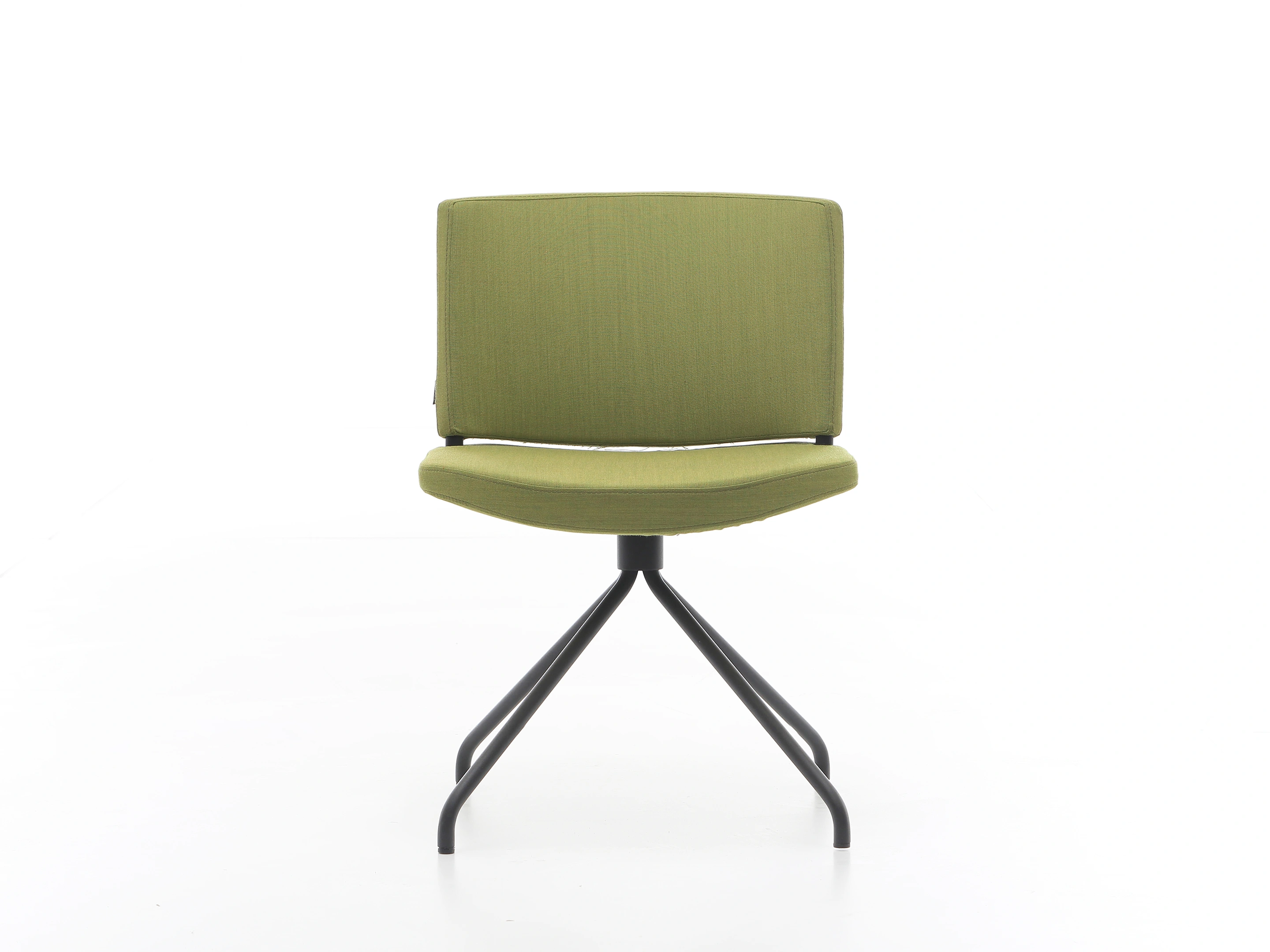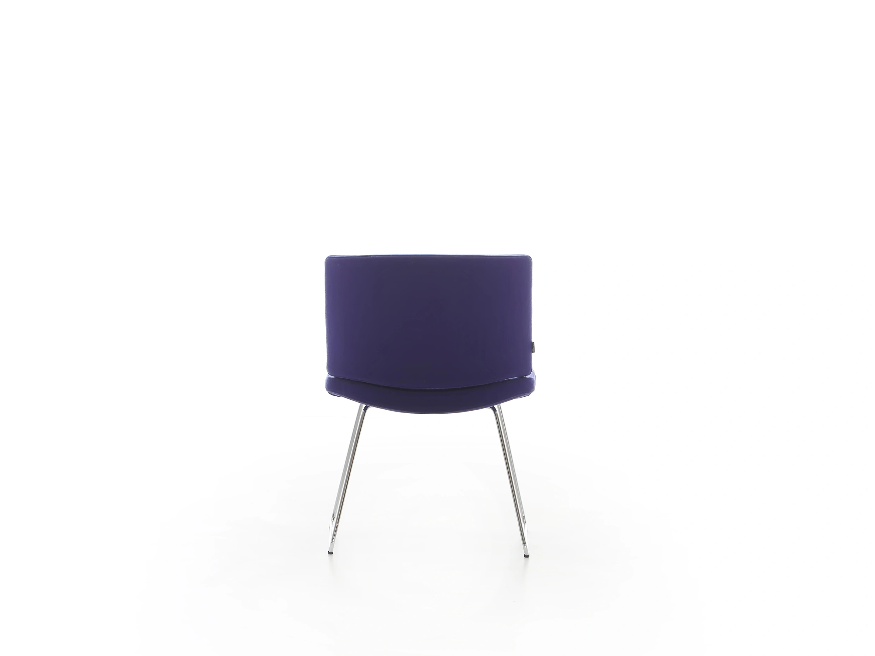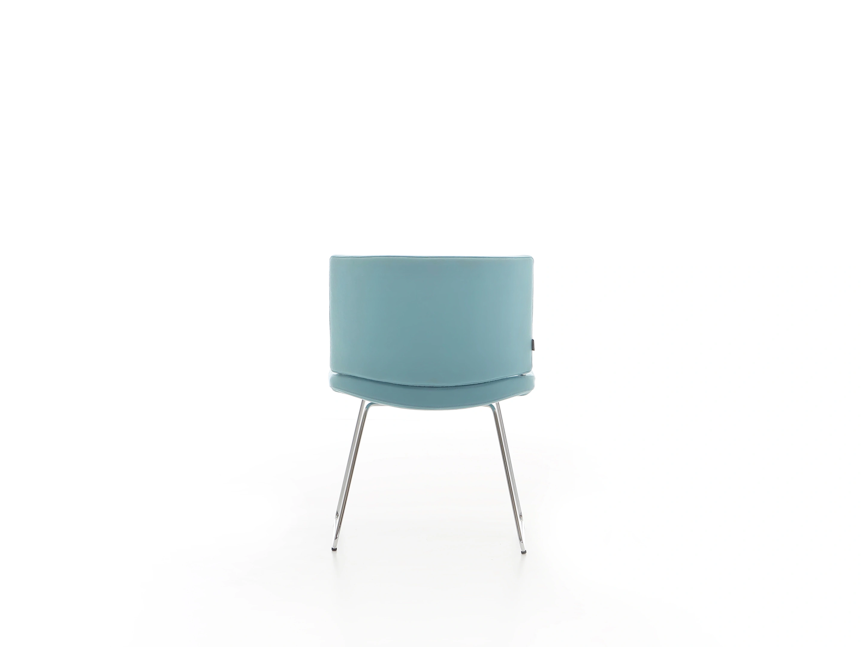 Stoel met volledig gestoffeerde kuip (rug en zitting), op een 4-teens metalen kruis met glijders.