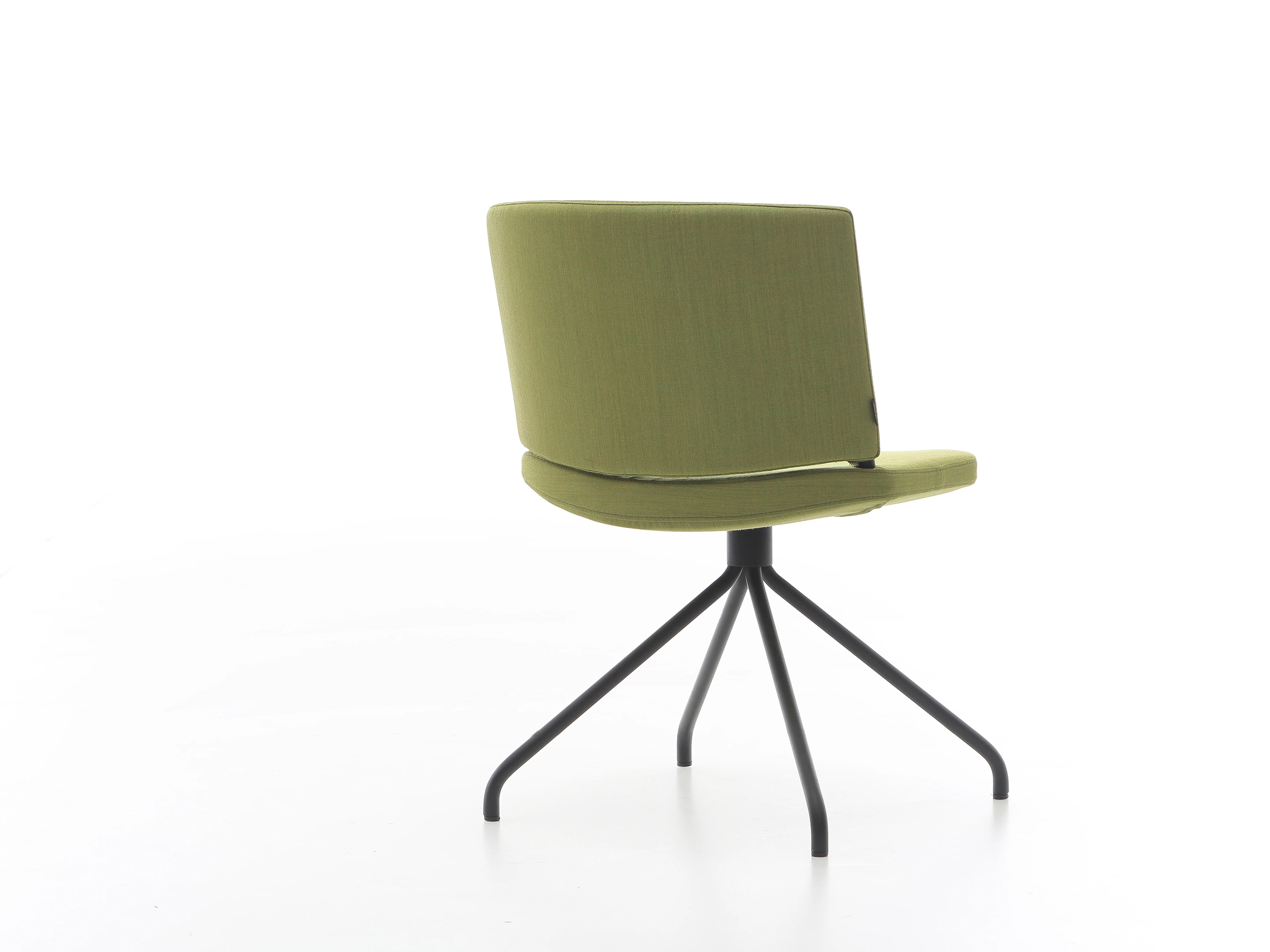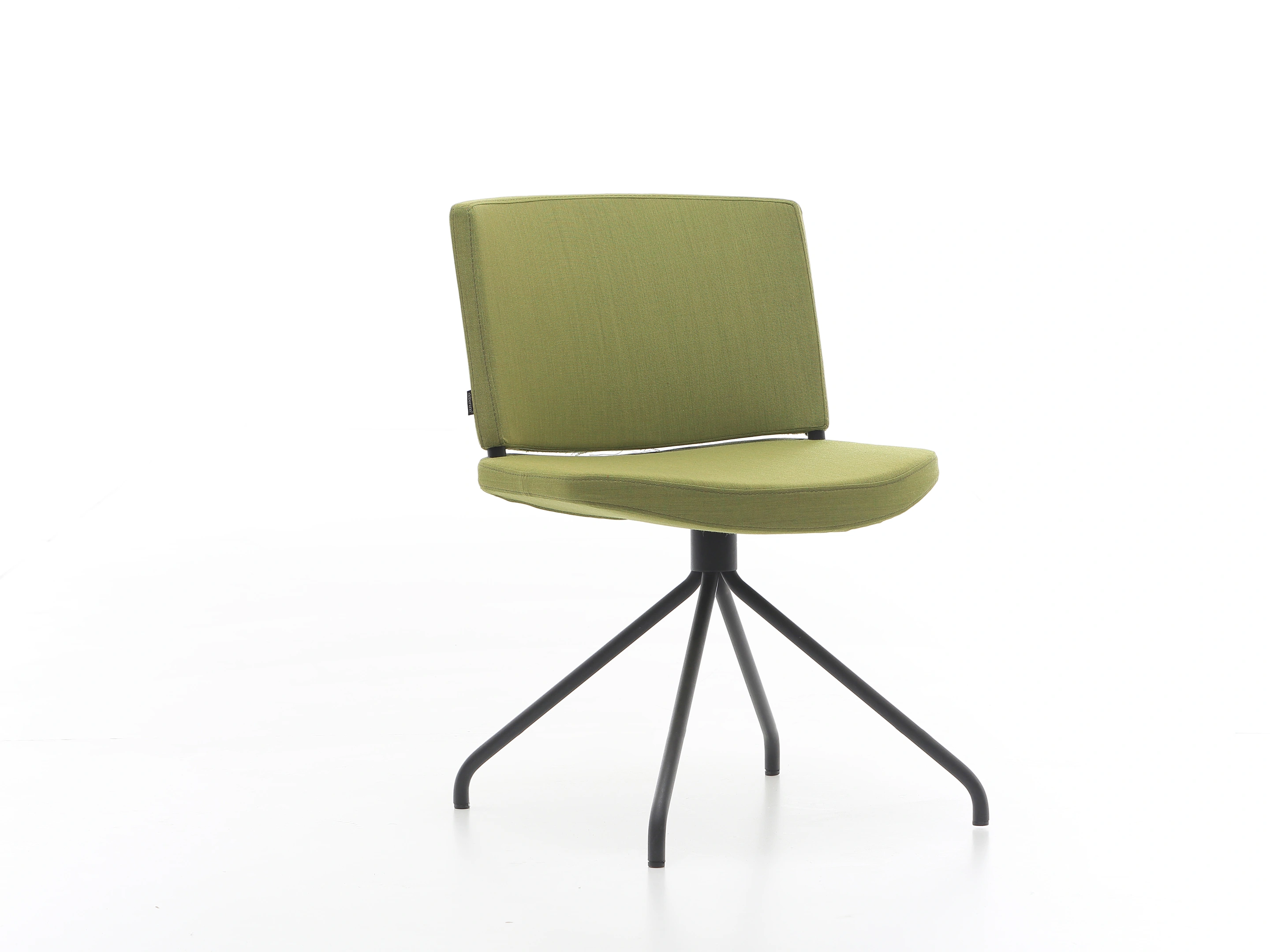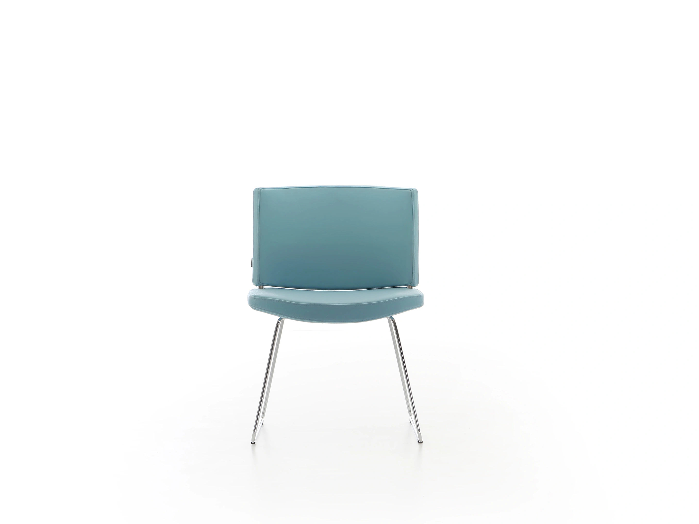 Stoel met volledig gestoffeerde kuip (rug en zitting), op een 4-teens metalen kruis met glijders.
