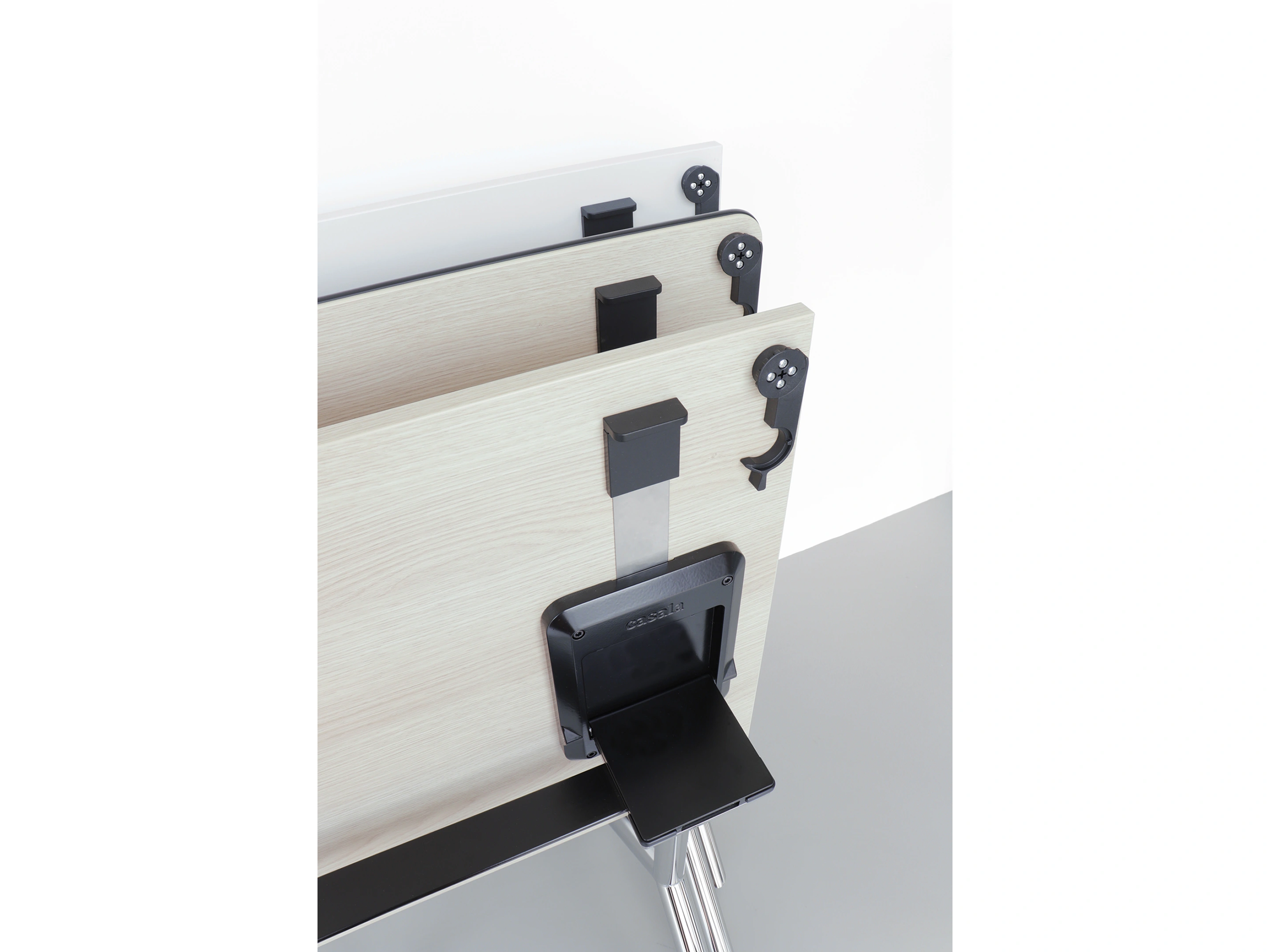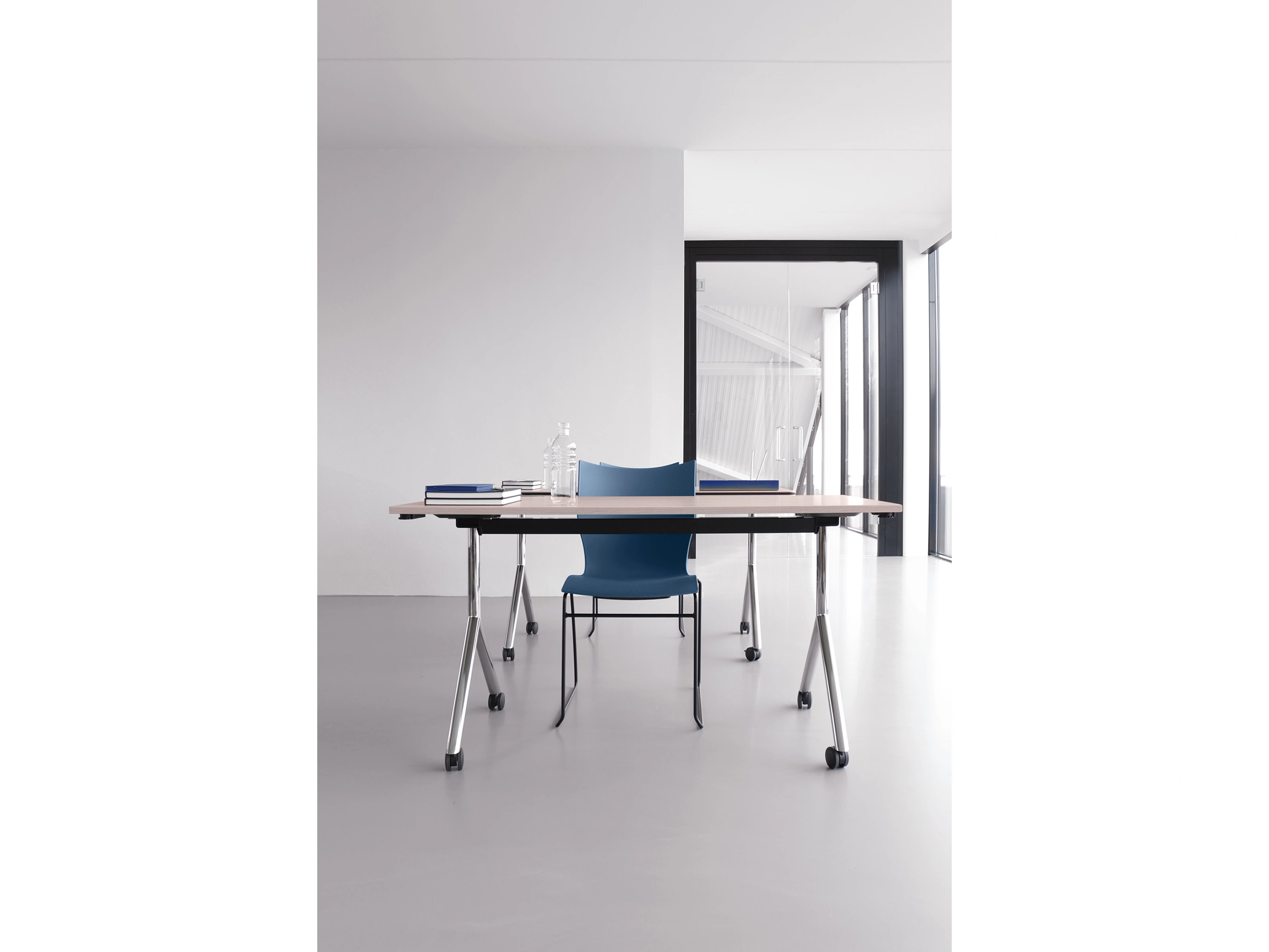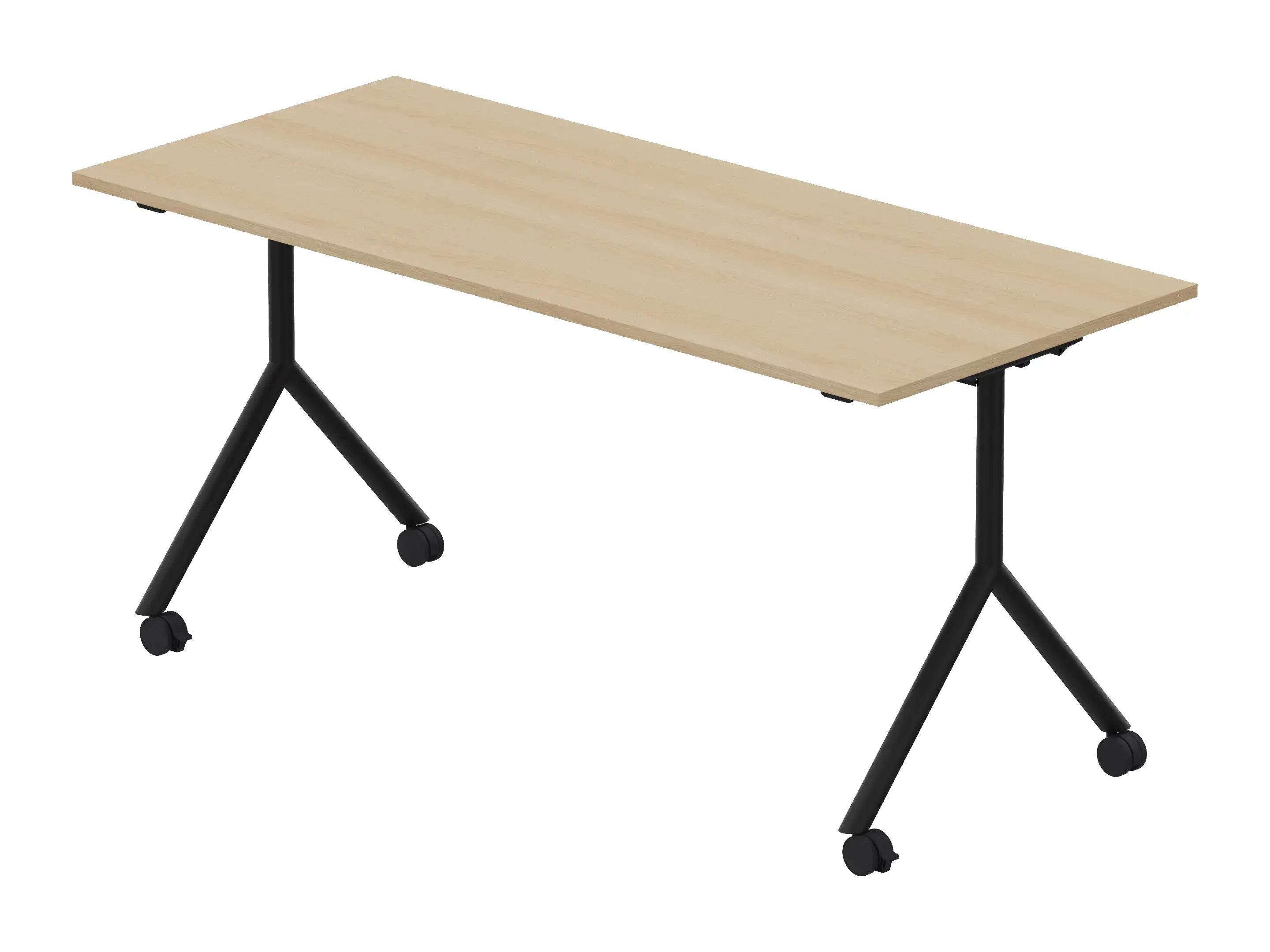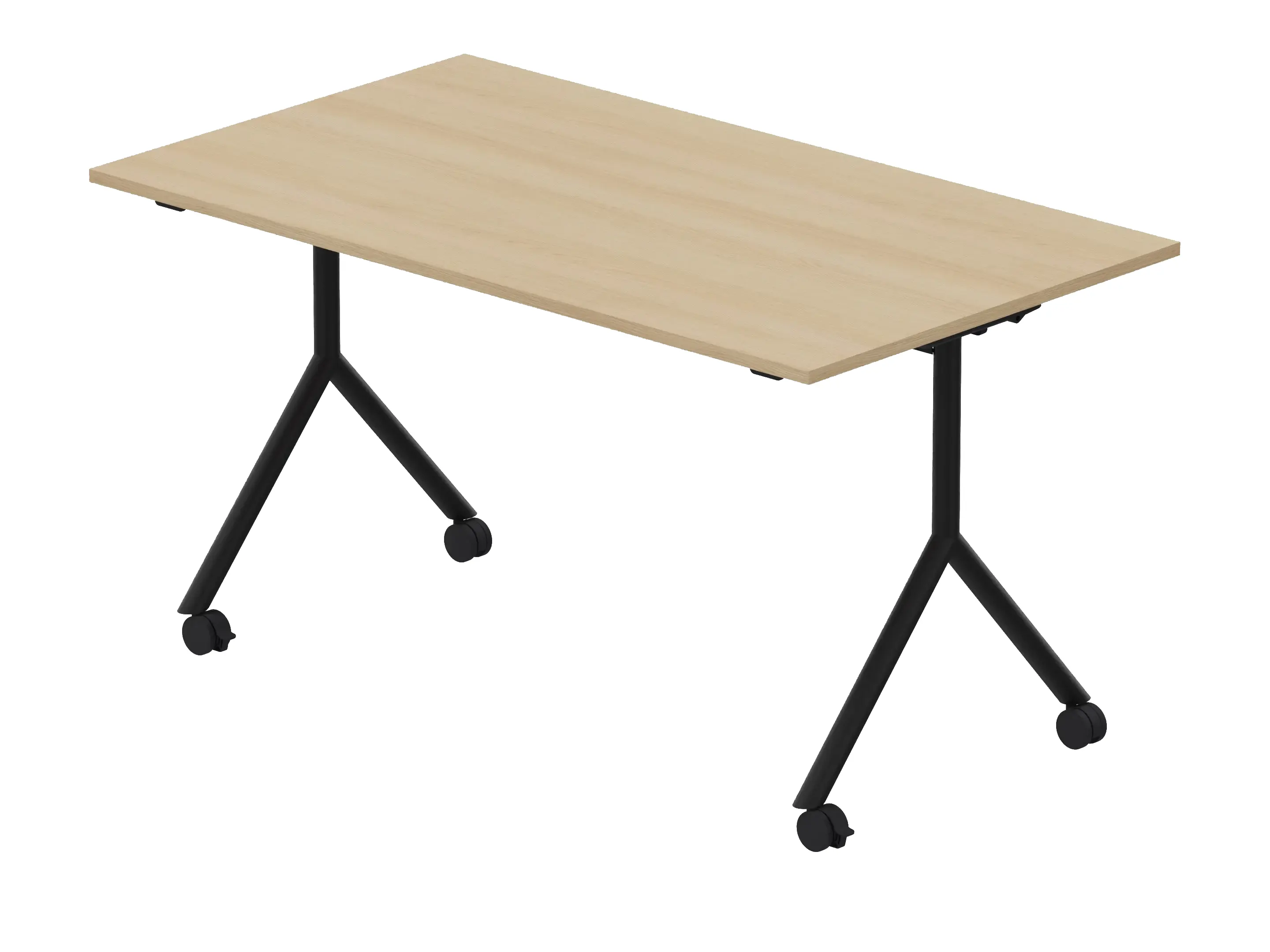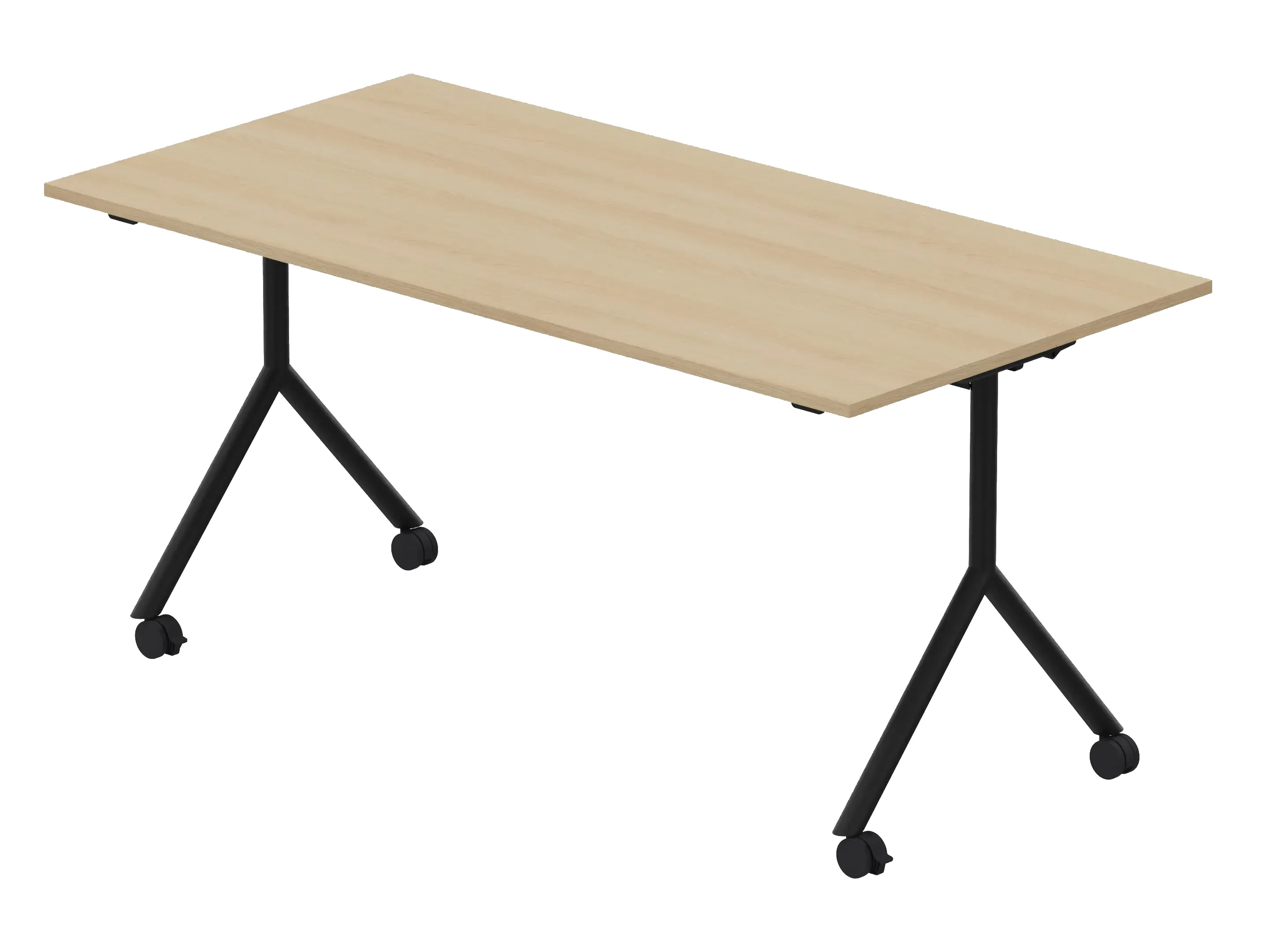 Klaptafel met 4-poots frame voorzien van wielen, waarvan 2 geremd zijn.