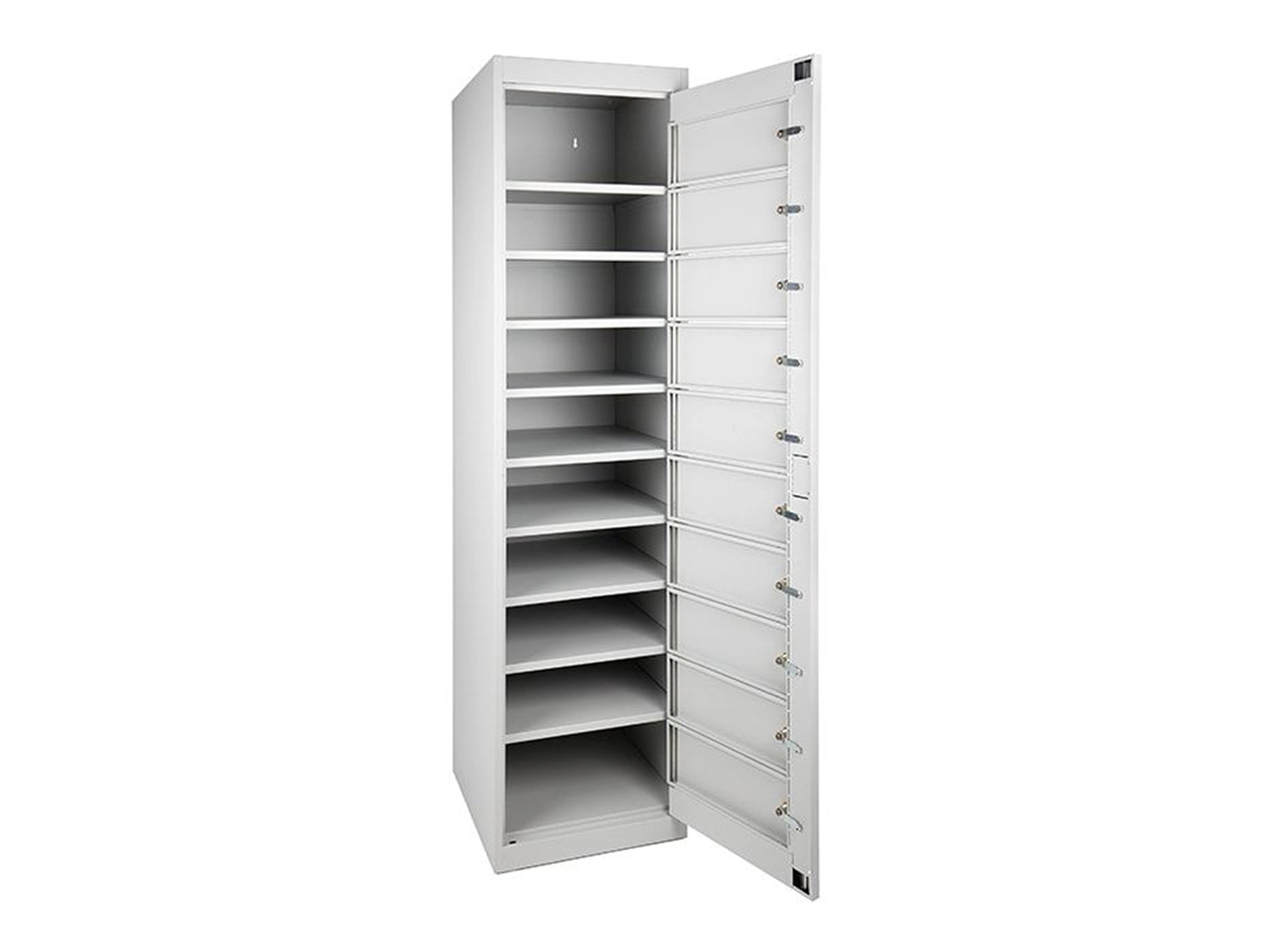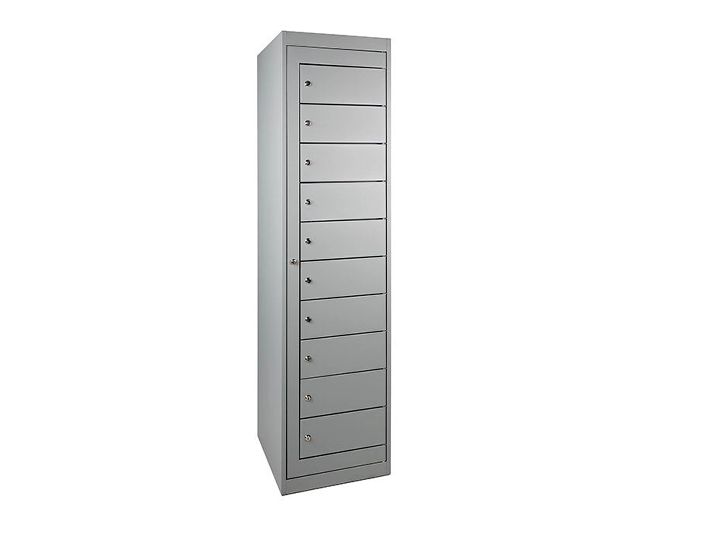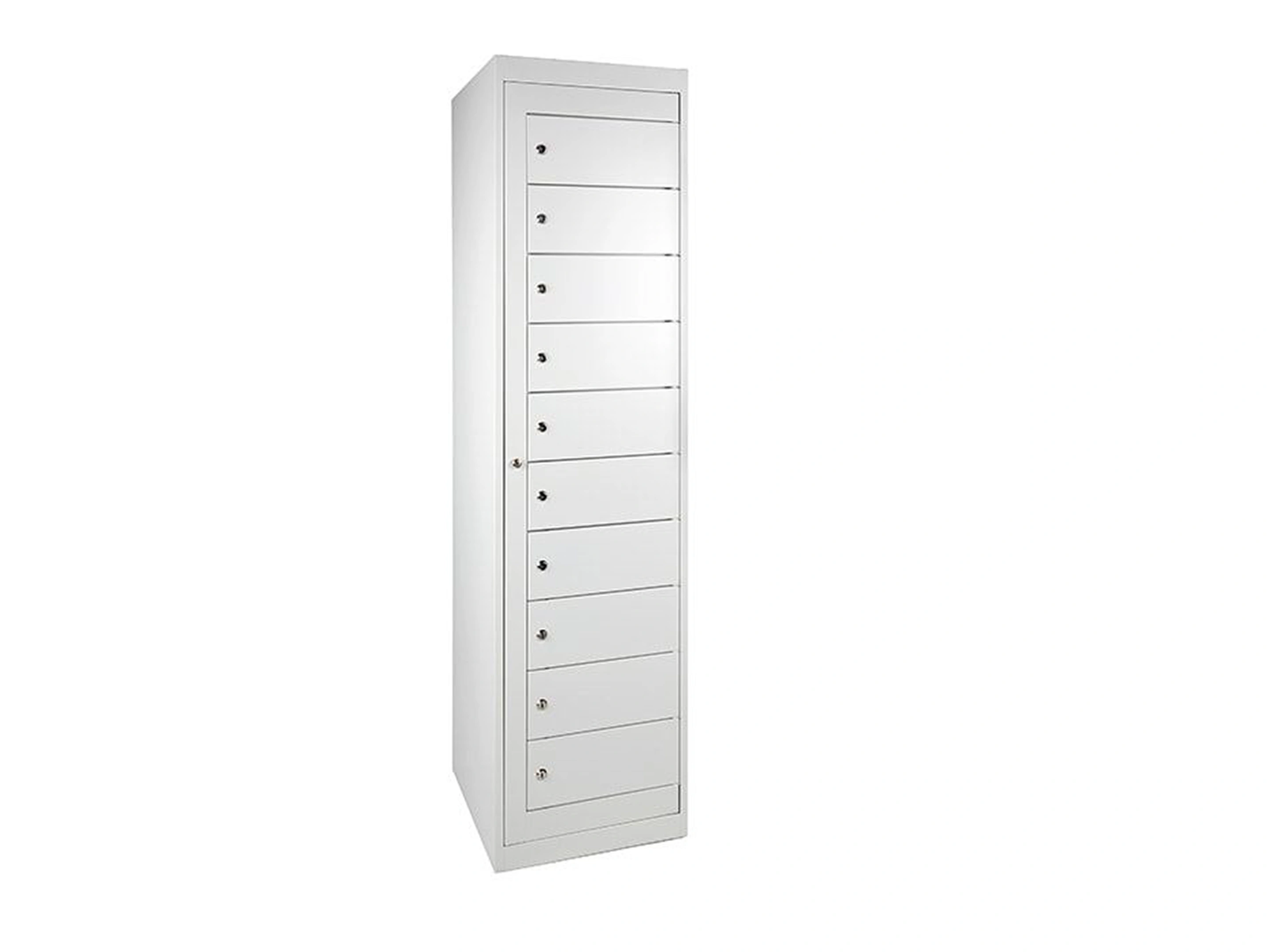 Laptopkast voorzien van 10 afsluitbare locker en 1 masterdeur, uitgevoerd met cilindersluiting inclusief 2 sleutels, met laadstation 220v aansluiting, met centrale aan/uit knop en 2 meter stroomkabel