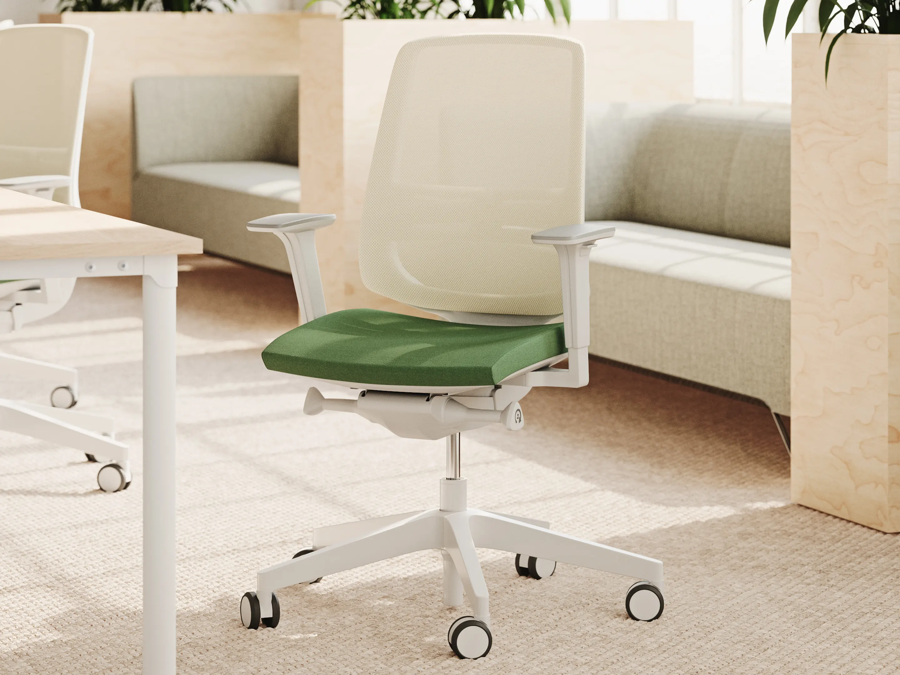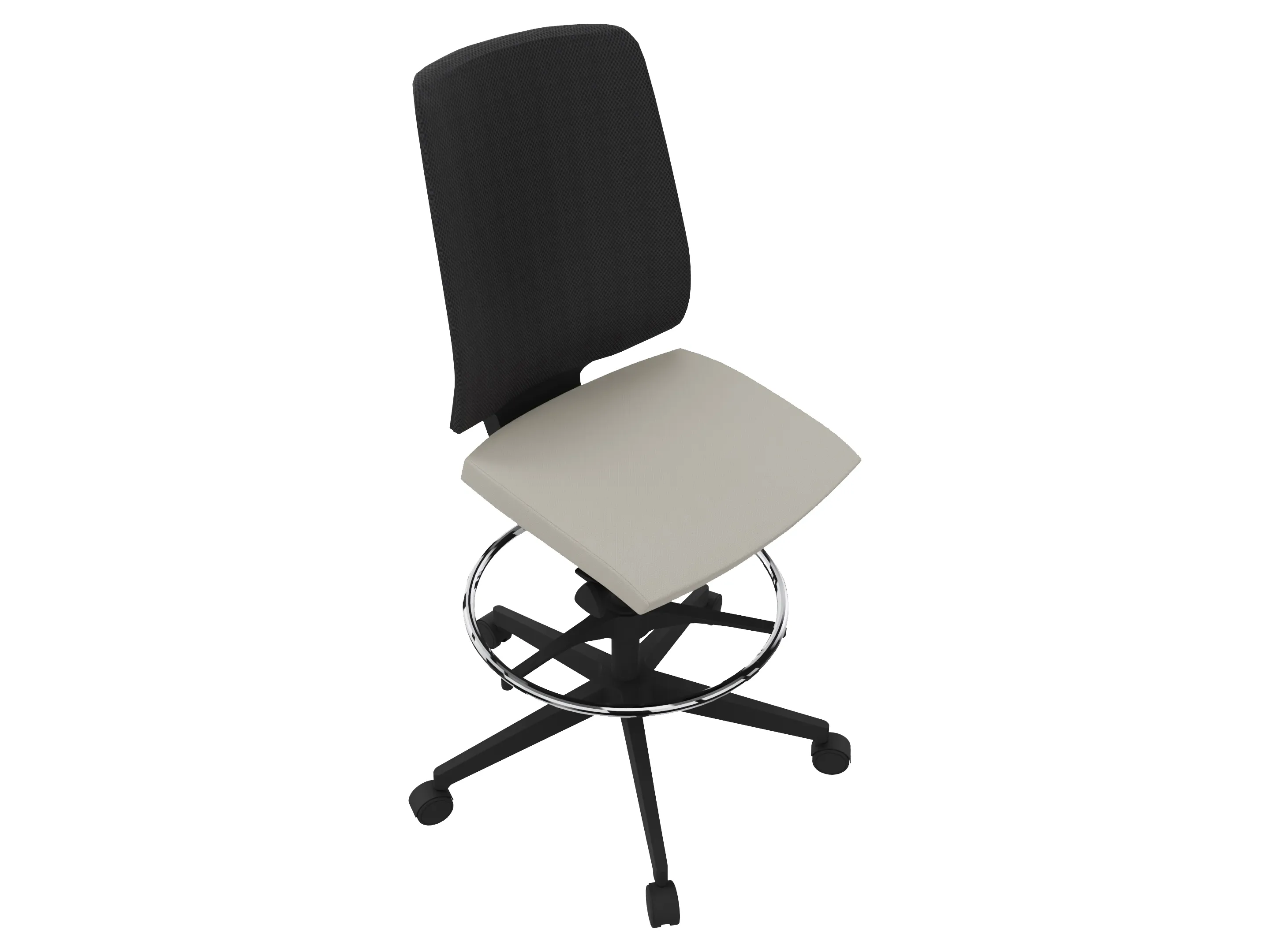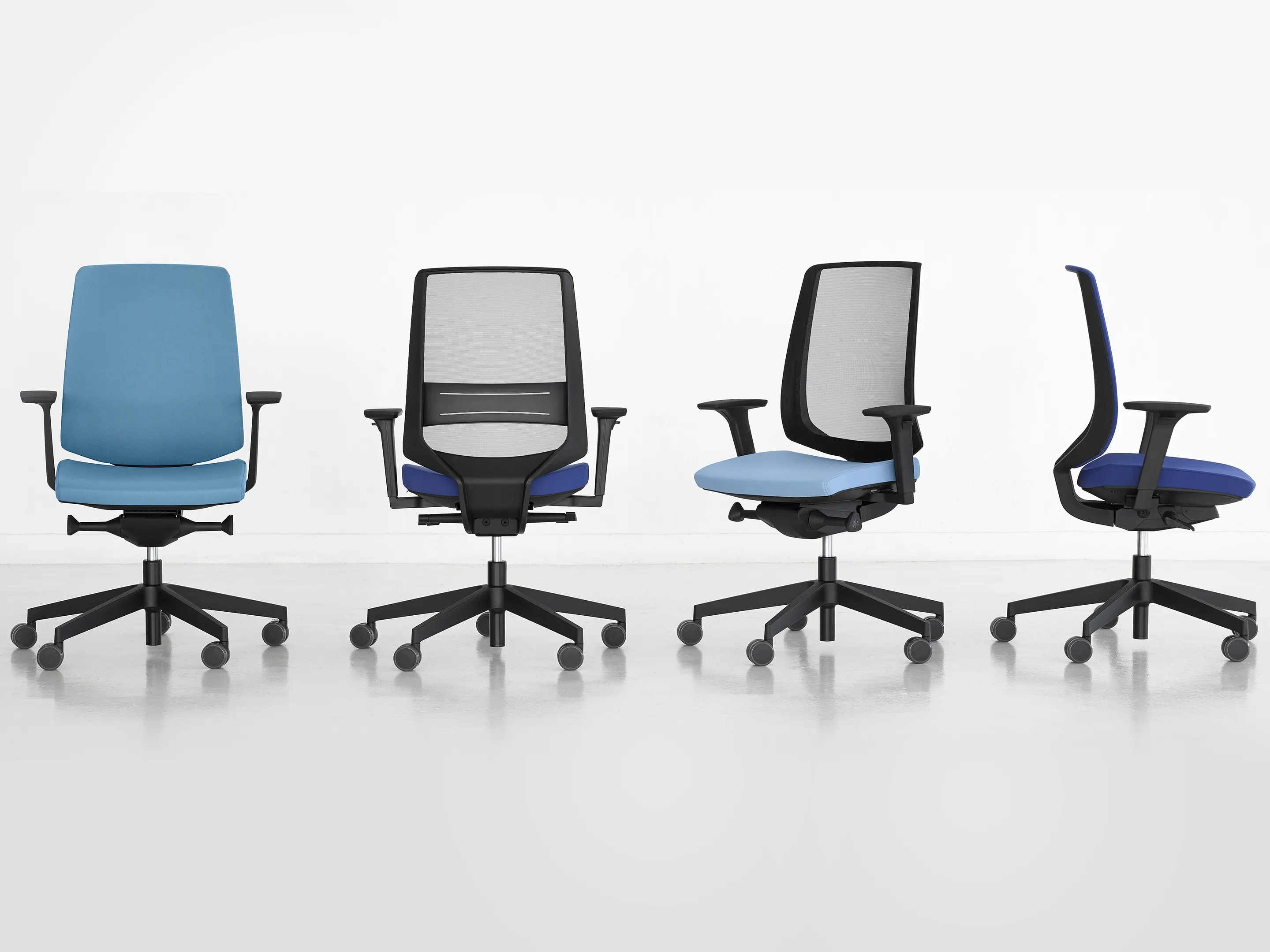 Bureaustoel met gestoffeerde zitkussen en mesh rug op een 5-teens kruis met synchro mechanisme. Standaard zonder armleggers.