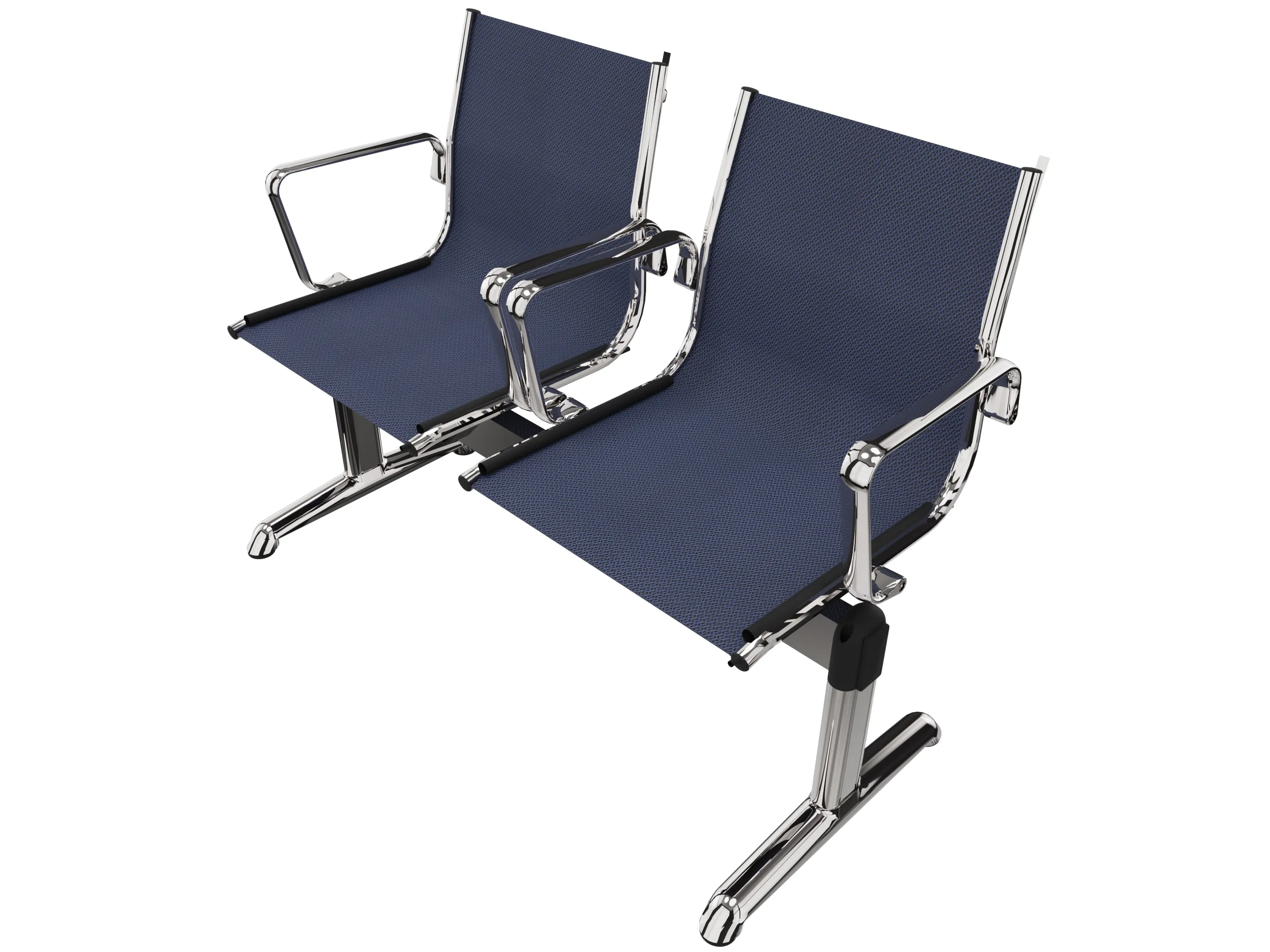 Wachtkamerbank in "mesh" 2-zits uitvoering "mesh", met 2 poten, en zonder armsteunen. Frame altijd verchroomd.