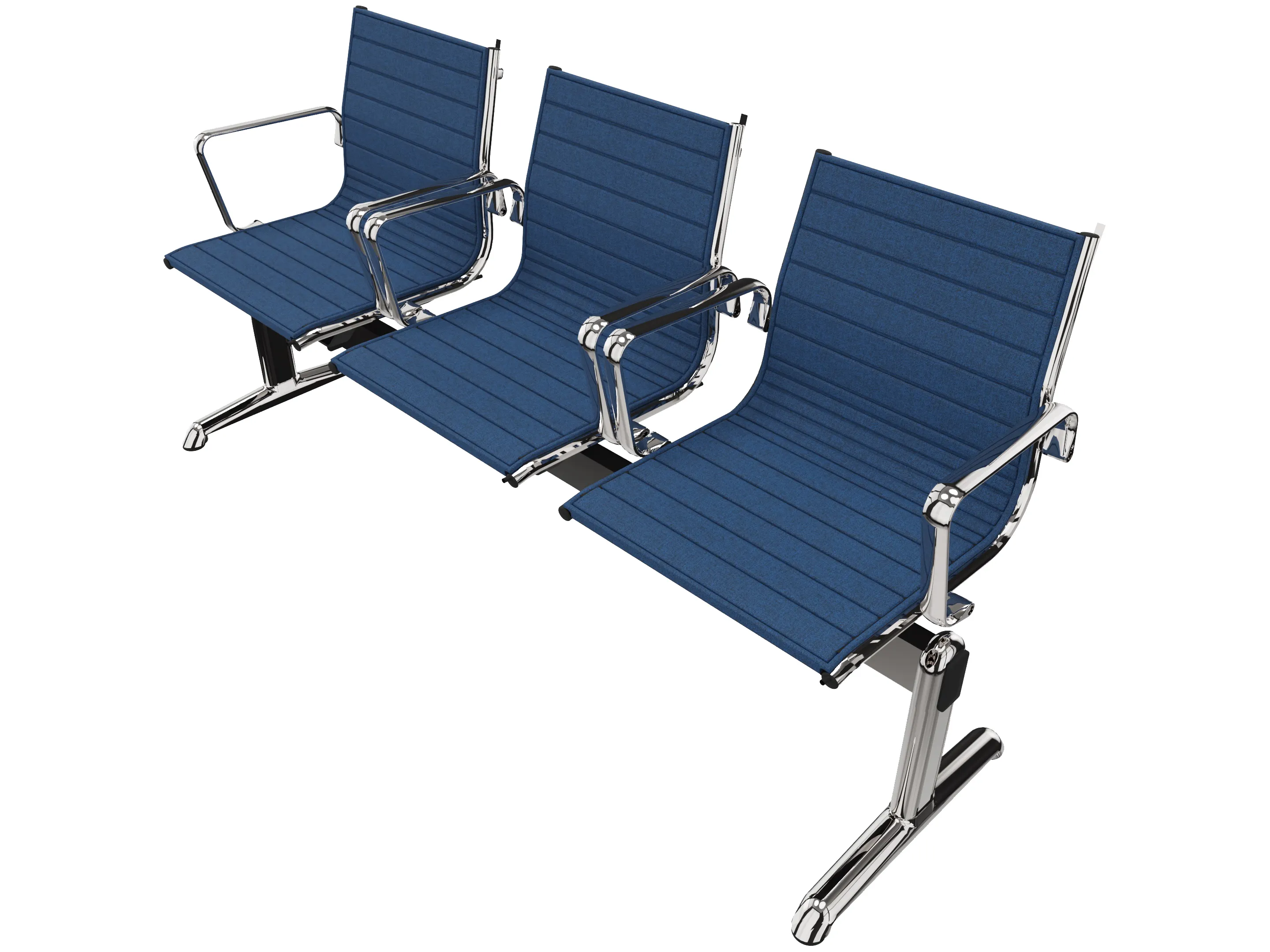 Wachtkamerbank in "ribbed" 3-zits uitvoering "ribbed", met 2 poten, en zonder armsteunen. Frame altijd verchroomd.