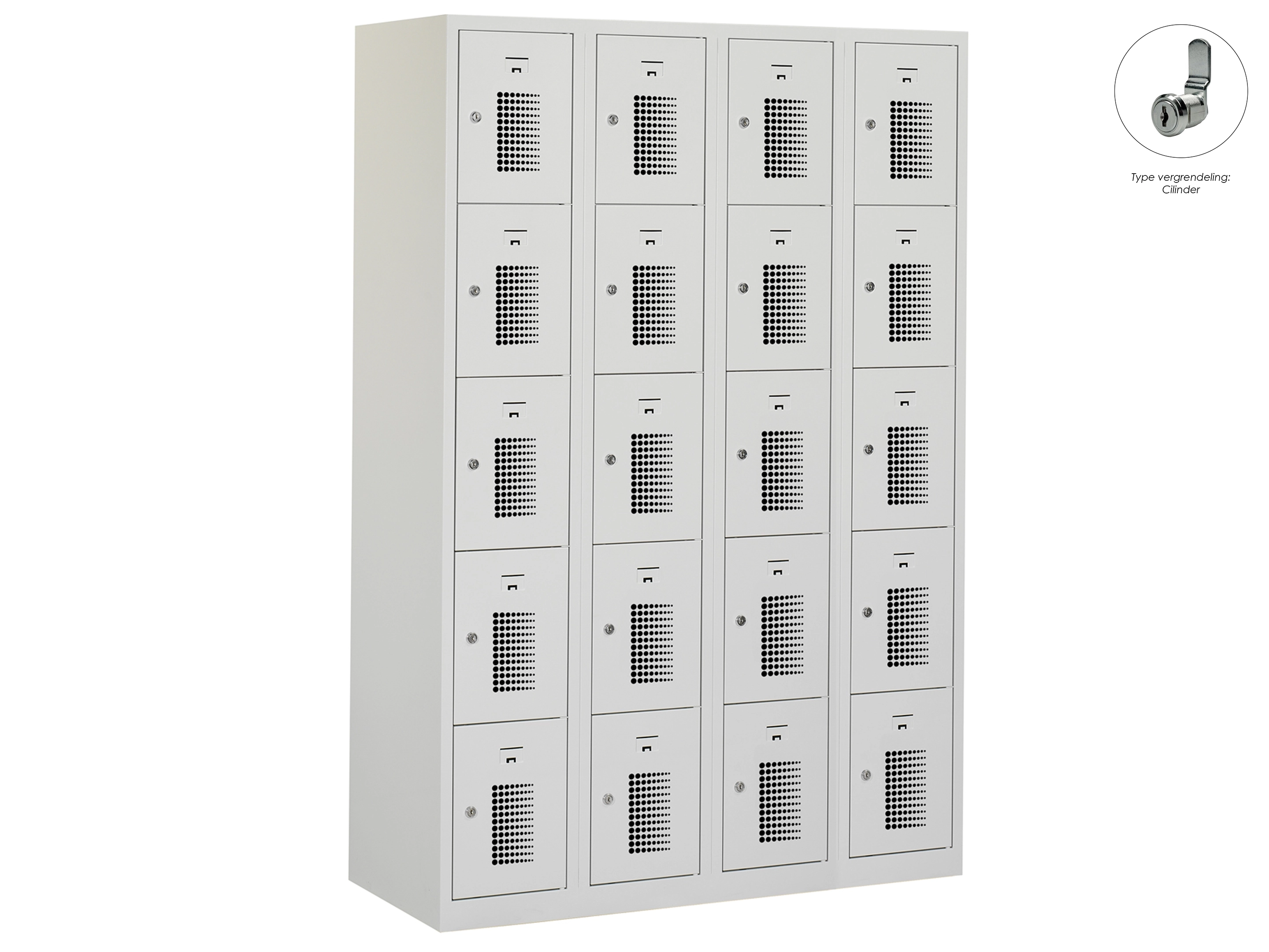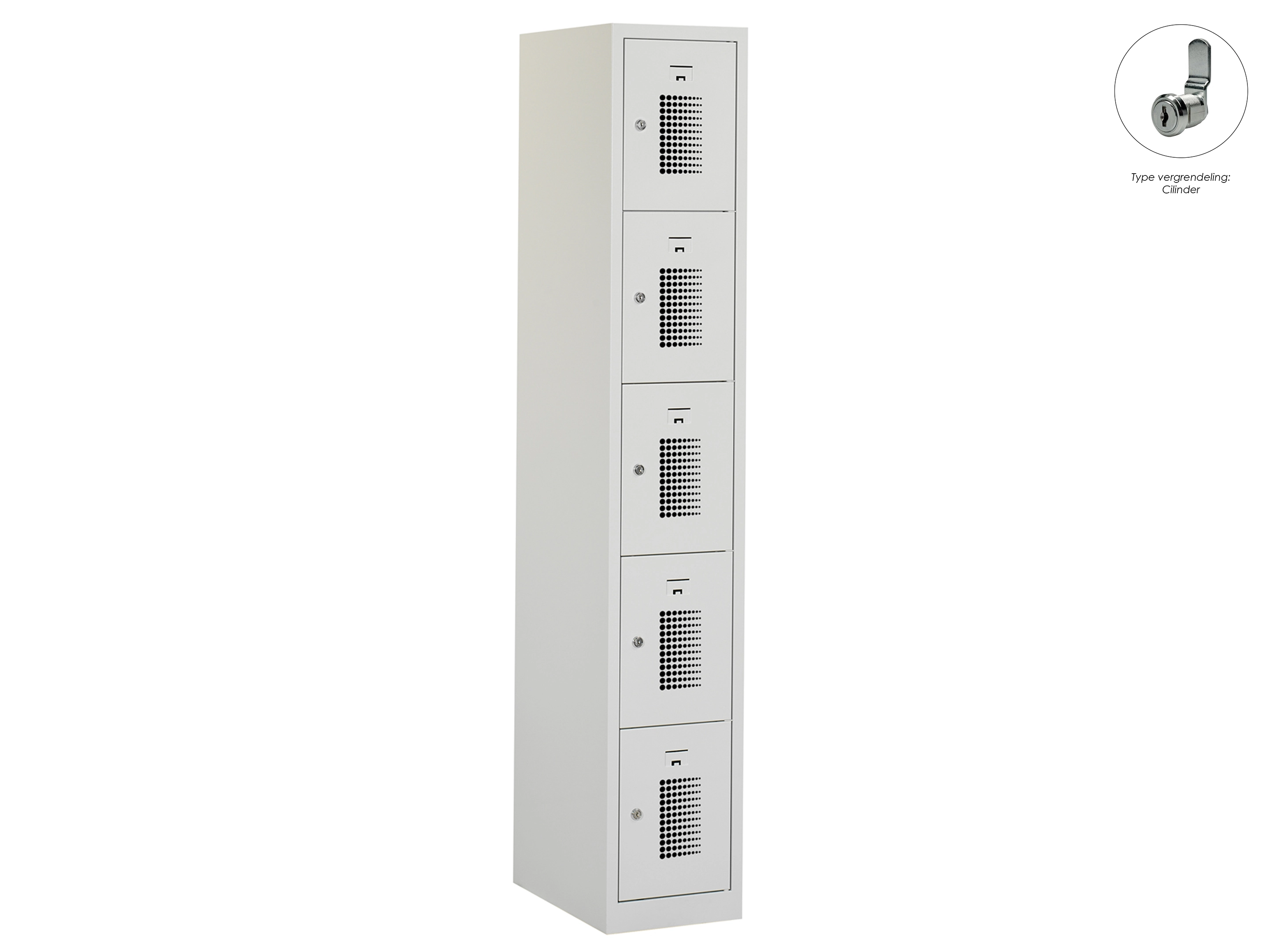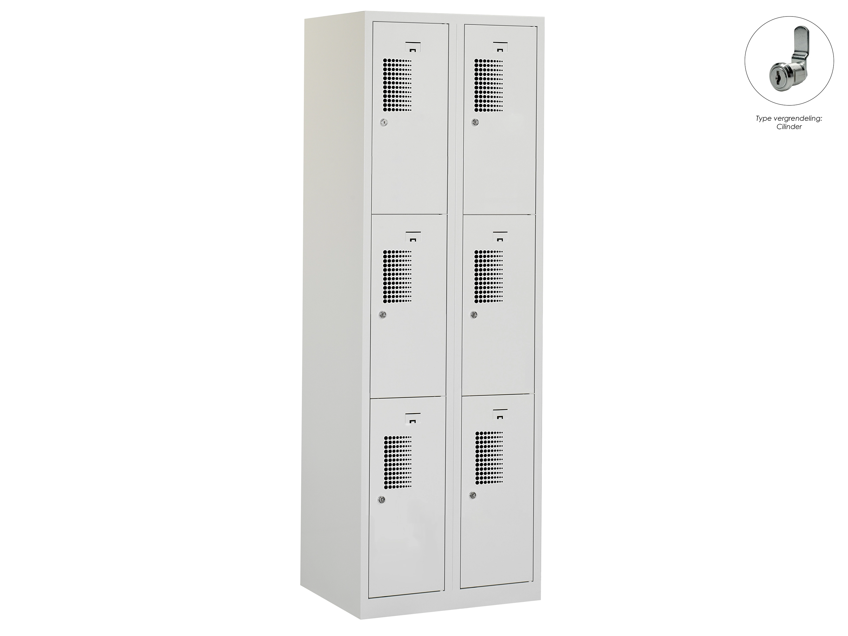Type deuren: gerperforeerd, type slot: cilinderslot. Kleur romp: grijs (RAL7035), kleur deuren: grijs (RAL7035) . Afmeting: 180x60x50 cm (HxBxD). Netto doorsteek: 321x212x468mm. Aantal sleutels per slot: 2.