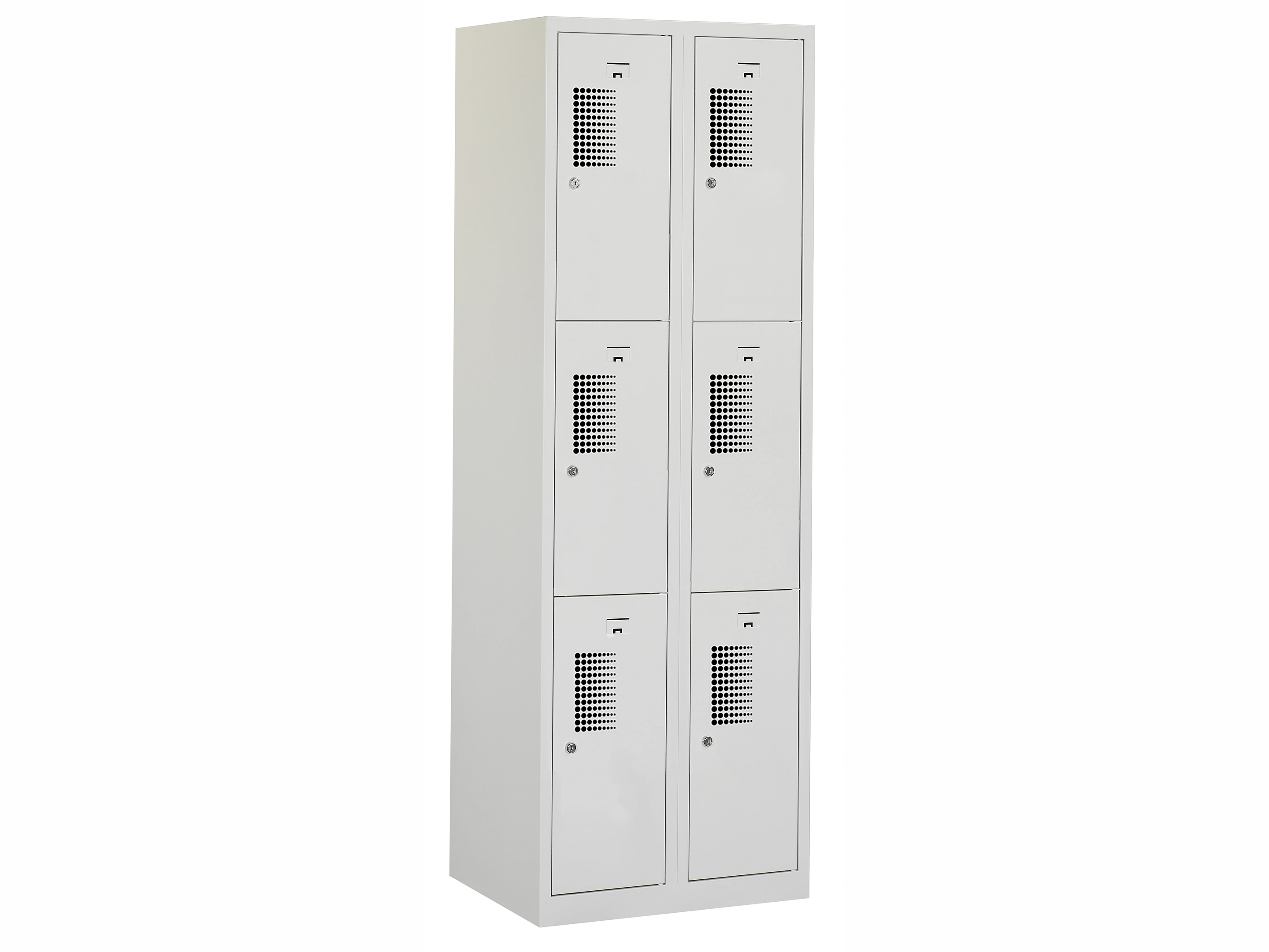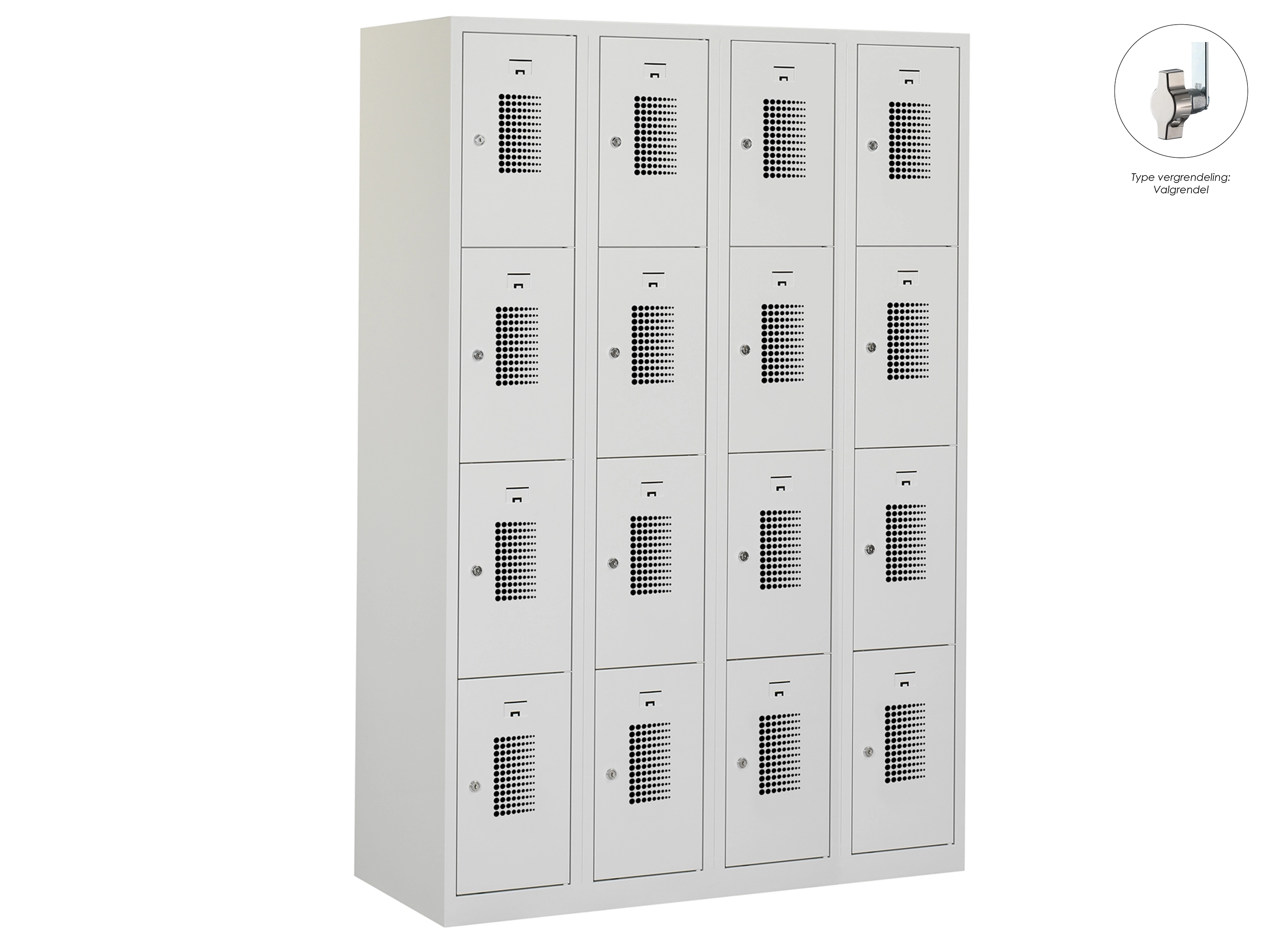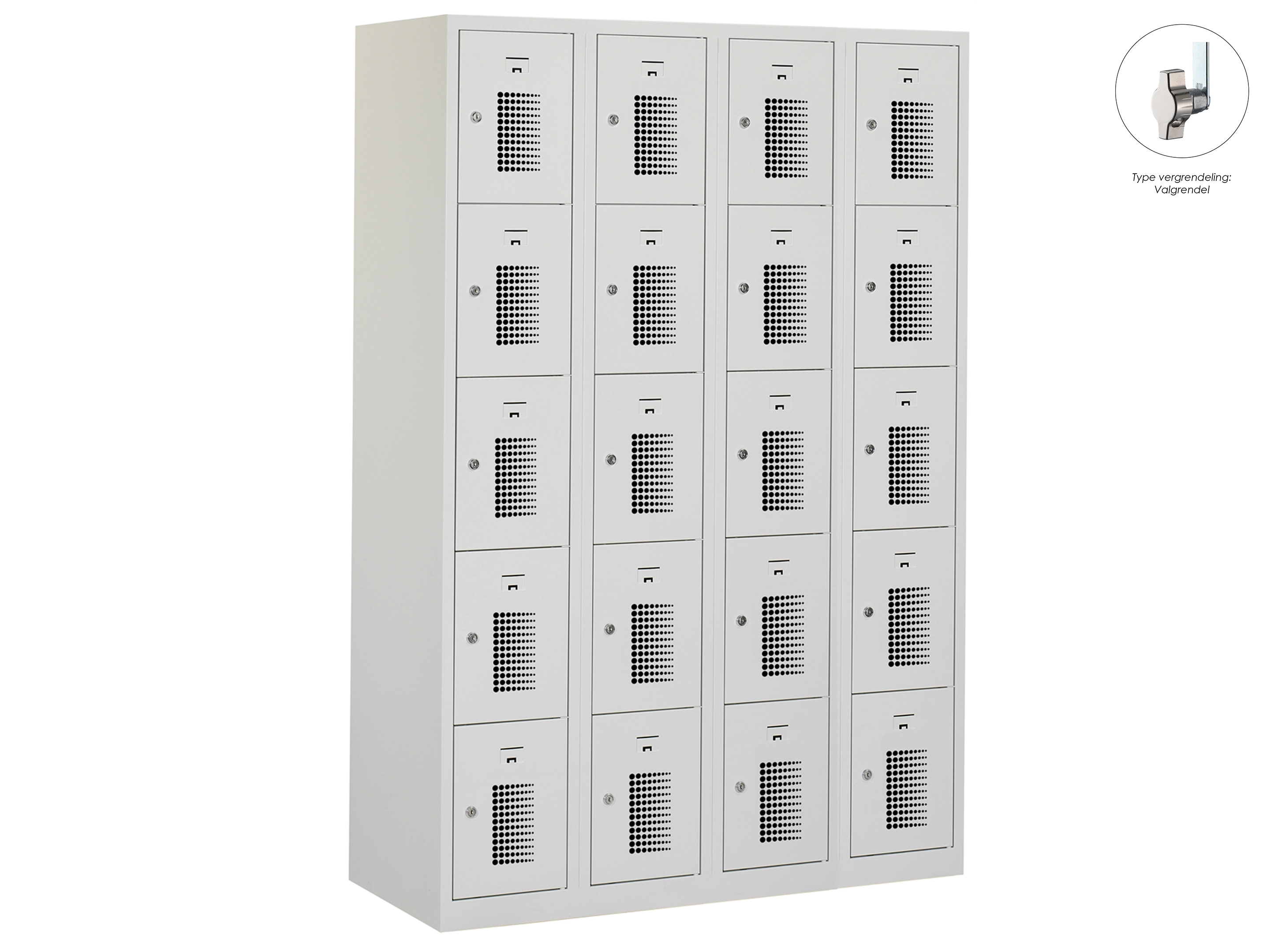 Type deuren: gerperforeerd, type slot: cilinderslot. Kleur romp: grijs (RAL7035), kleur deuren: grijs (RAL7035) . Afmeting: 180x60x50 cm (HxBxD). Netto doorsteek: 321x212x468mm. Aantal sleutels per slot: 2.