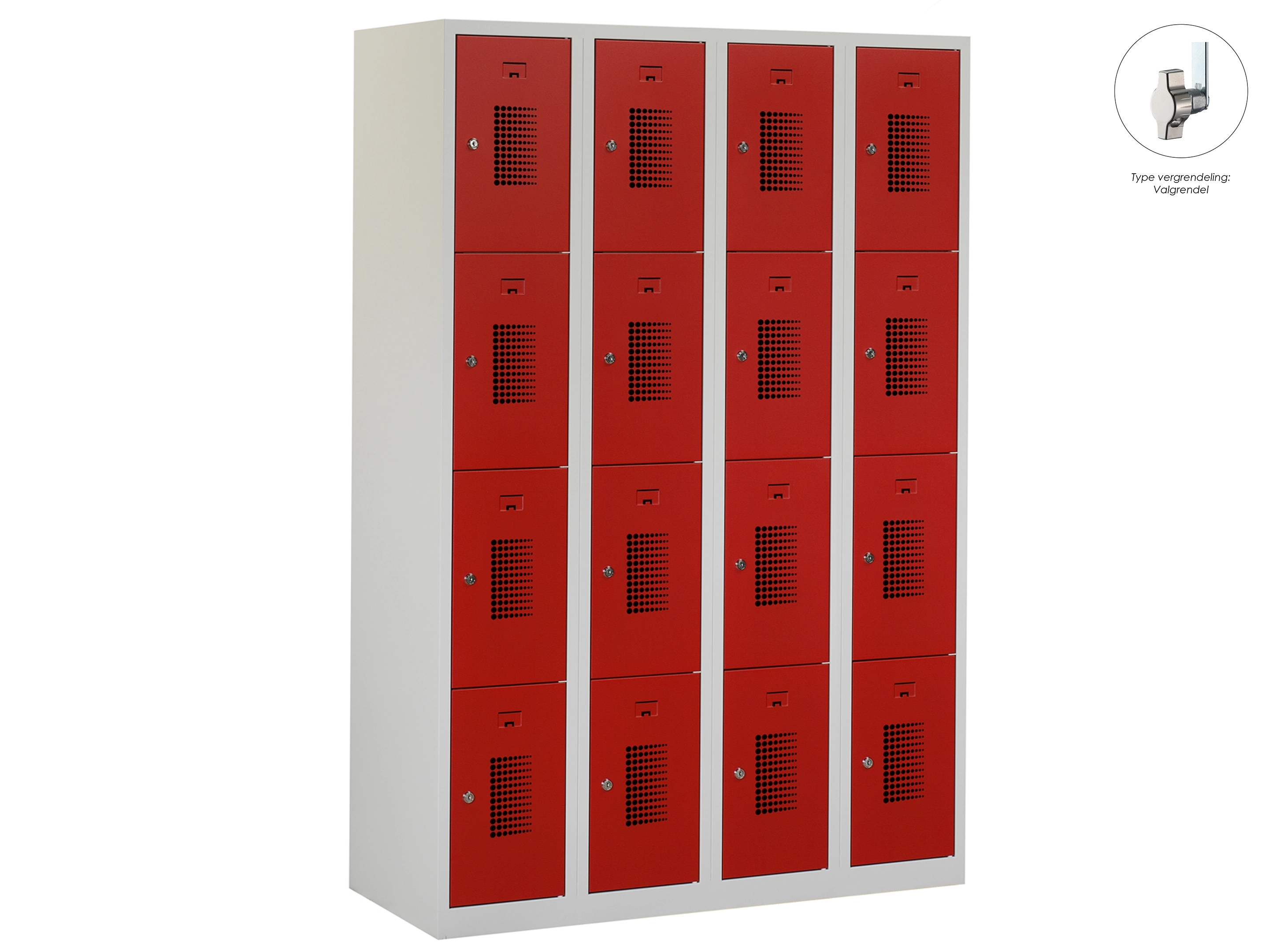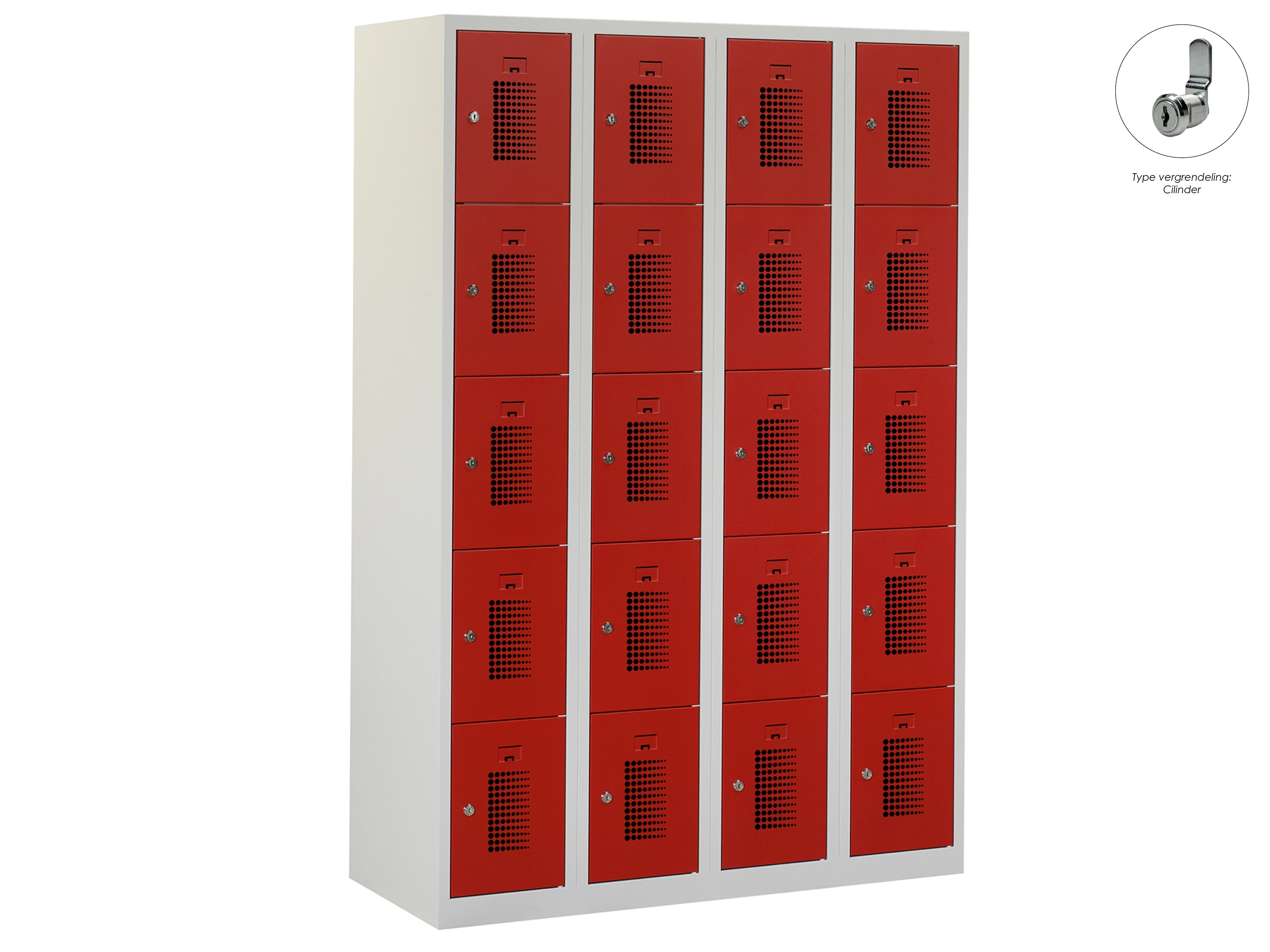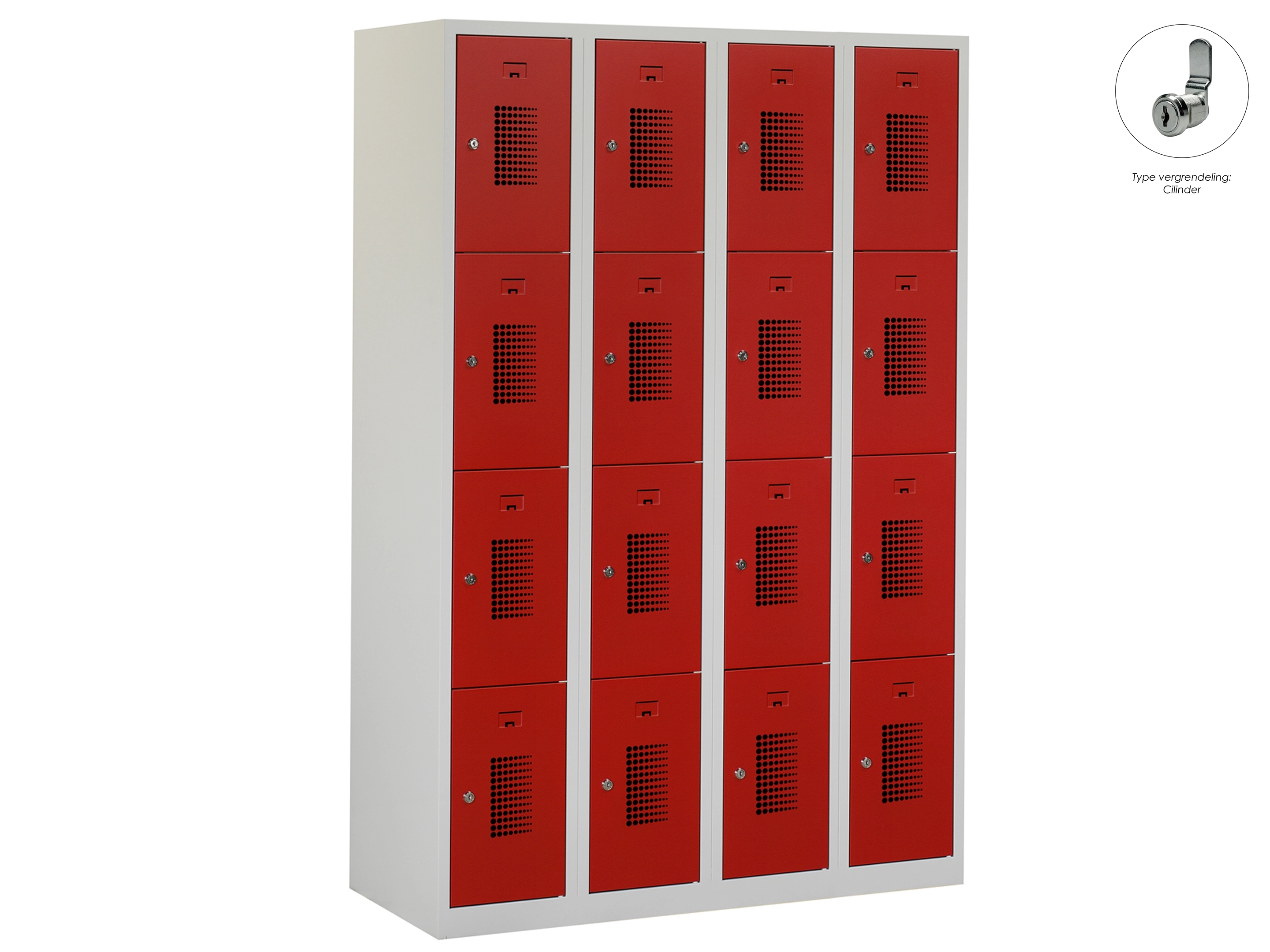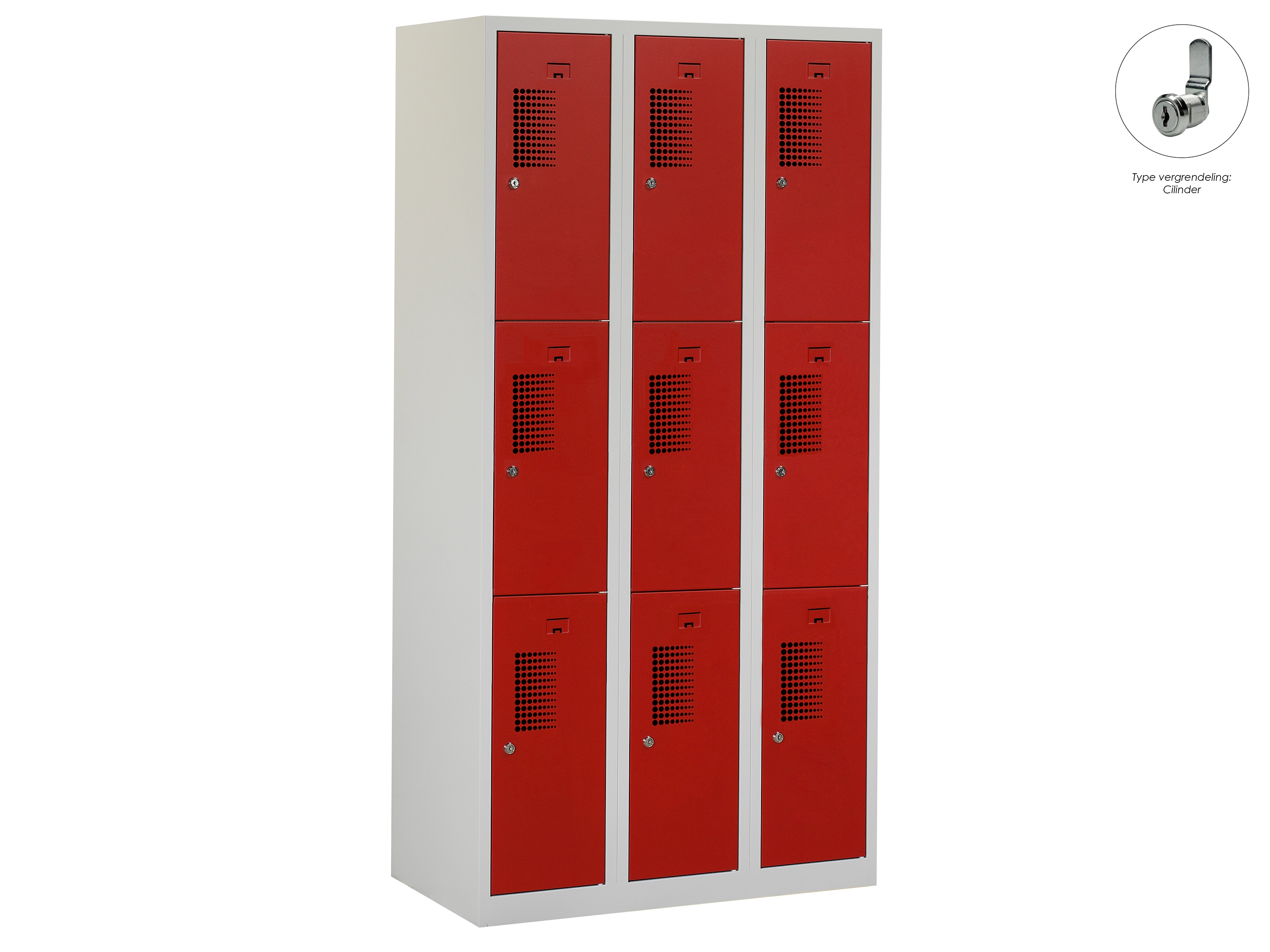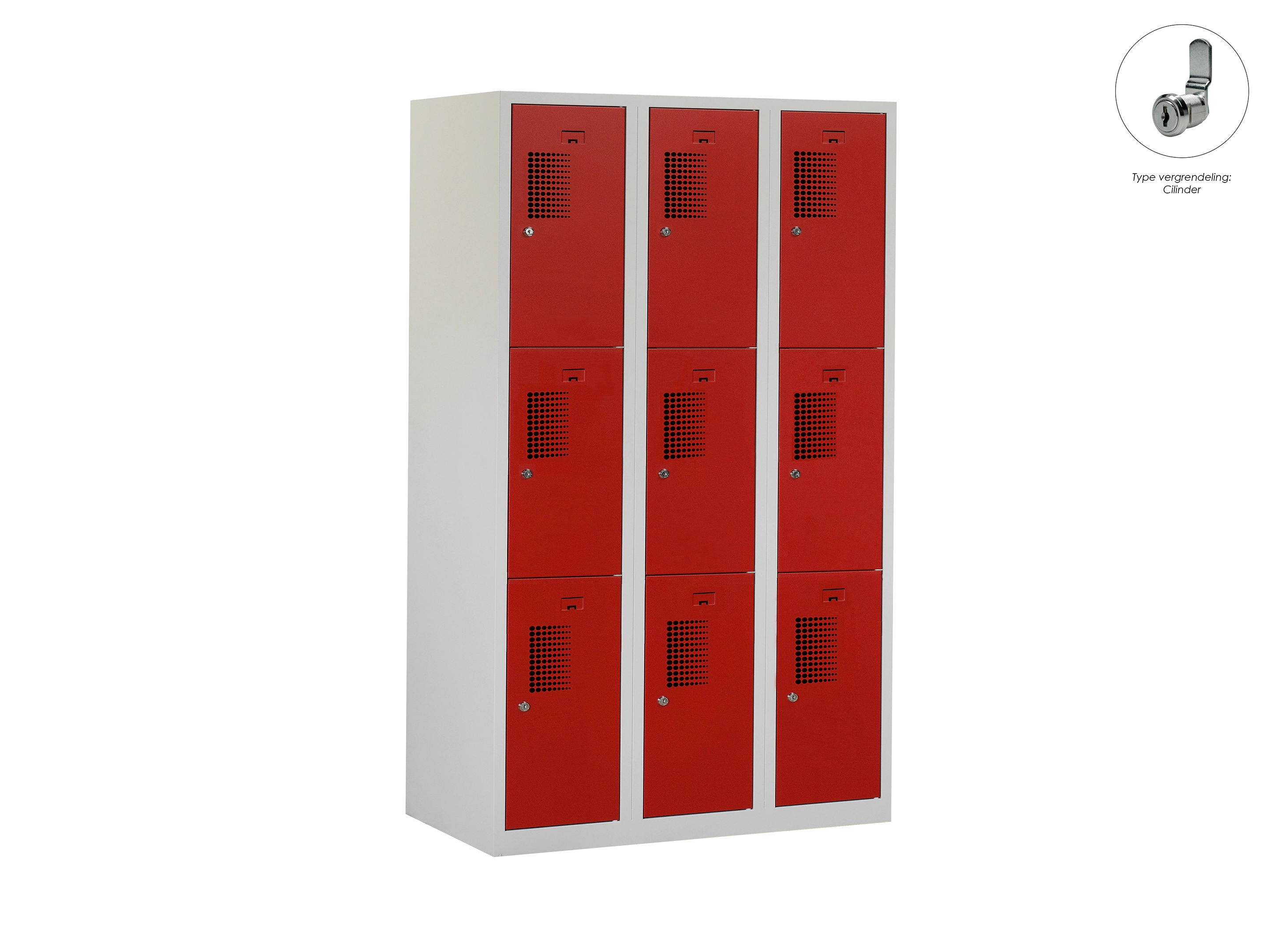 Type deuren: gerperforeerd, type slot: cilinderslot. Kleur romp: grijs (RAL7035), kleur deuren: rood (RAL3000) . Afmeting: 111,6x90x50 cm (HxBxD). Netto doorsteek: 321x212x468mm. Aantal sleutels per slot: 2.