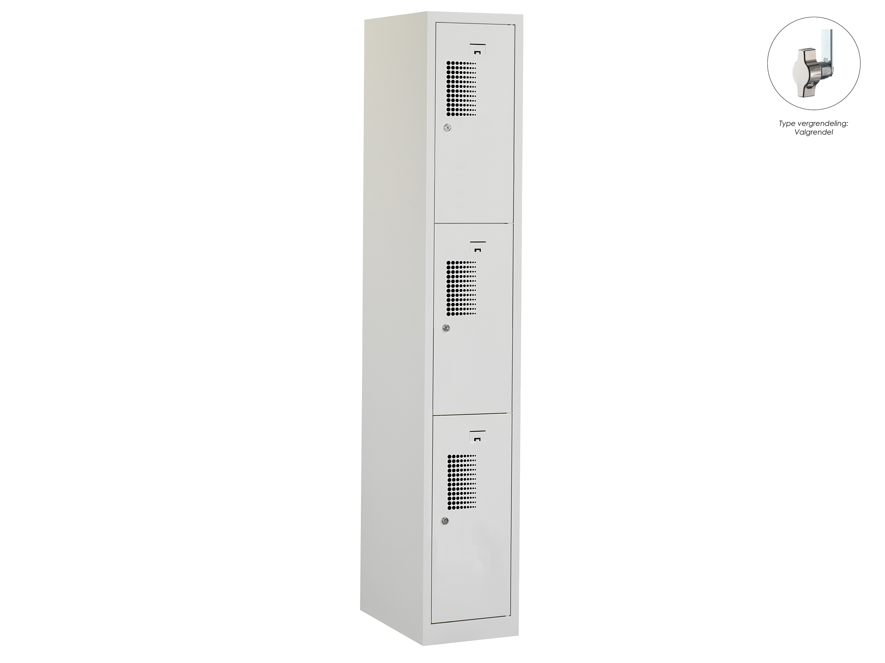 Type deuren: gerperforeerd, type slot: cilinderslot. Kleur romp: grijs (RAL7035), kleur deuren: grijs (RAL7035) . Afmeting: 180x30x50 cm (HxBxD). Netto doorsteek: 549x212x468mm. Aantal sleutels per slot: 2.