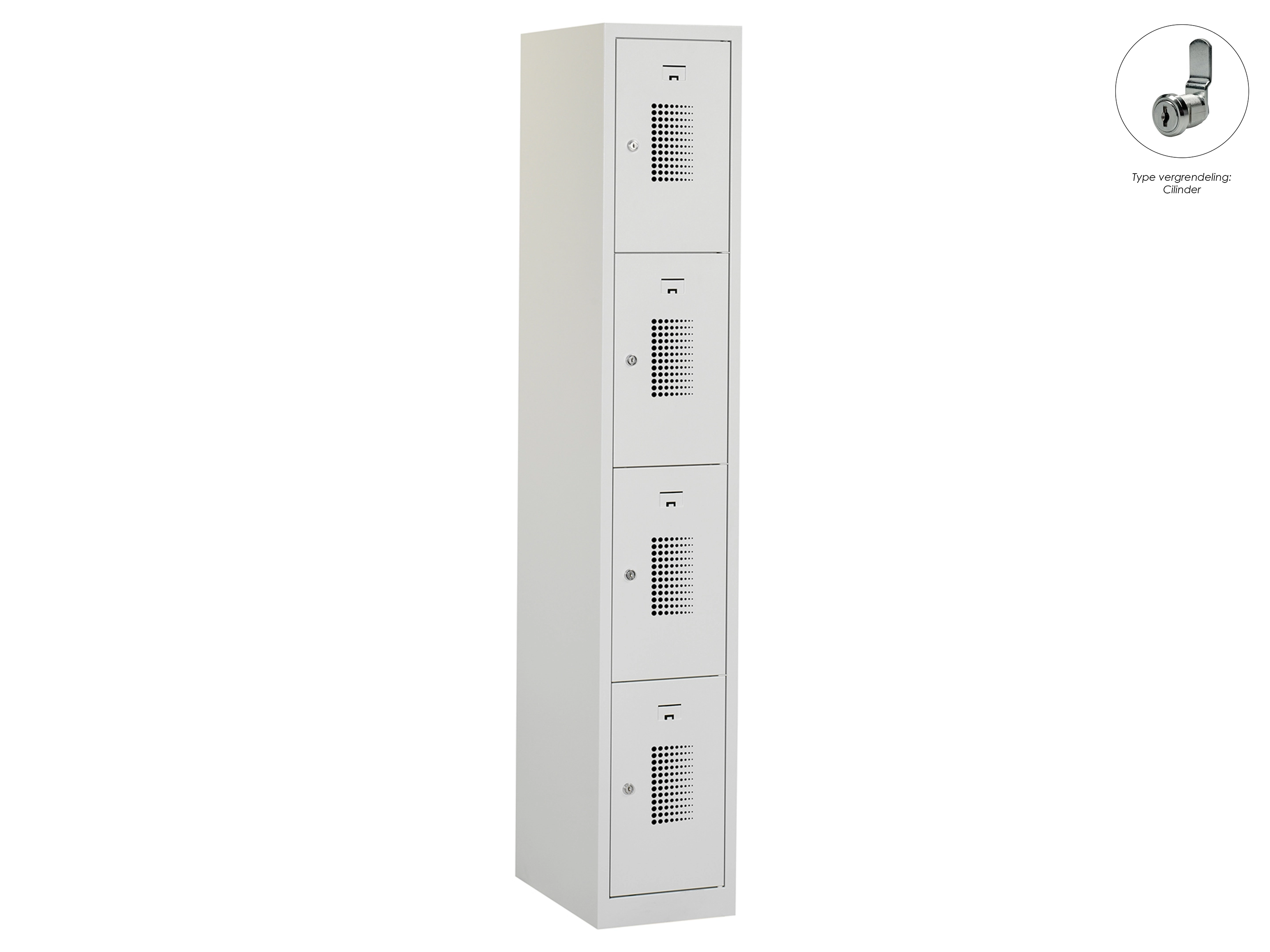 Type deuren: gerperforeerd, type slot: cilinderslot. Kleur romp: grijs (RAL7035), kleur deuren: grijs (RAL7035) . Afmeting: 180x30x50 cm (HxBxD). Netto doorsteek: 407x212x468mm. Aantal sleutels per slot: 2.