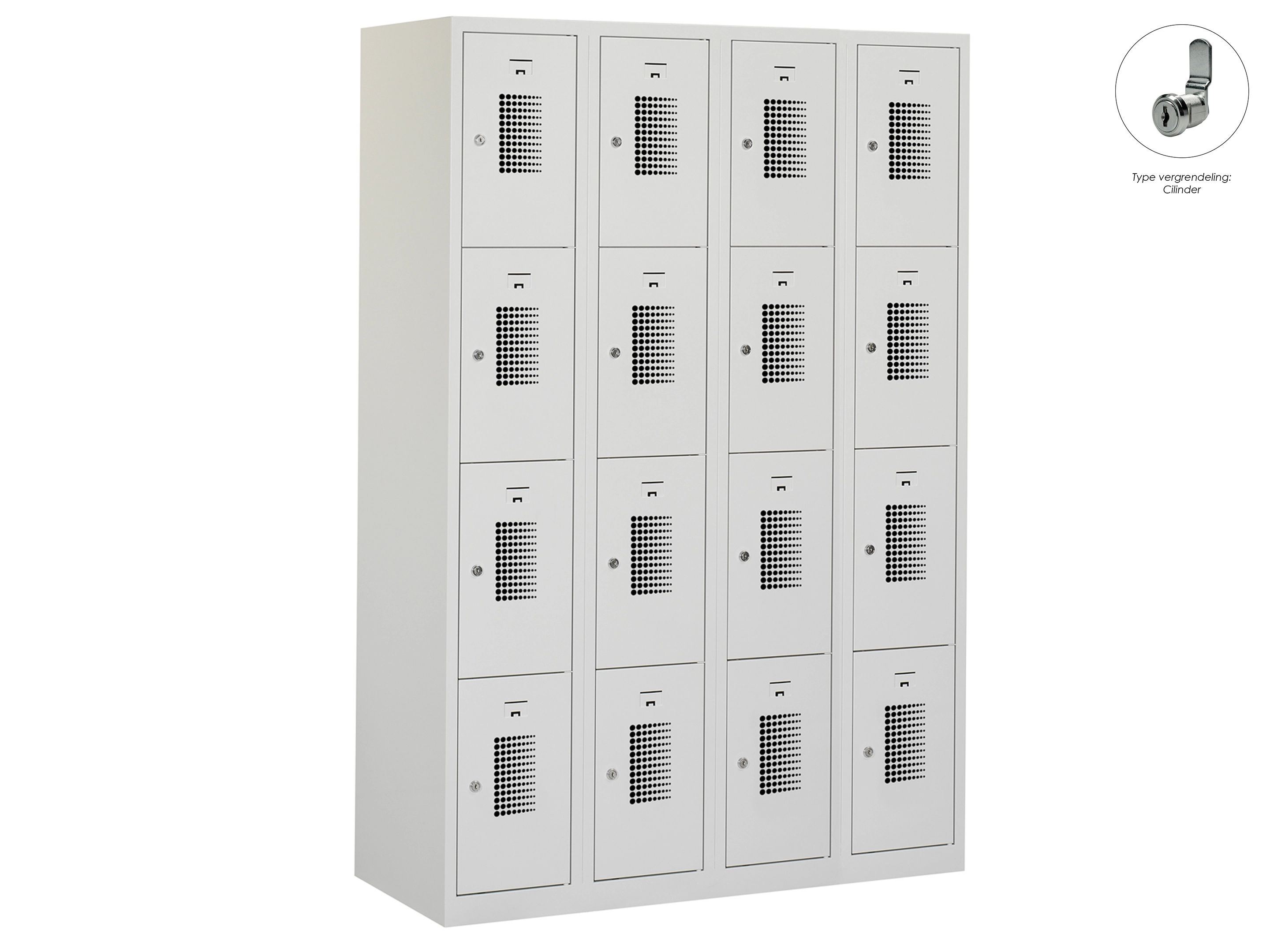 Type deuren: gerperforeerd, type slot: cilinderslot. Kleur romp: grijs (RAL7035), kleur deuren: grijs (RAL7035) . Afmeting: 111,6x90x50 cm (HxBxD). Netto doorsteek: 321x212x468mm. Aantal sleutels per slot: 2.
