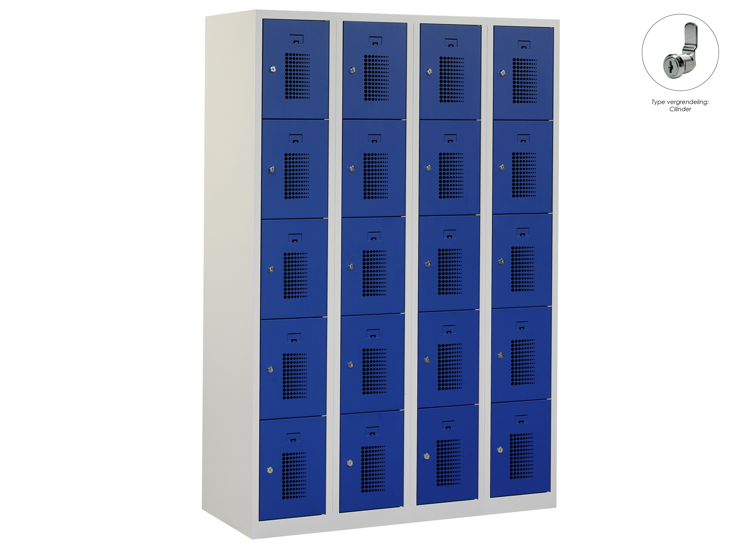 Type deuren: gerperforeerd, type slot: cilinderslot. Kleur romp: grijs (RAL7035), kleur deuren: blauw (RAL5010) . Afmeting: 111,6x90x50 cm (HxBxD). Netto doorsteek: 321x212x468mm. Aantal sleutels per slot: 2.