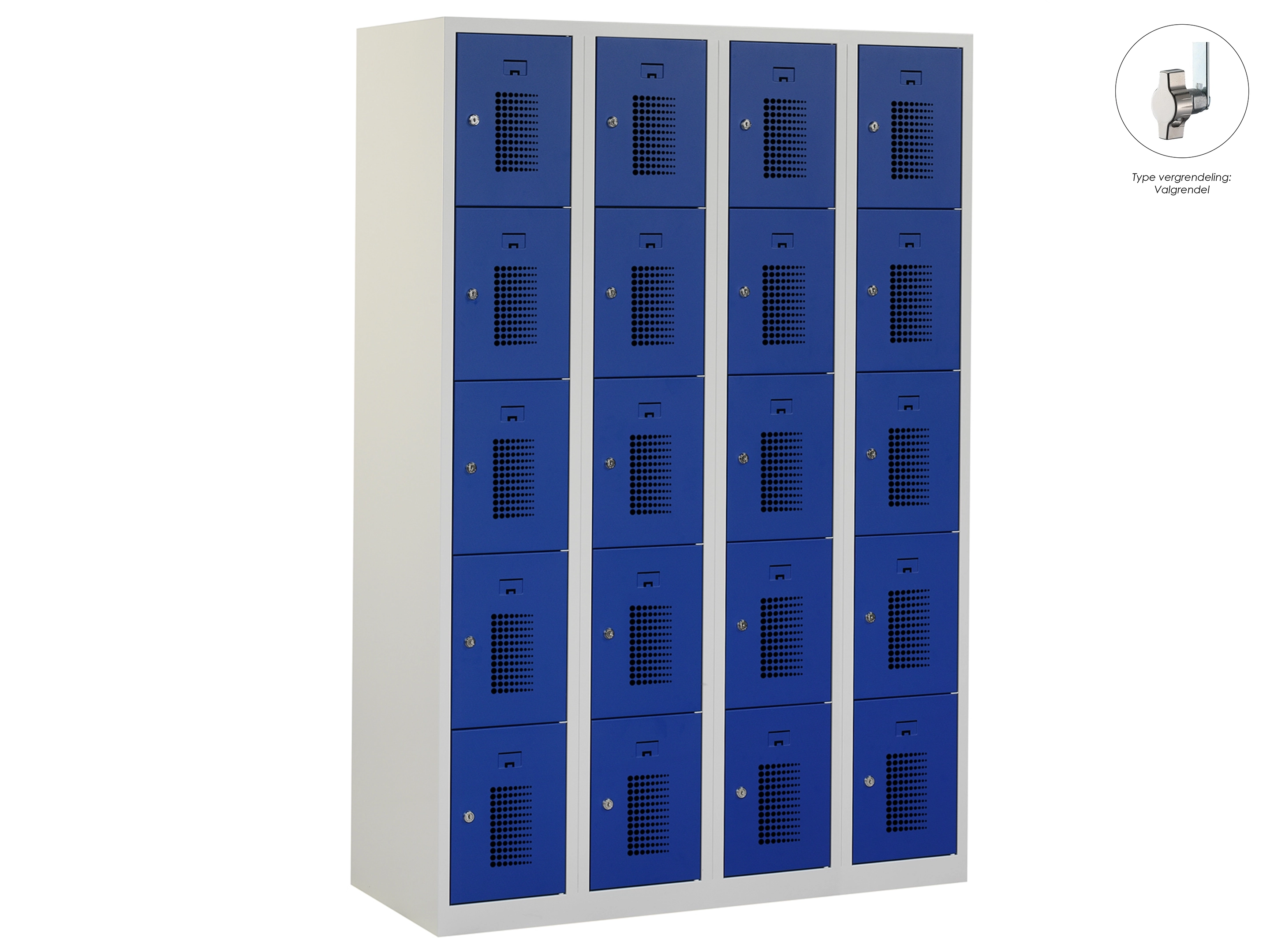 Type deuren: gerperforeerd, type slot: cilinderslot. Kleur romp: grijs (RAL7035), kleur deuren: blauw (RAL5010) . Afmeting: 180x60x50 cm (HxBxD). Netto doorsteek: 321x212x468mm. Aantal sleutels per slot: 2.