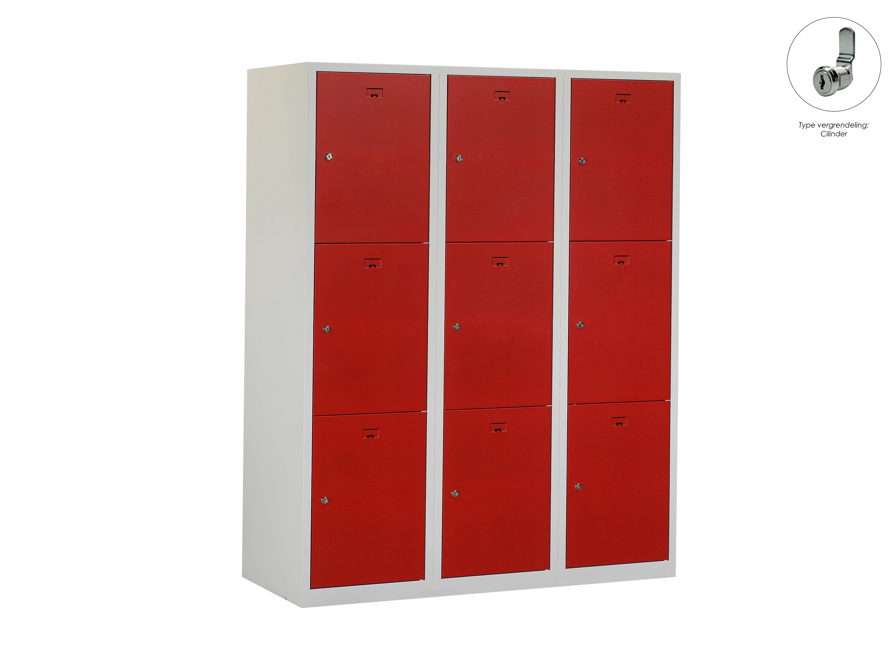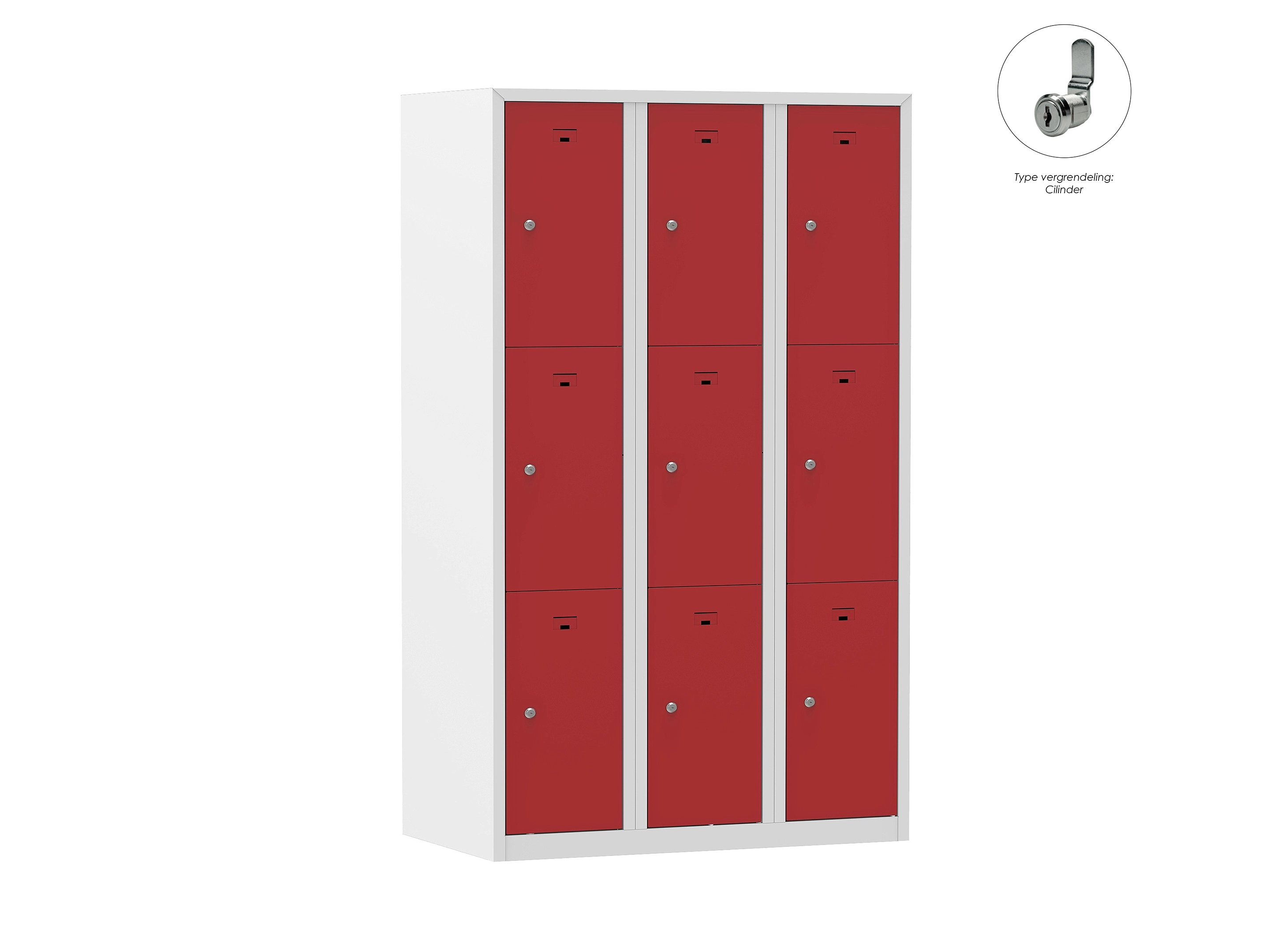 Locker PH - 3 kolomen, 9 deuren, 111,6x90x50 cm, grijs/rood, cilinder