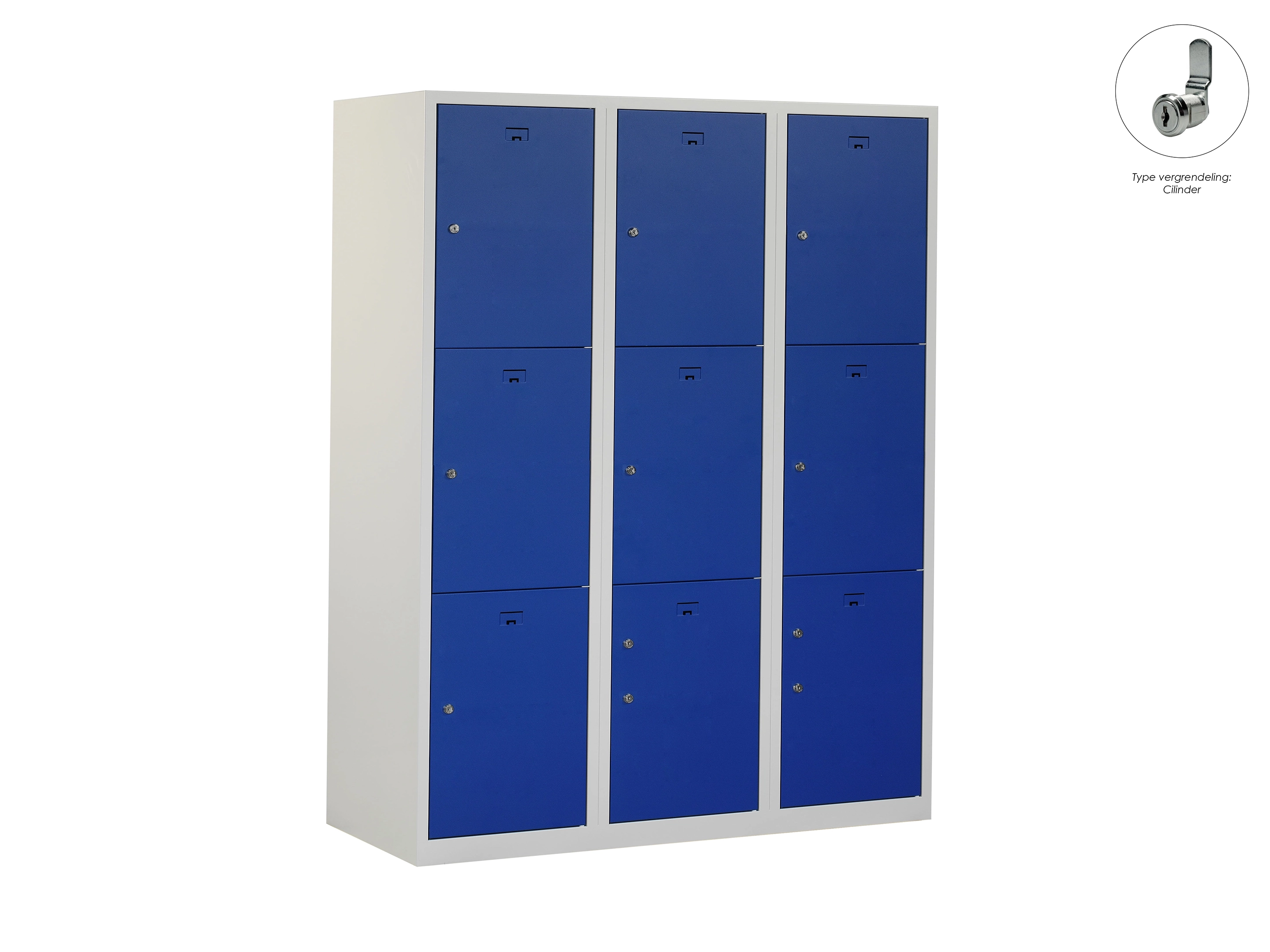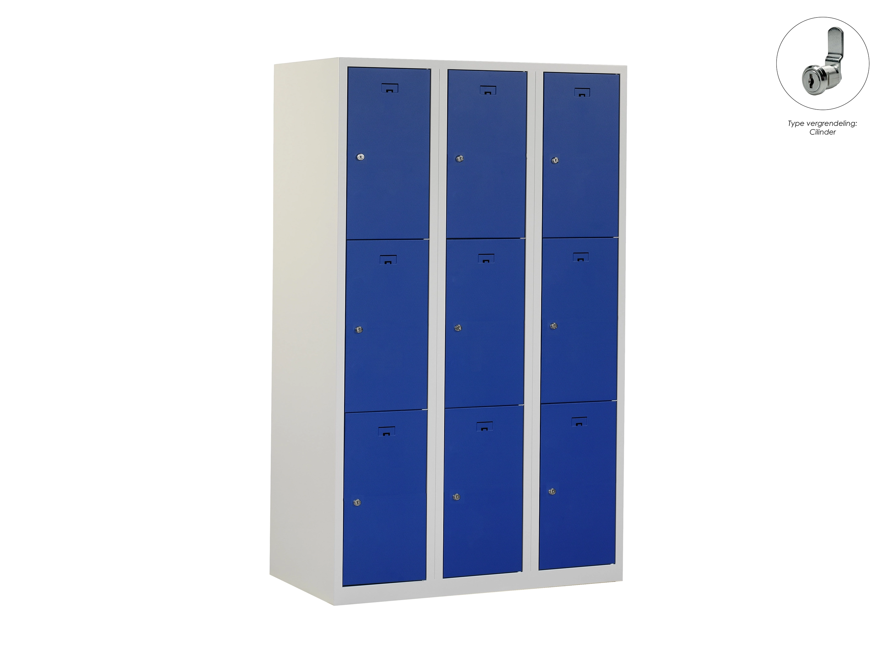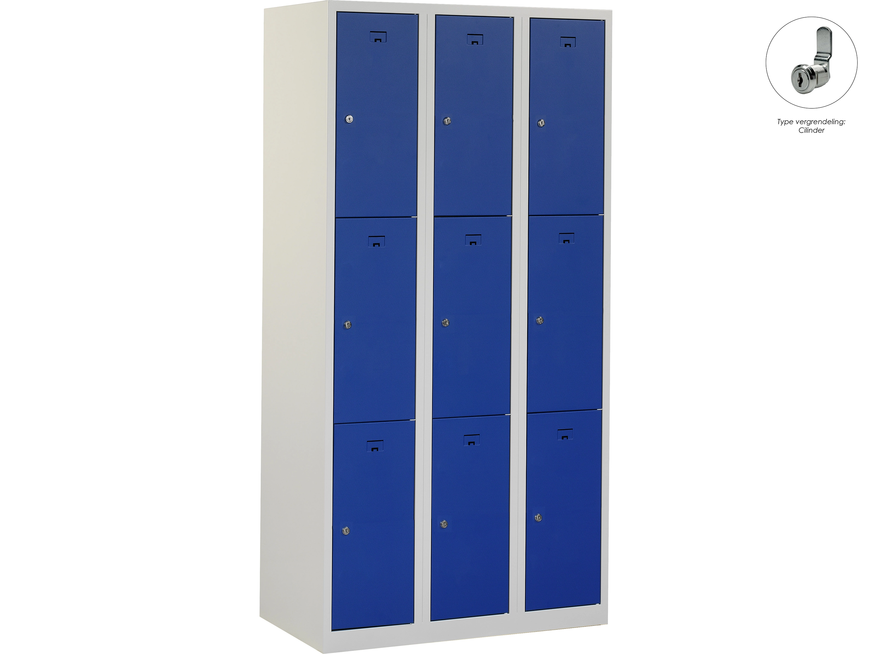 Locker PH - 3 kolomen, 9 deuren, 111,6x90x50 cm, grijs/blauw, cilinder
