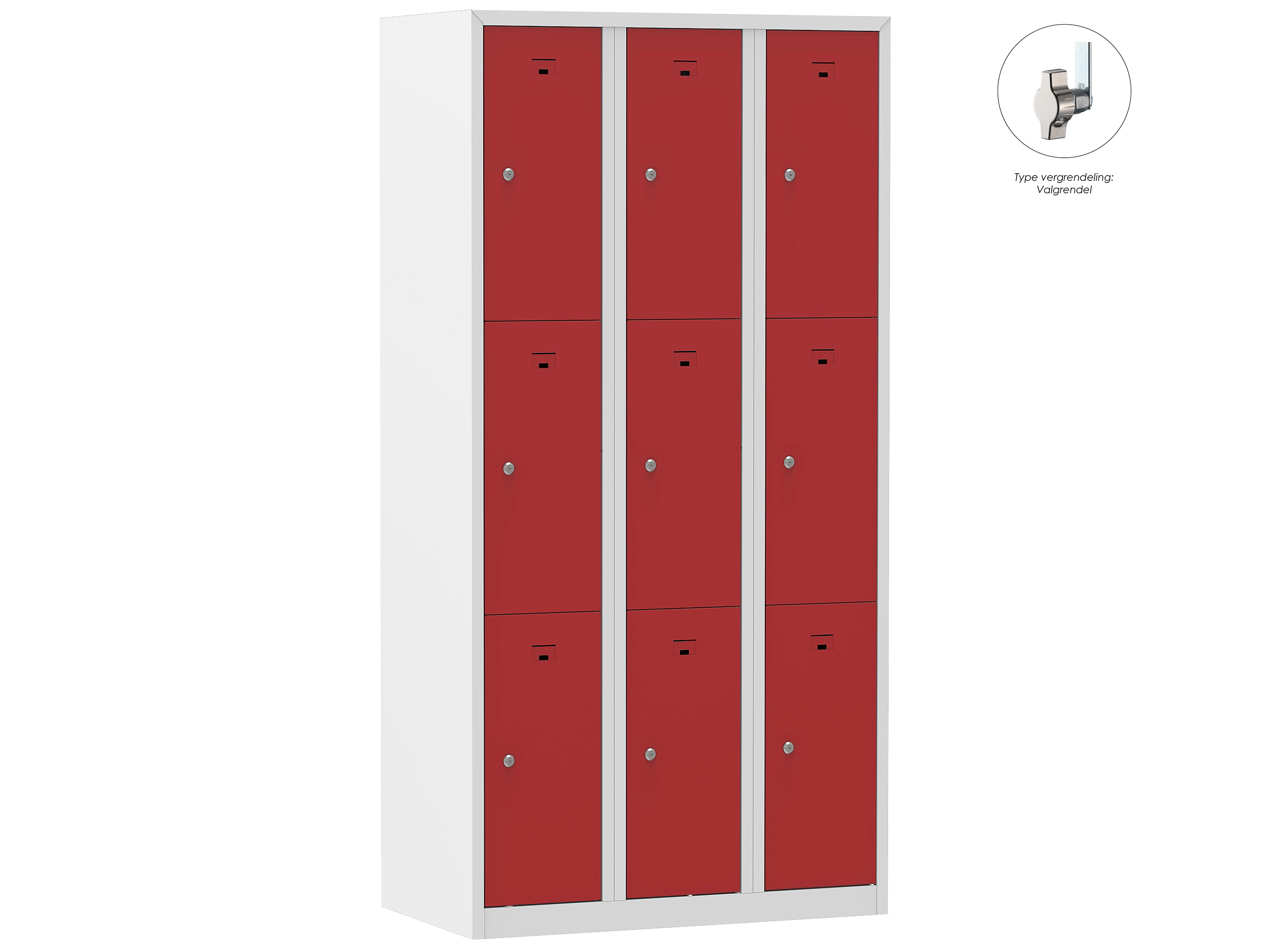 Locker PH - 3 kolomen, 9 deuren, 111,6x90x50 cm, grijs/rood, valgrendel