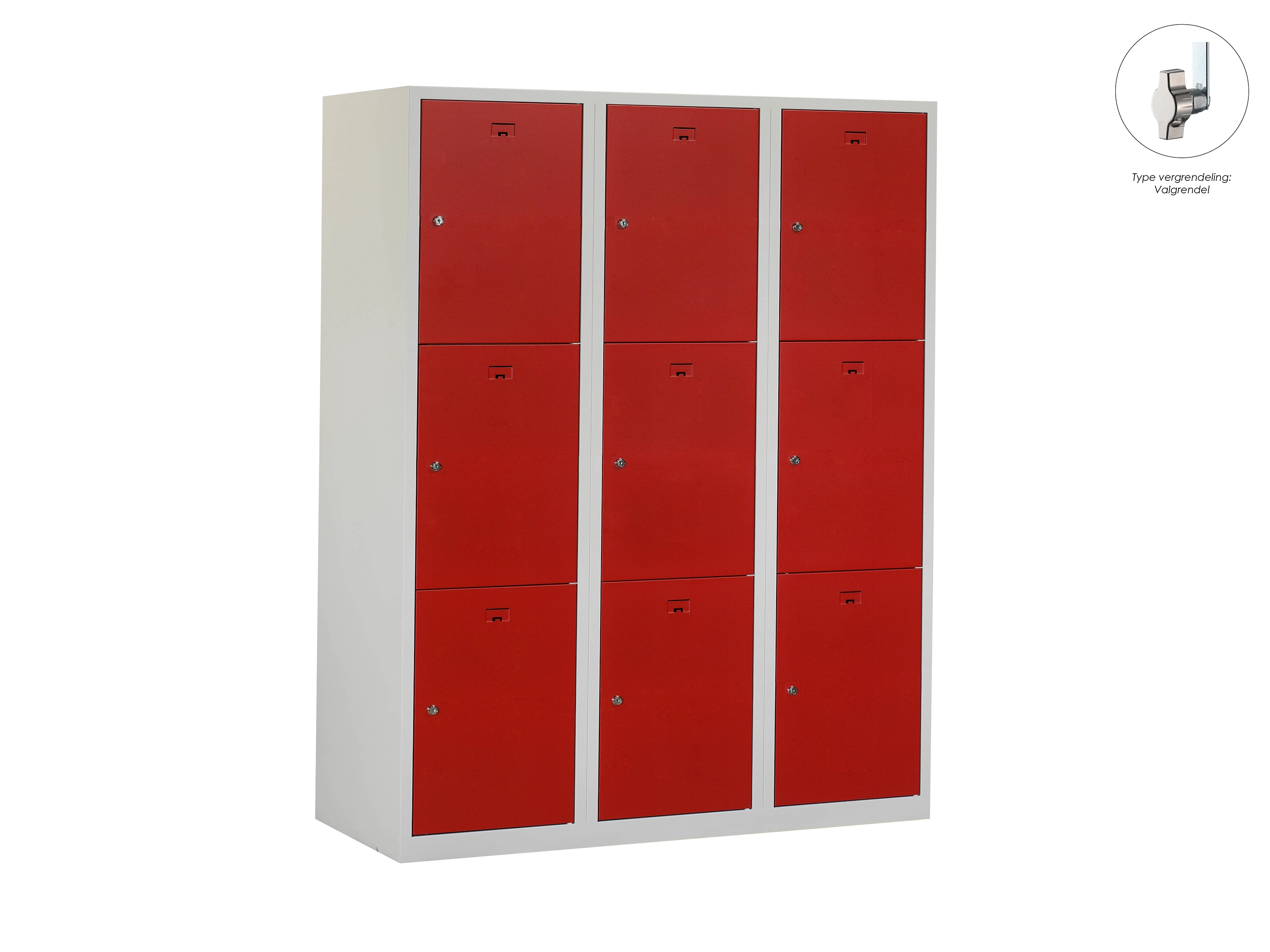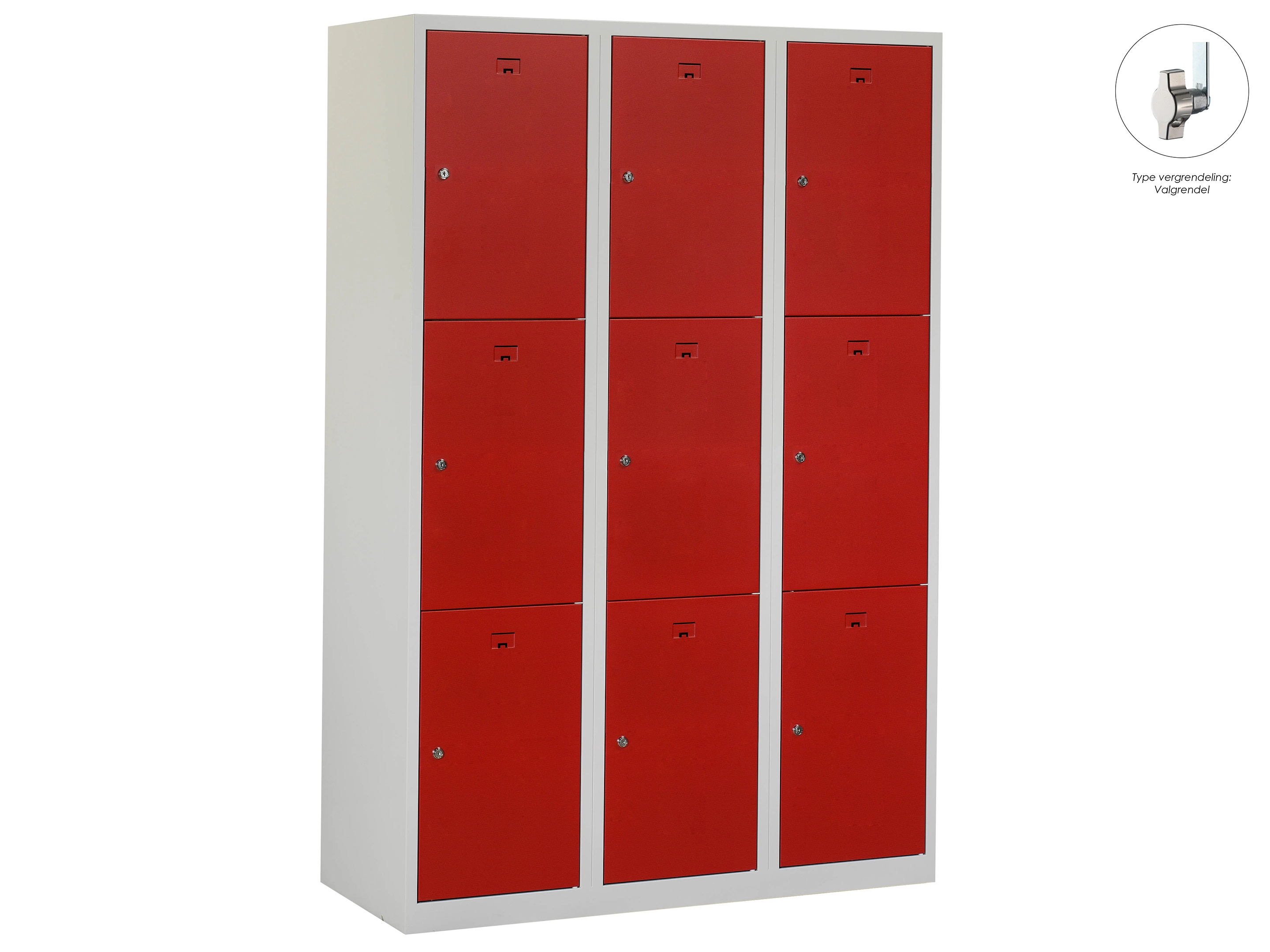 Locker PH - 3 kolomen, 9 deuren, 180x120x50 cm, grijs/rood, valgrendel